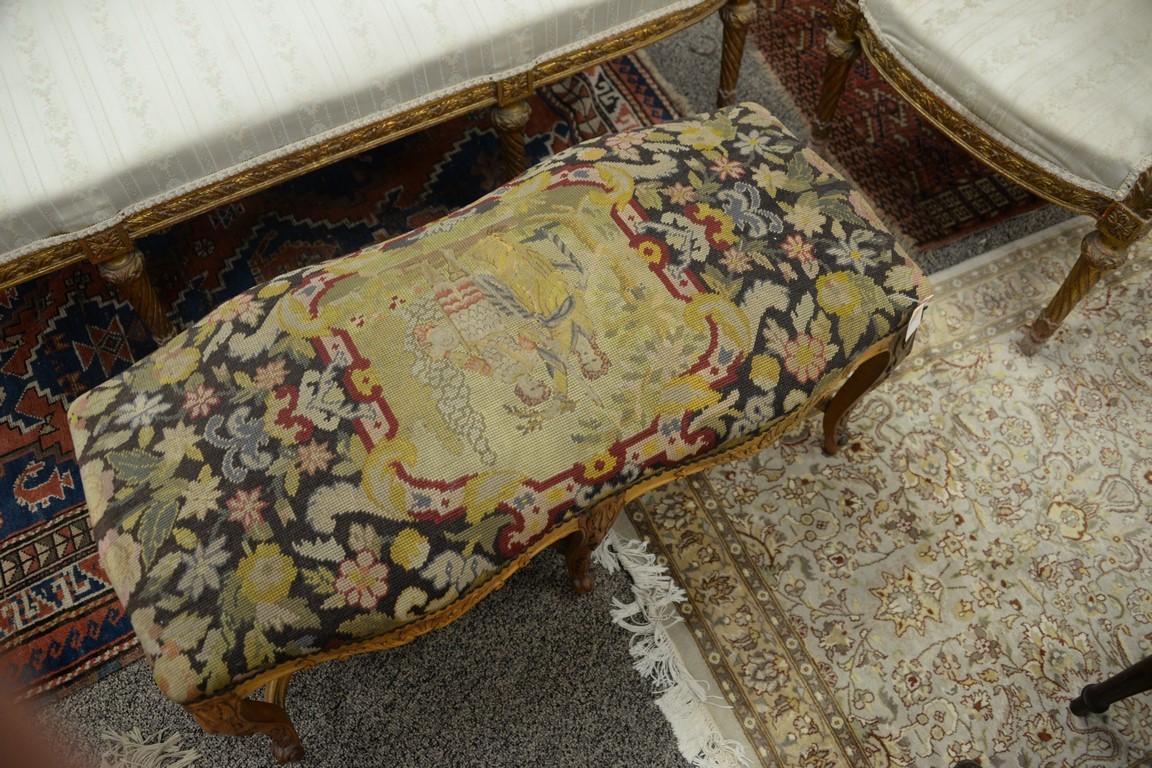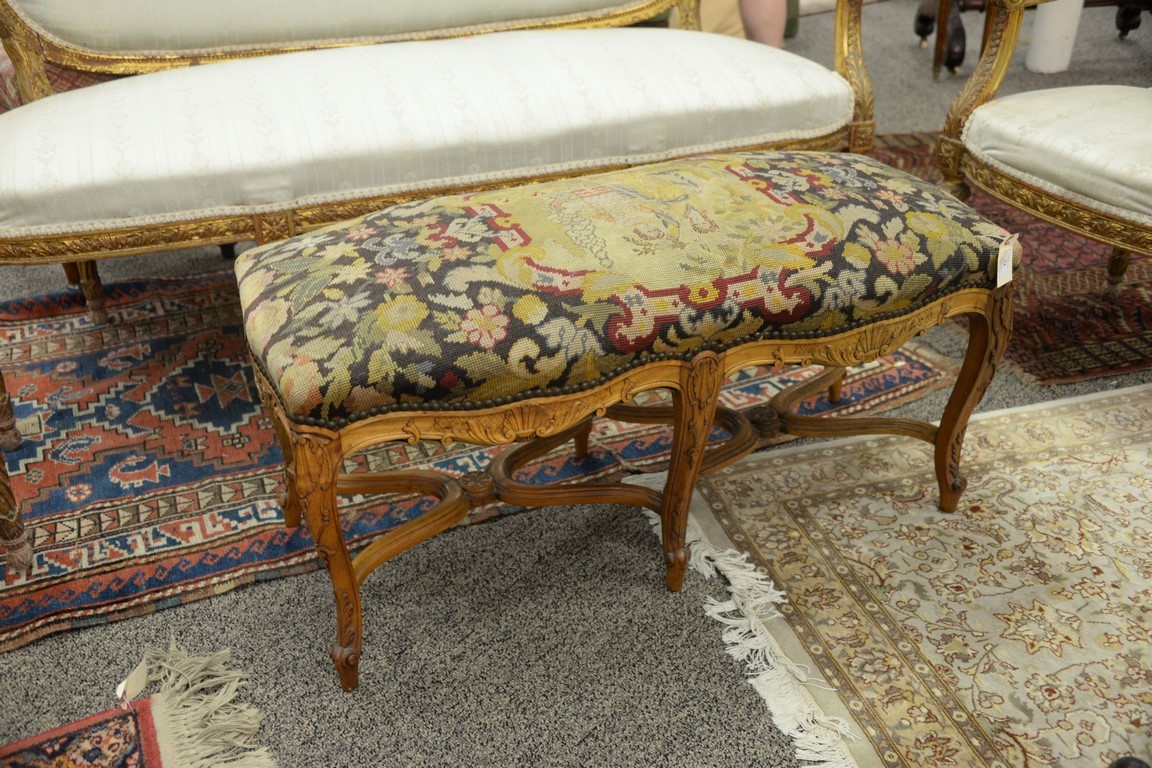 Lot 34: Louis XV style bench with needlepoint and petit point upholstered top slight separation in center ht. 20in., top: 38 x 18