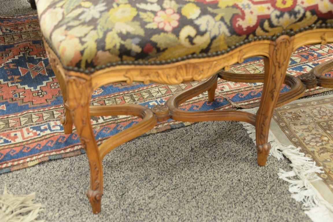 Louis XV style bench with needlepoint and petit point upholstered top slight separation in center ht. 20in., top: 38 x 18