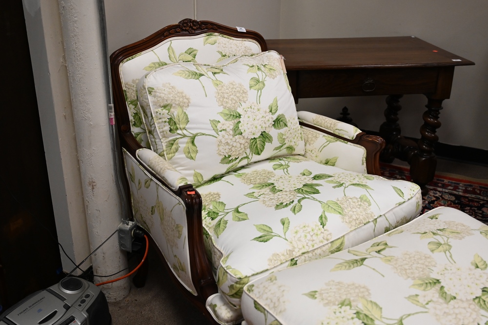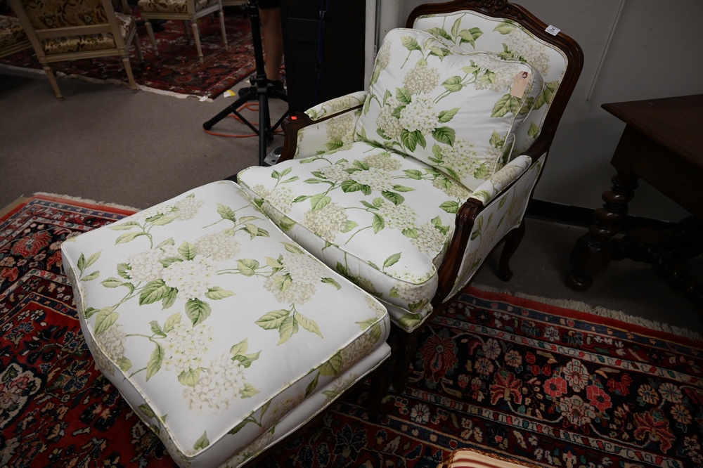 Louis XV Style Fauteuil and Ottoman, each having floral upholstery and carved frames, height 38 inches, width 32 inches.
