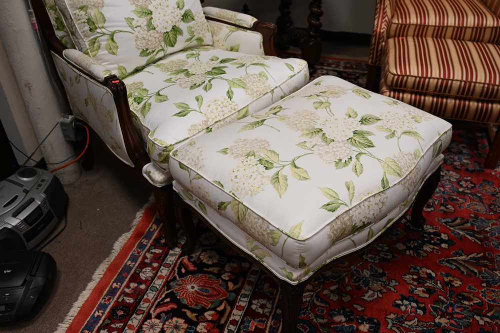 Lot 34: Louis XV Style Fauteuil and Ottoman, each having floral upholstery and carved frames, height 38 inches, width 32 inches.