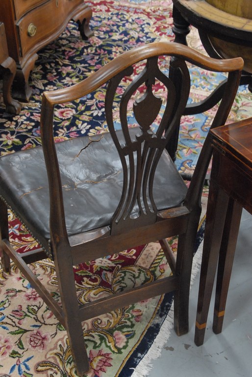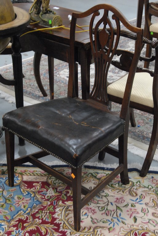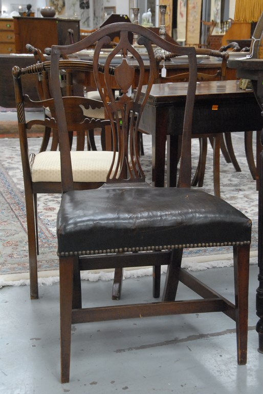 Pair of Federal mahogany side chairs, Connecticut State House type, having urn and pierced carved back over upholstered leather seats, all set on square tapered legs. ht. 38in. seat ht. 17in.