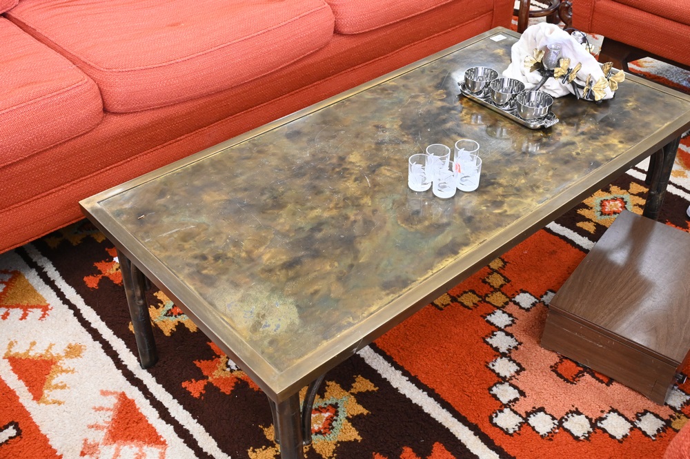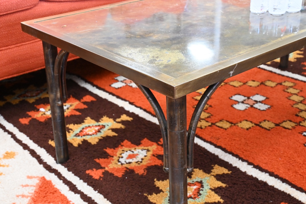 Lot 34: Philip and Kelvin Laverne Coffee Table, having rectangular bronze top on round legs and supportive stretchers, height 17 1/2 inches, top 48″ x 24″.