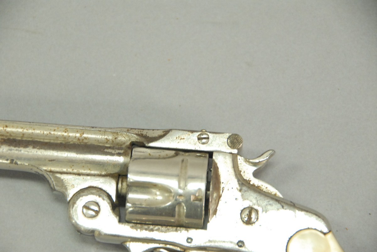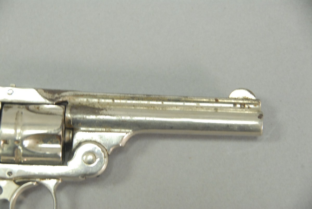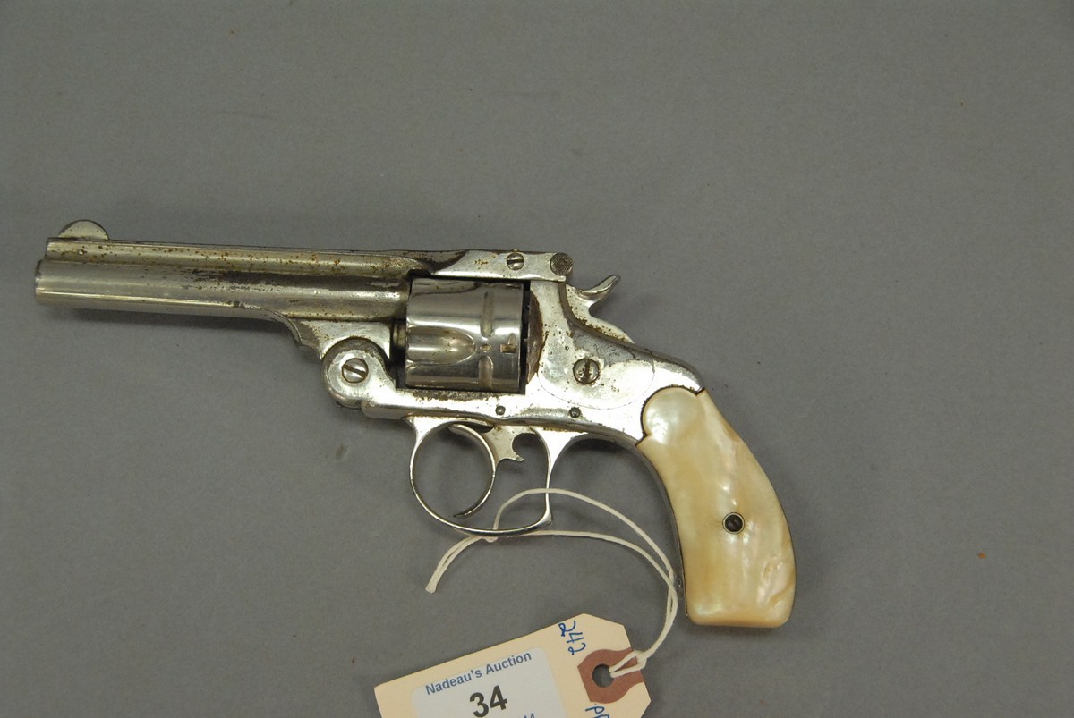 Smith & Wesson tip up revolver, .38 caliber nickel plated with pearl grips, 4 barrel. 242 SN-90088