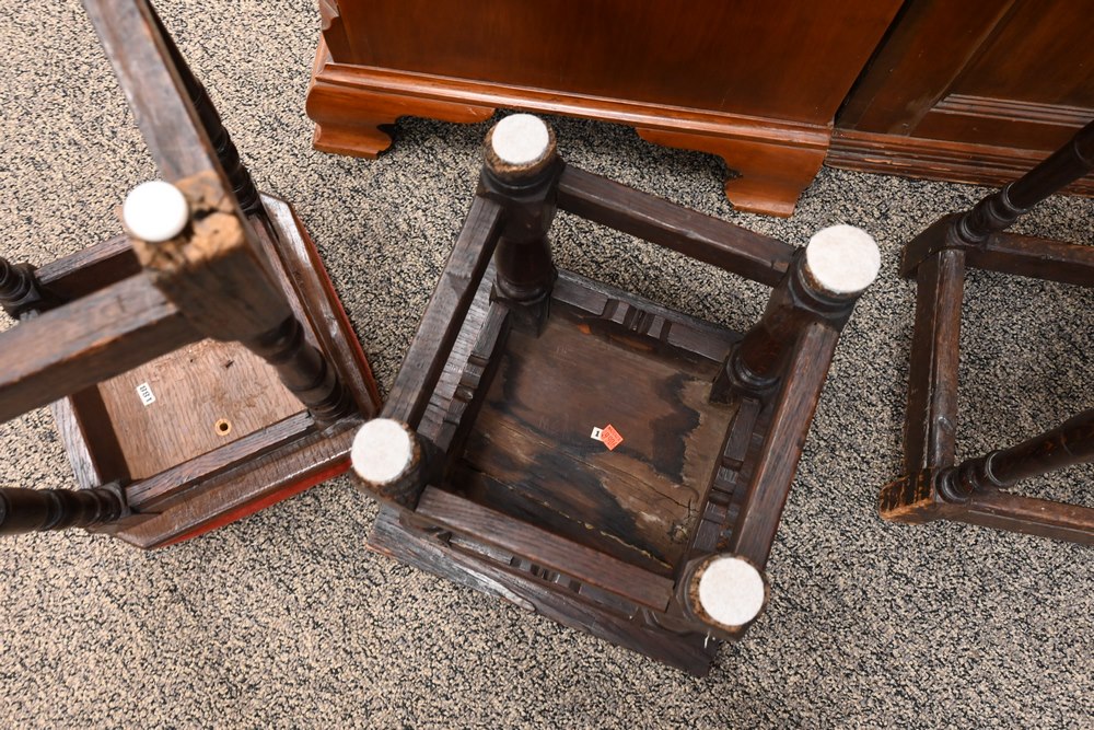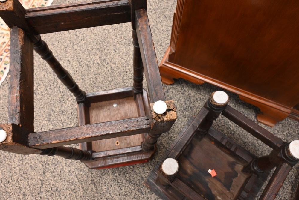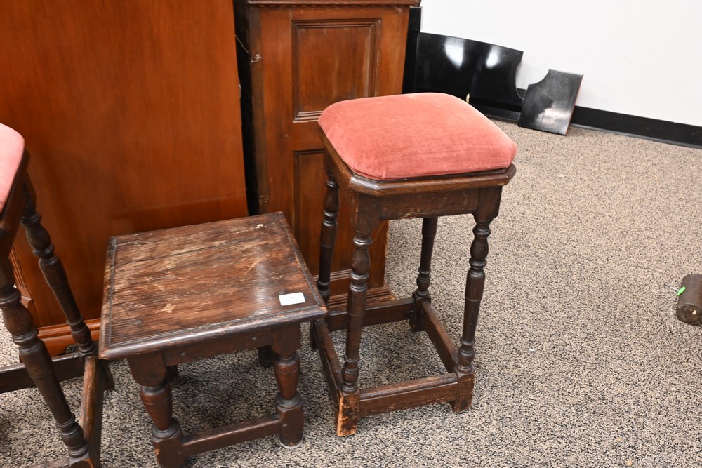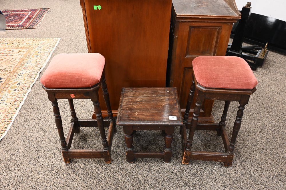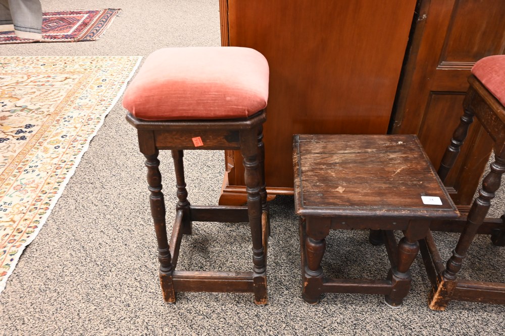 to include pair of oak Jacobean joint stools having custom cushion tops, along with a joint stool