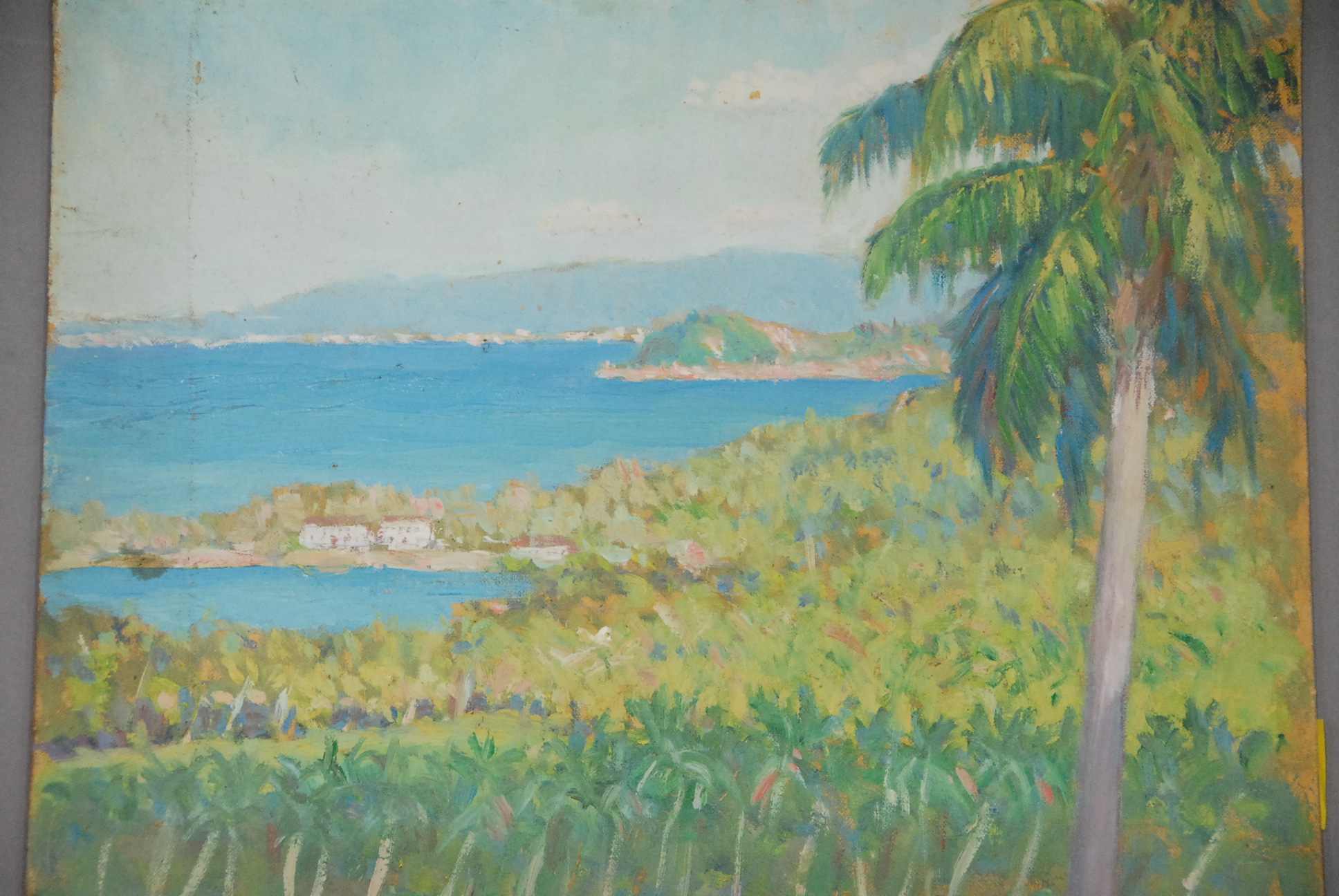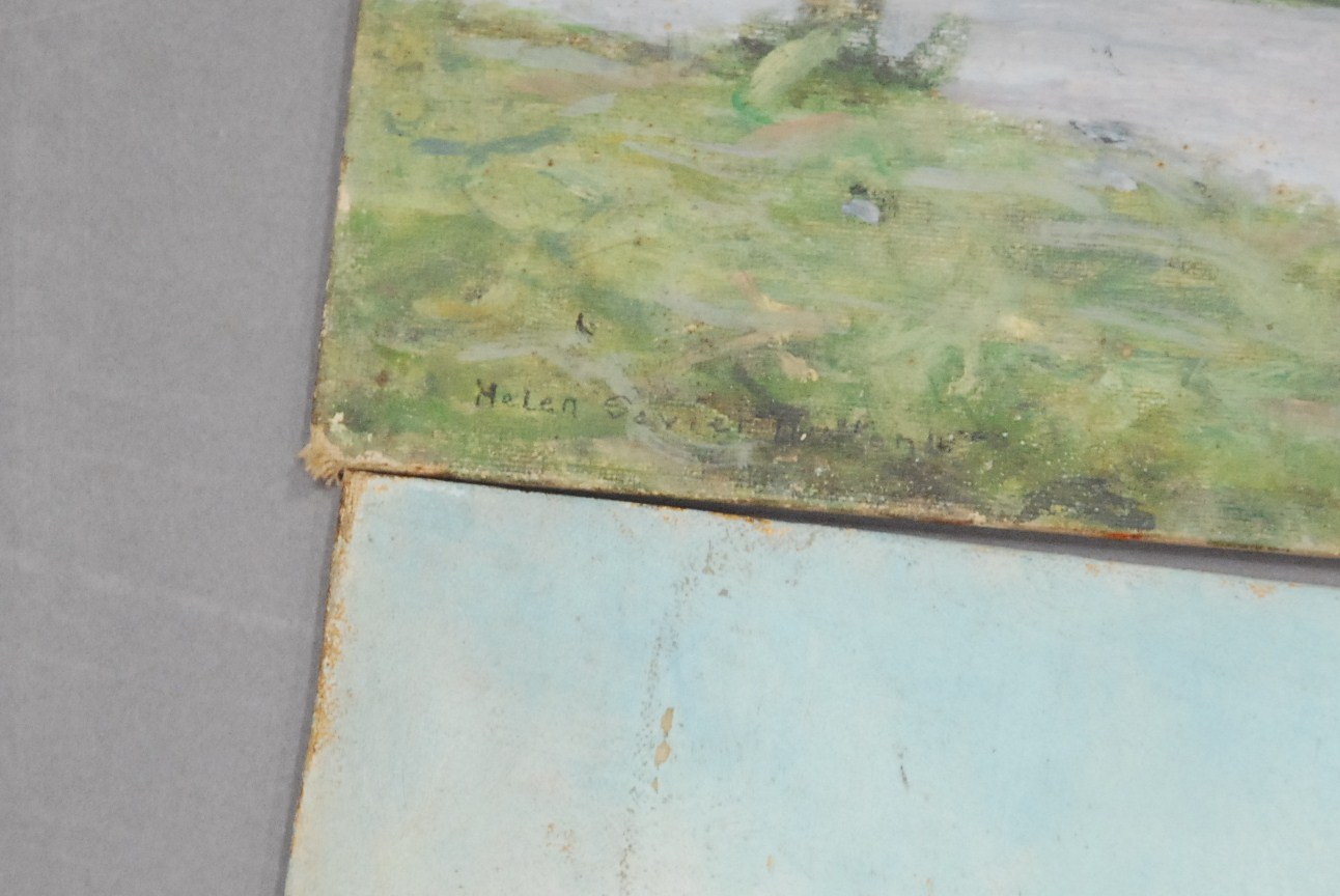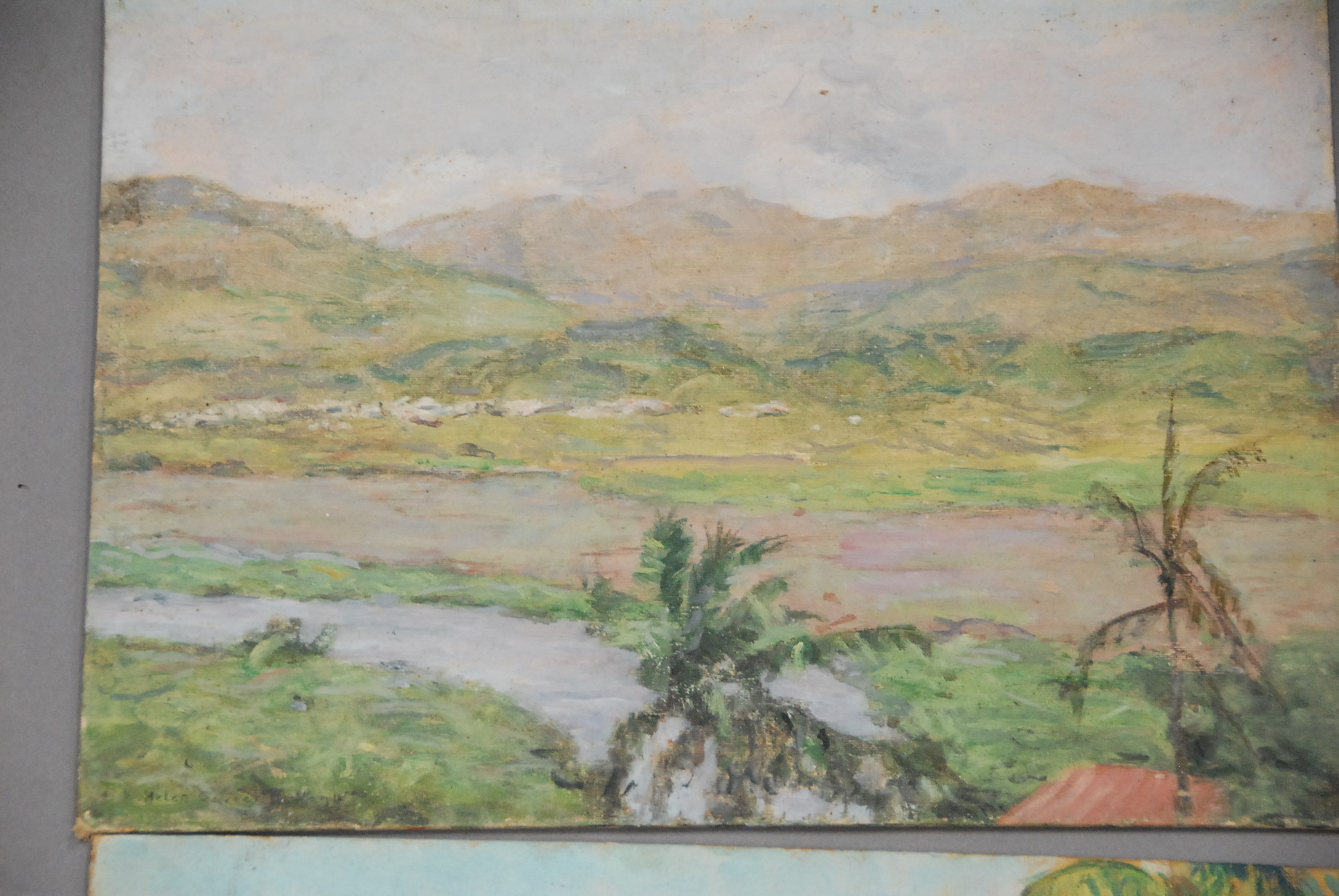 Two oil on artist board paintings, unframed Helen Savier Dumond 1872 – 1968 SUNSET BY THE SEA JAMAICA YUNQUE MT. PORTO RICO one painting is signed lower left Helen Savier Dumond