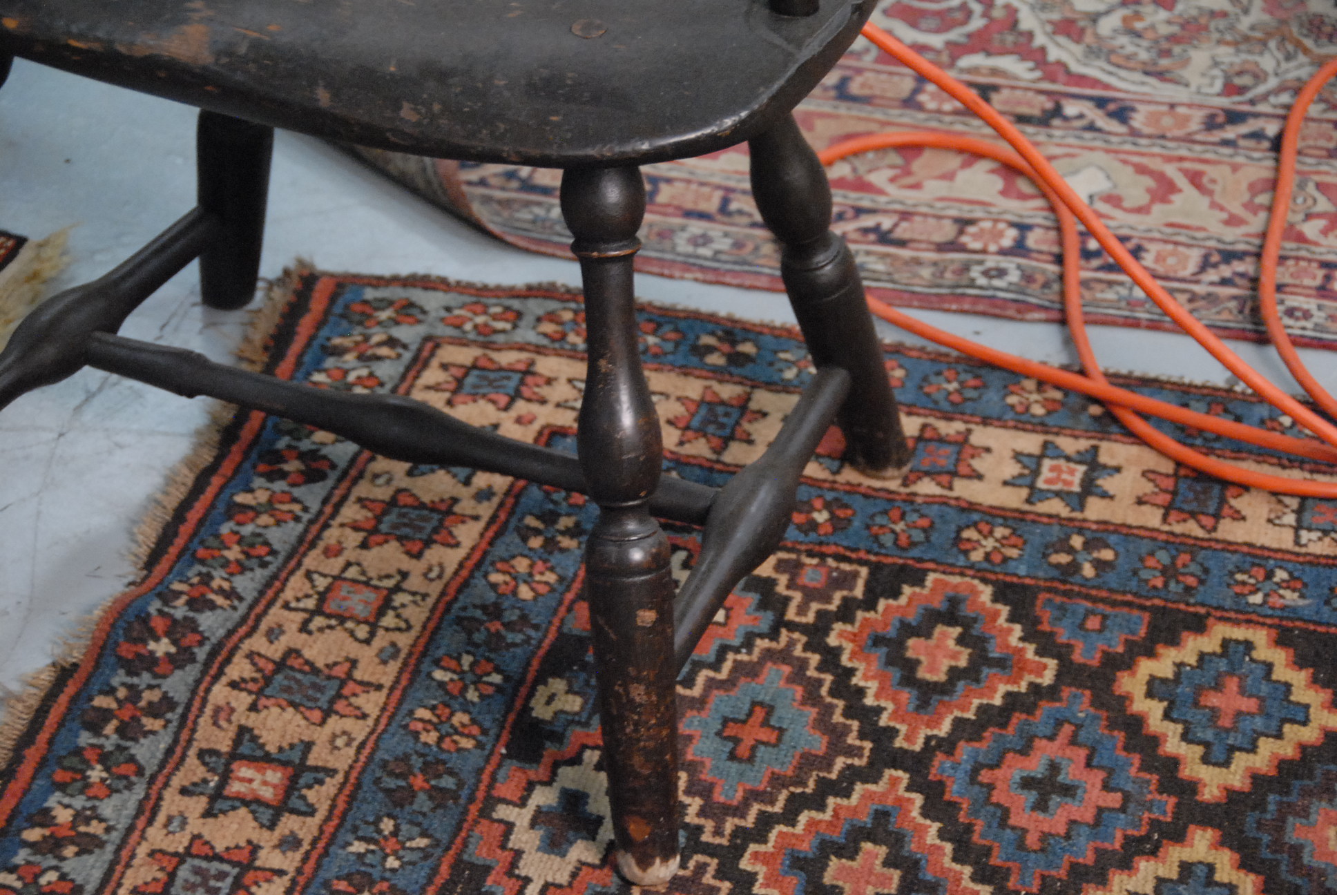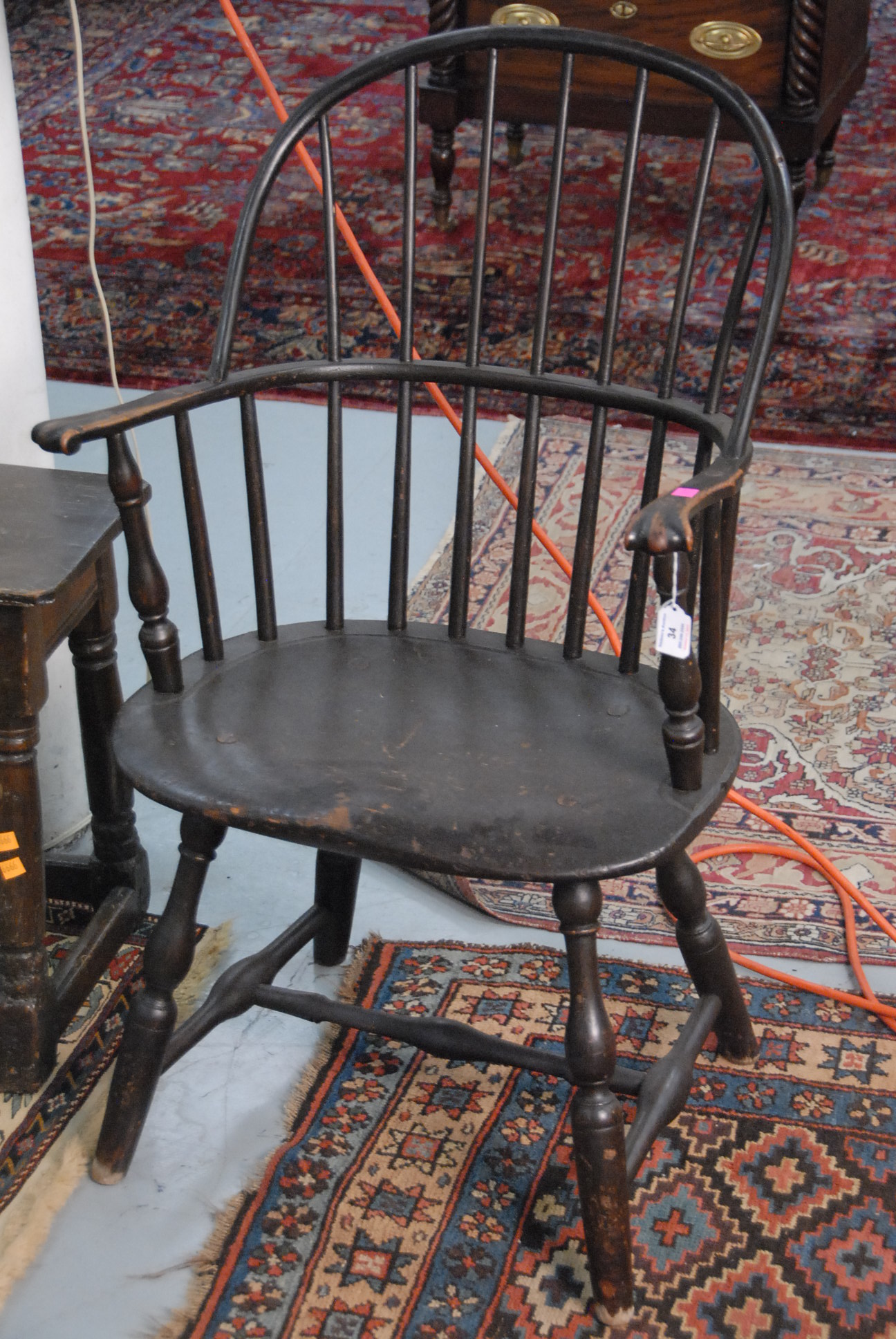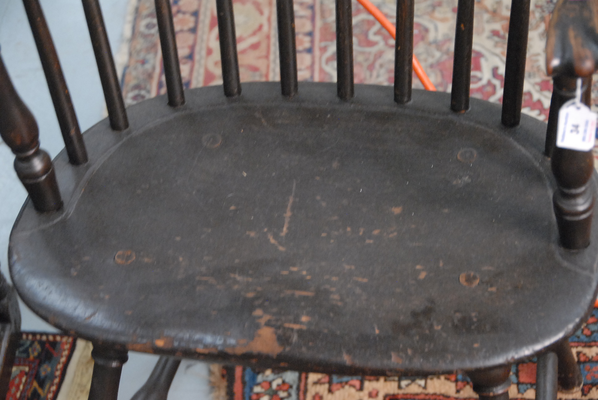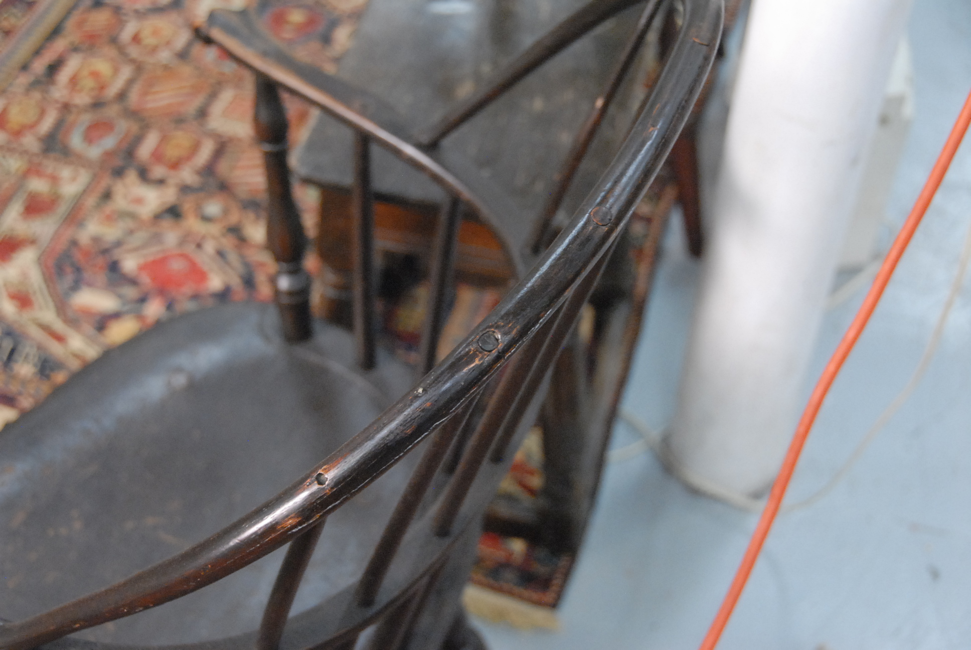 Lot 34: Windsor knuckle armchair with bow back, saddle seat, and bold turned legs. seat ht. 16 1/2in.