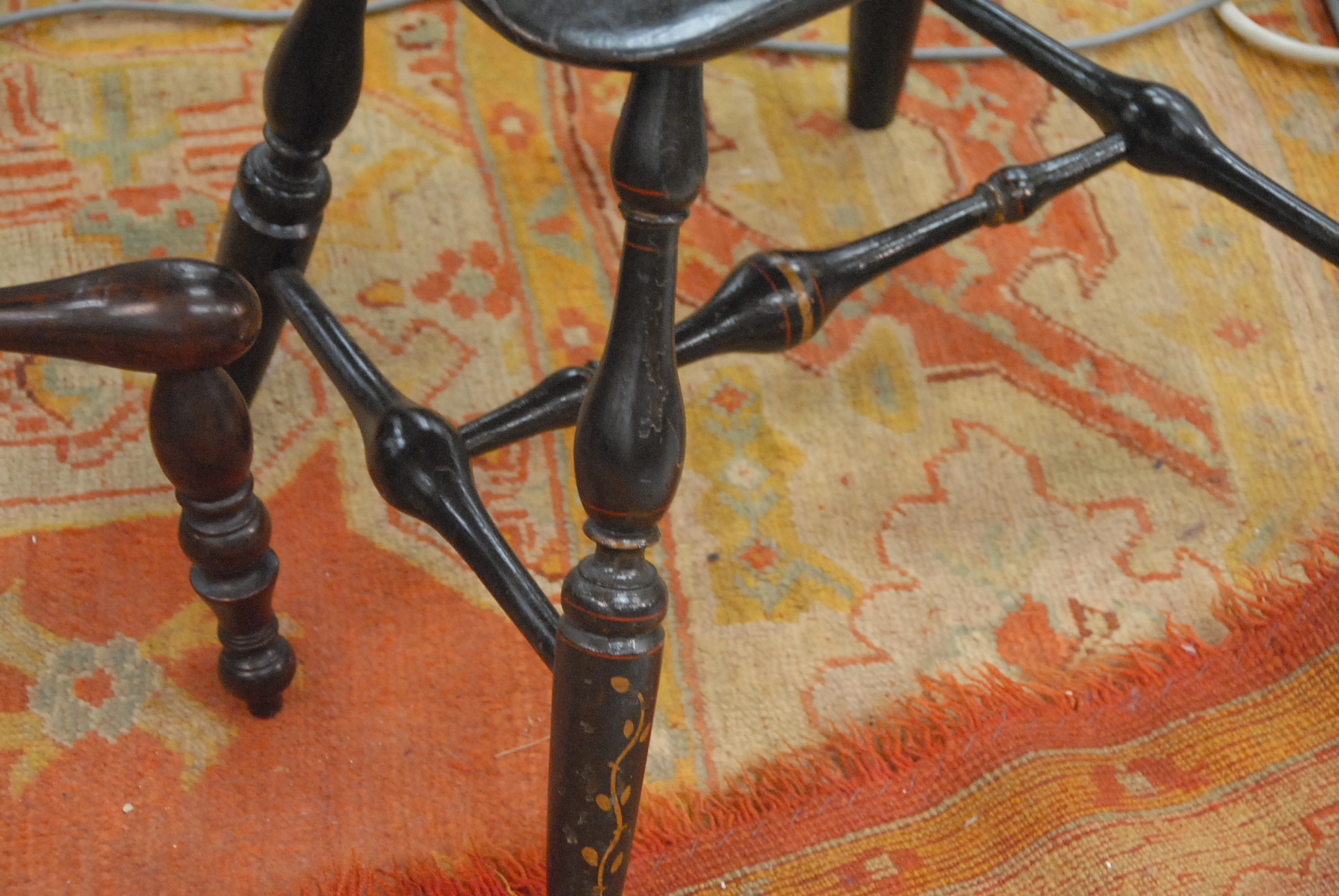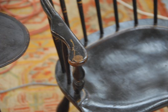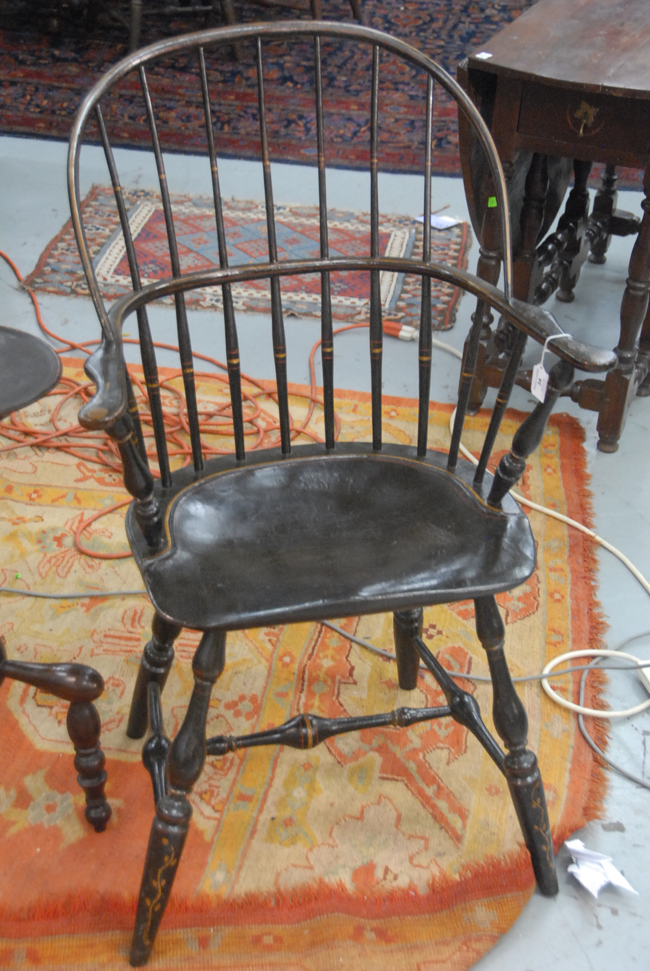 Lot 34: Windsor sack back armchair having bold turned legs and stretcher in old black paint and gold and red decoration, 18th century, probably Connecticut. seat ht. 18 1/2 in. total ht. 39 1/4 in.