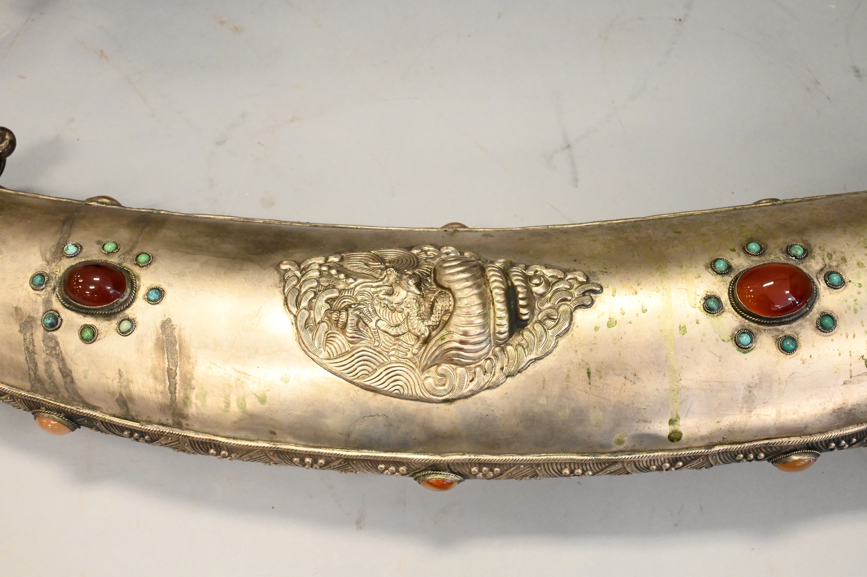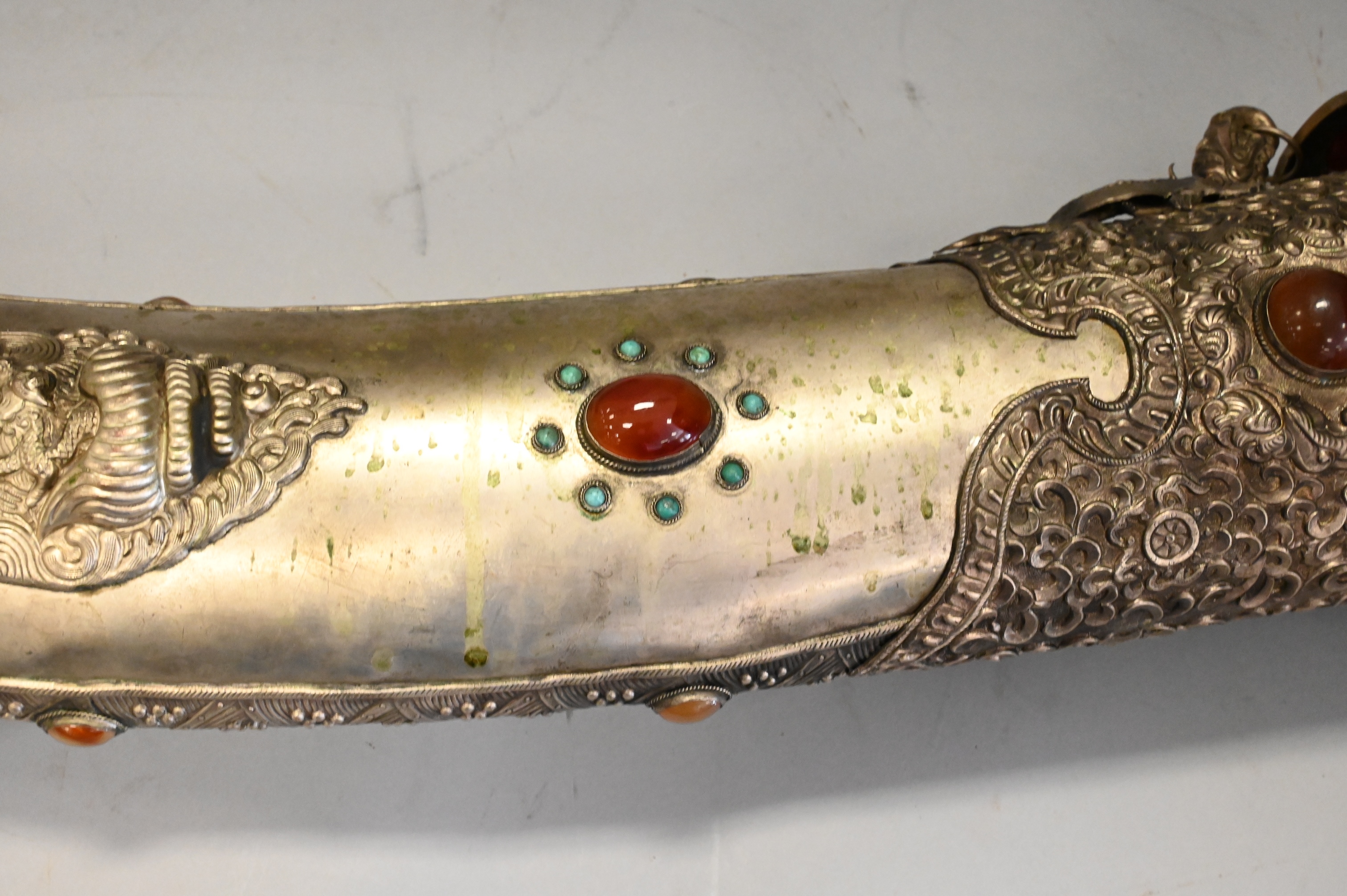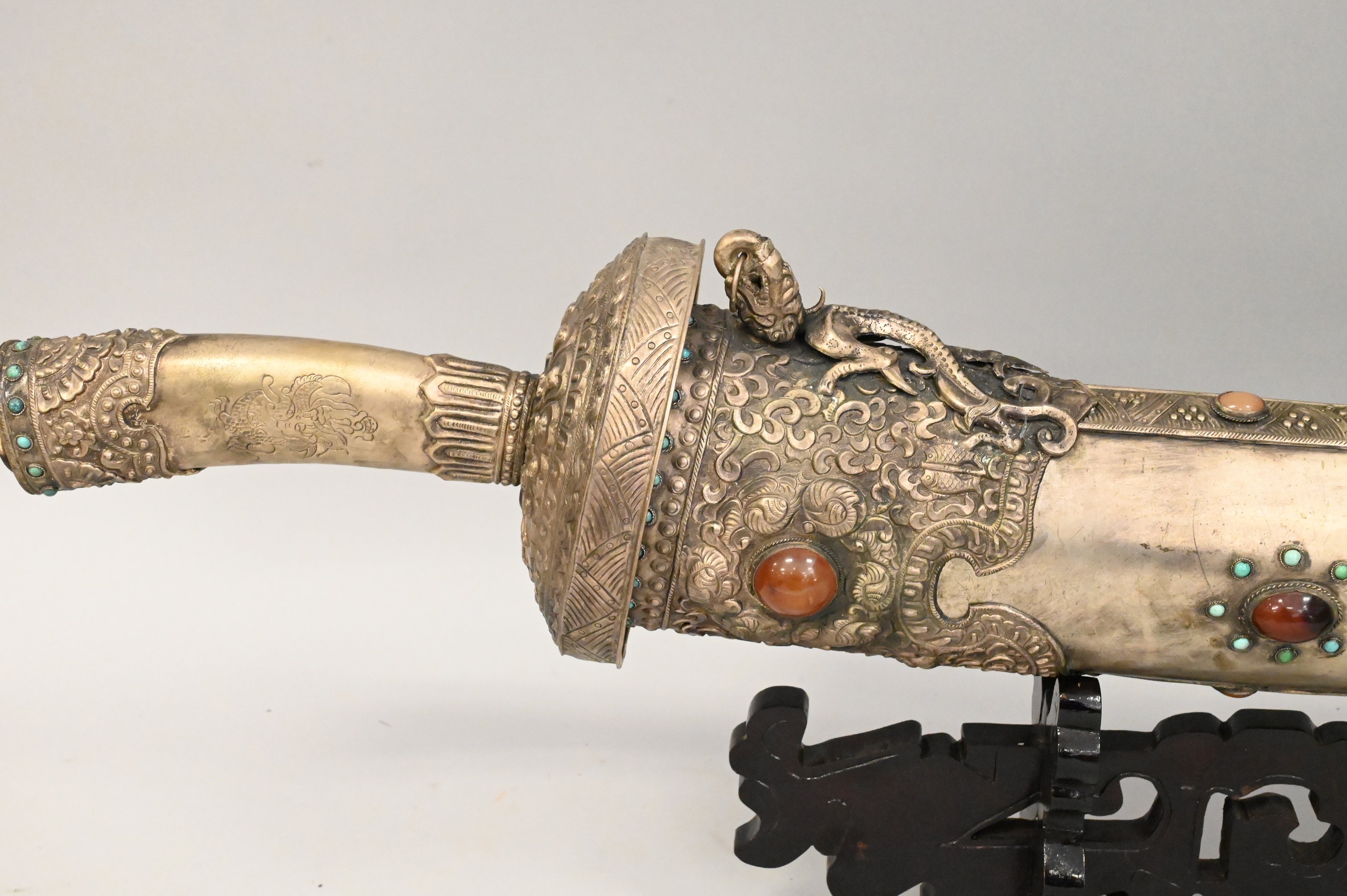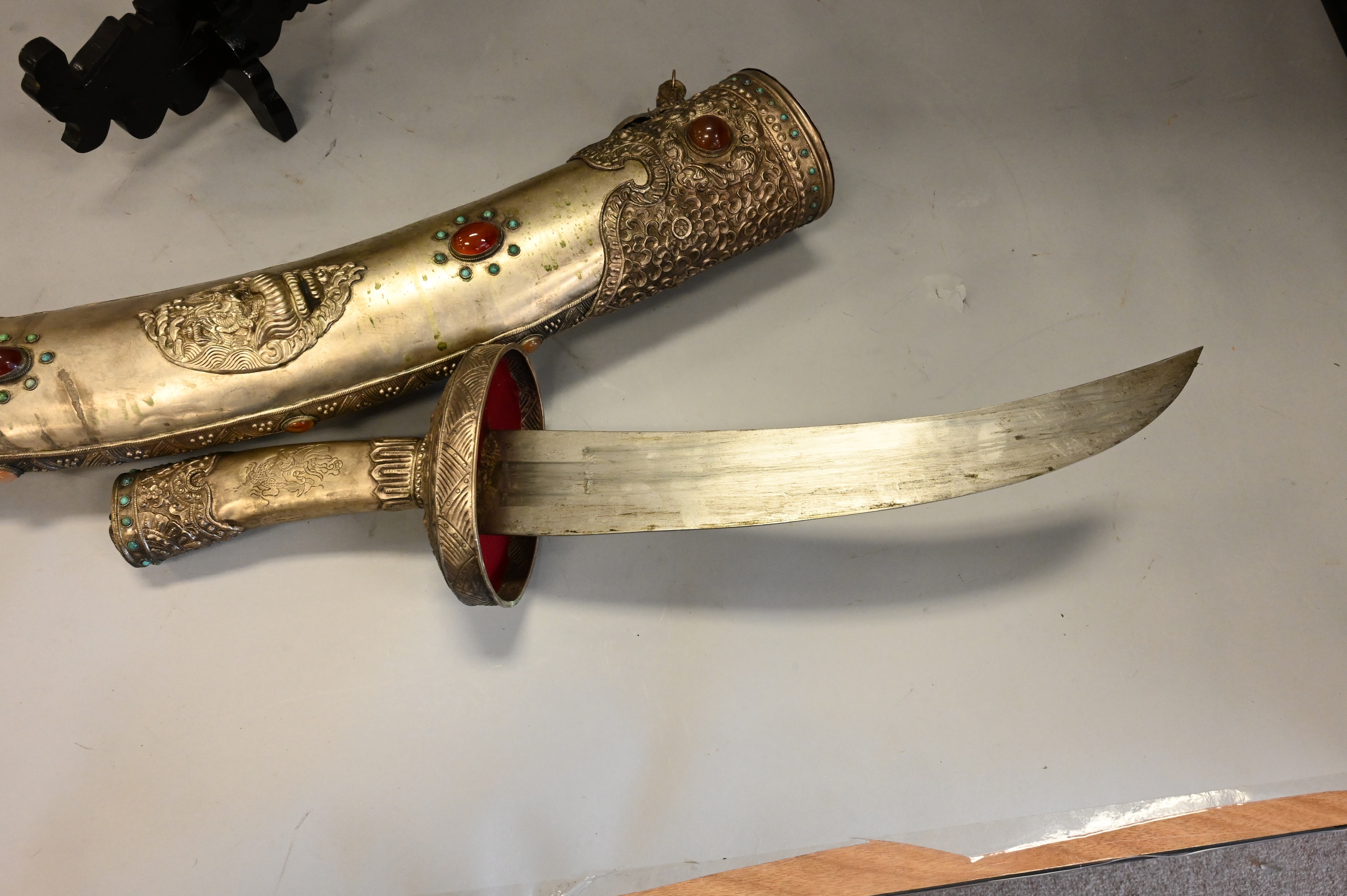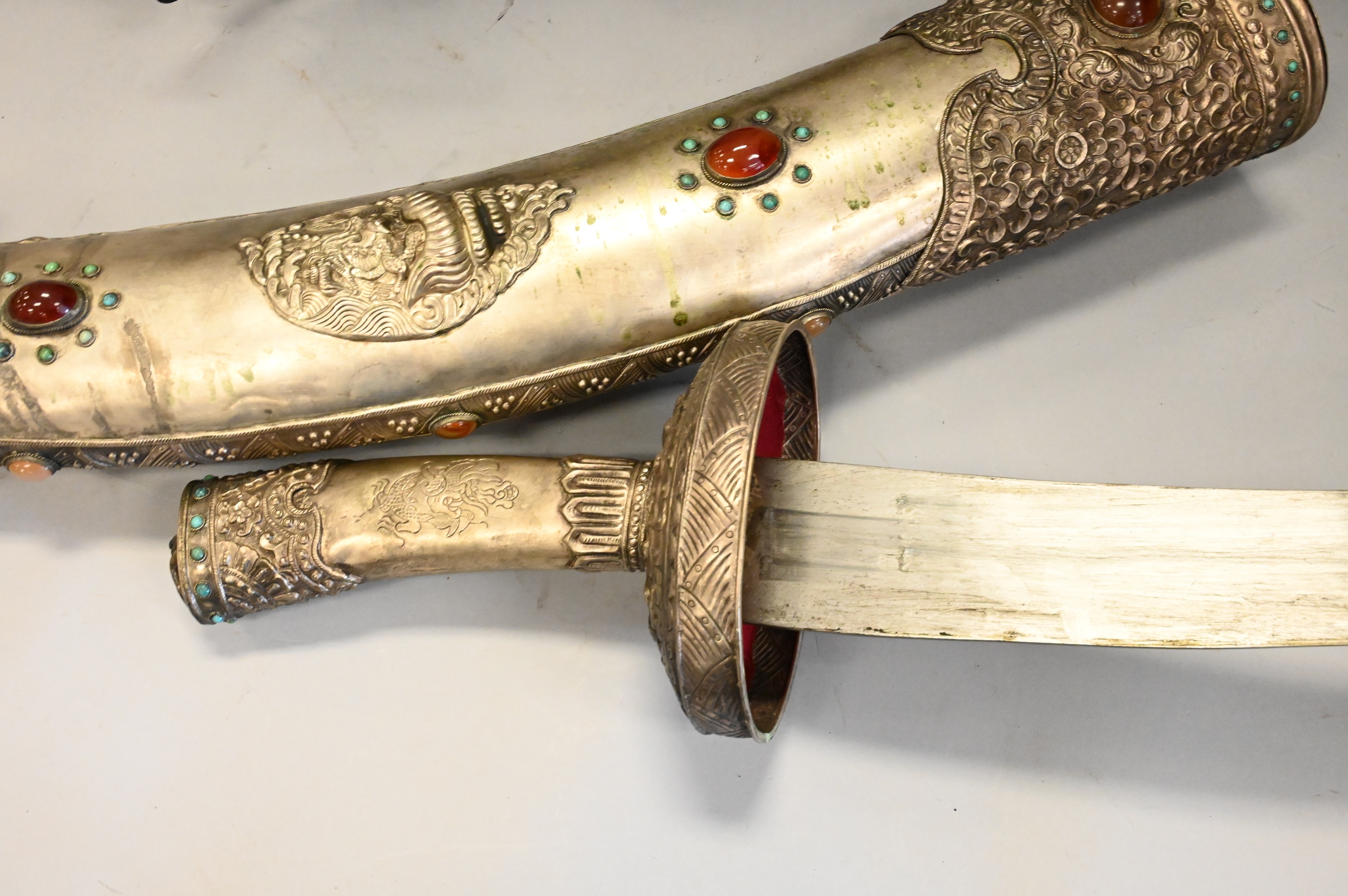Antique Carved Tibetan Silvered Sword and Sheath, having turquoise and red coral stones inlay, length 39 inches total in sheath.