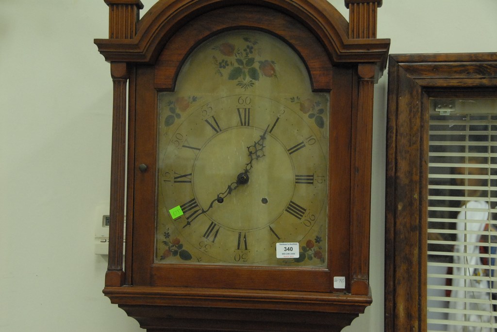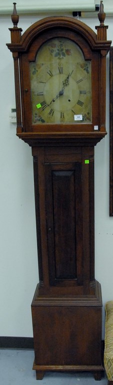 Lot 340: Cherry tall case clock with painted wood dial and brass works. Provenance: Brown FAmily, Windsor, Connecticut ht. 79 1/2in.