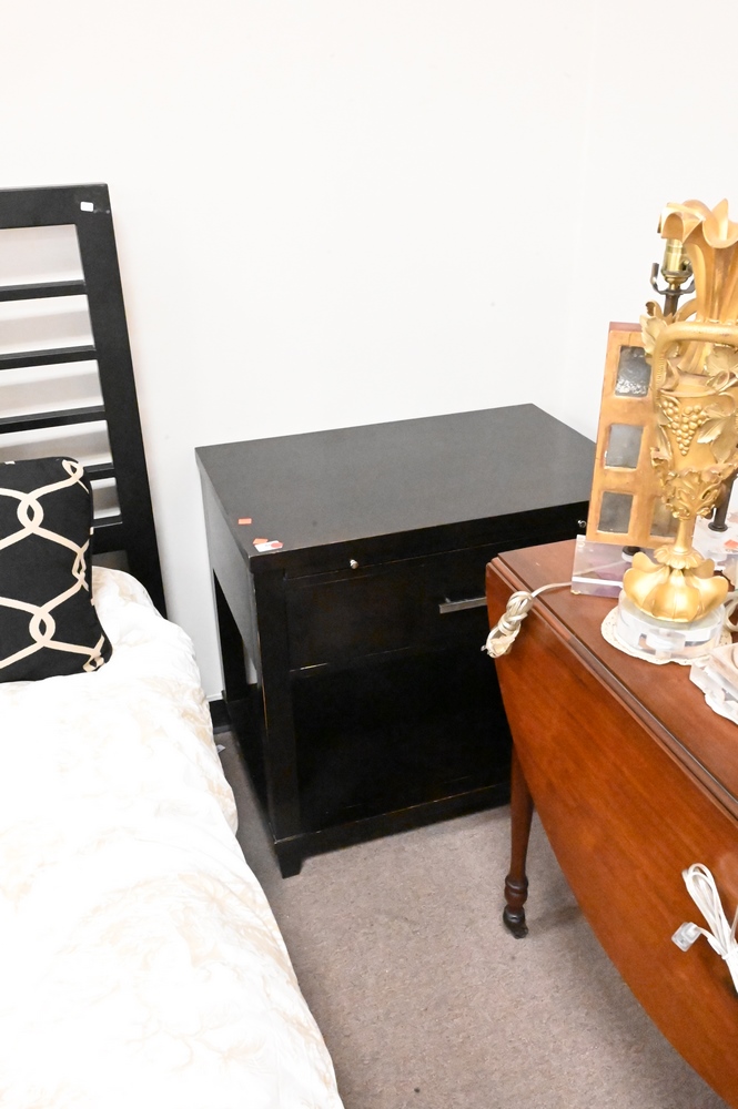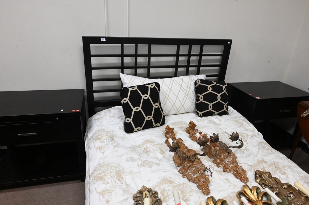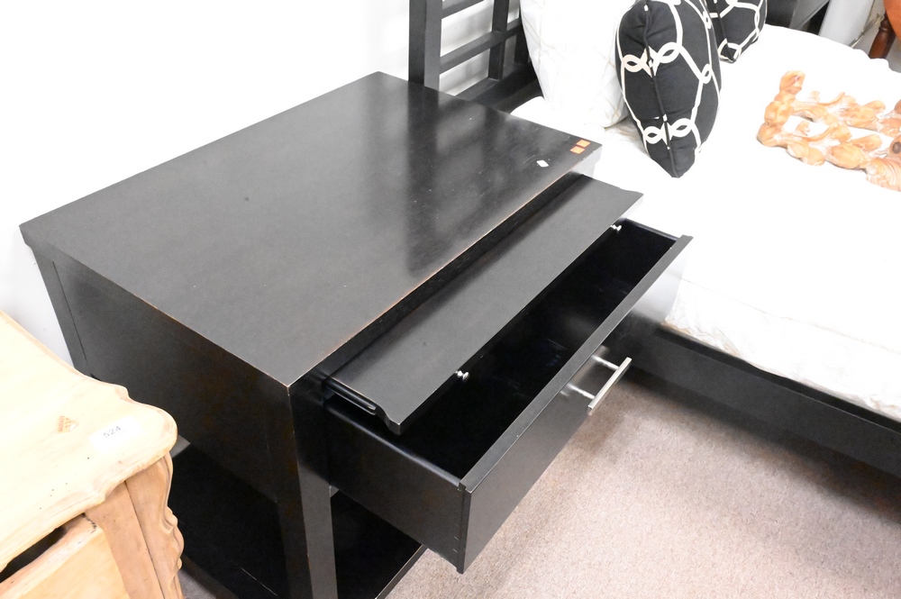 Contemporary Three Piece Set, to include double bed, along with two stands having pull out slides; bed height 48 inches.