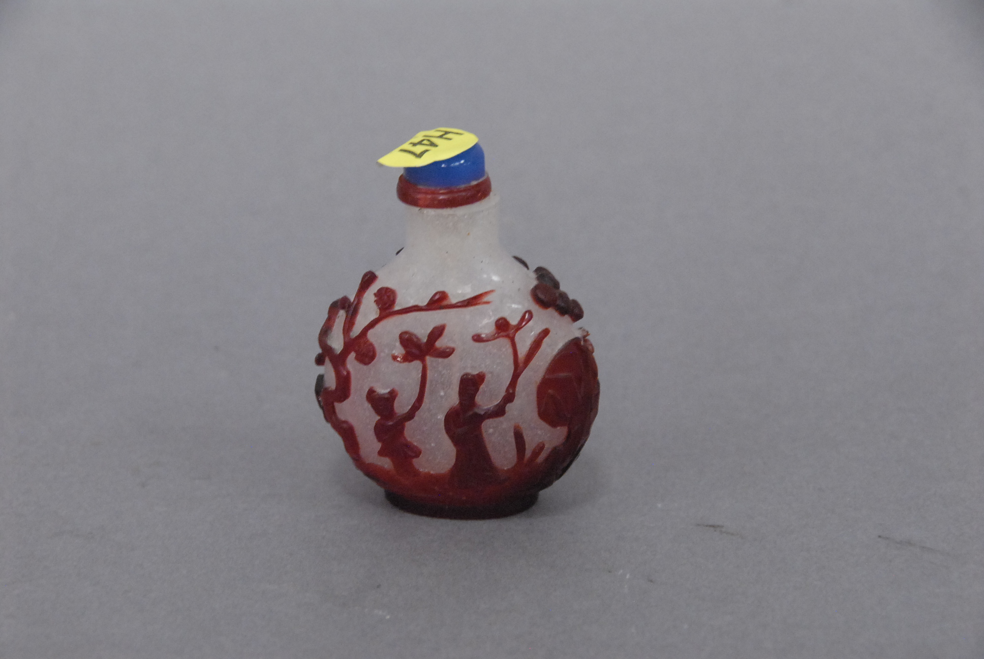 Lot 340: Fine red overlay snowflake glass snuff bottle having a large pine tree and several figures, ht. 2 3/4.