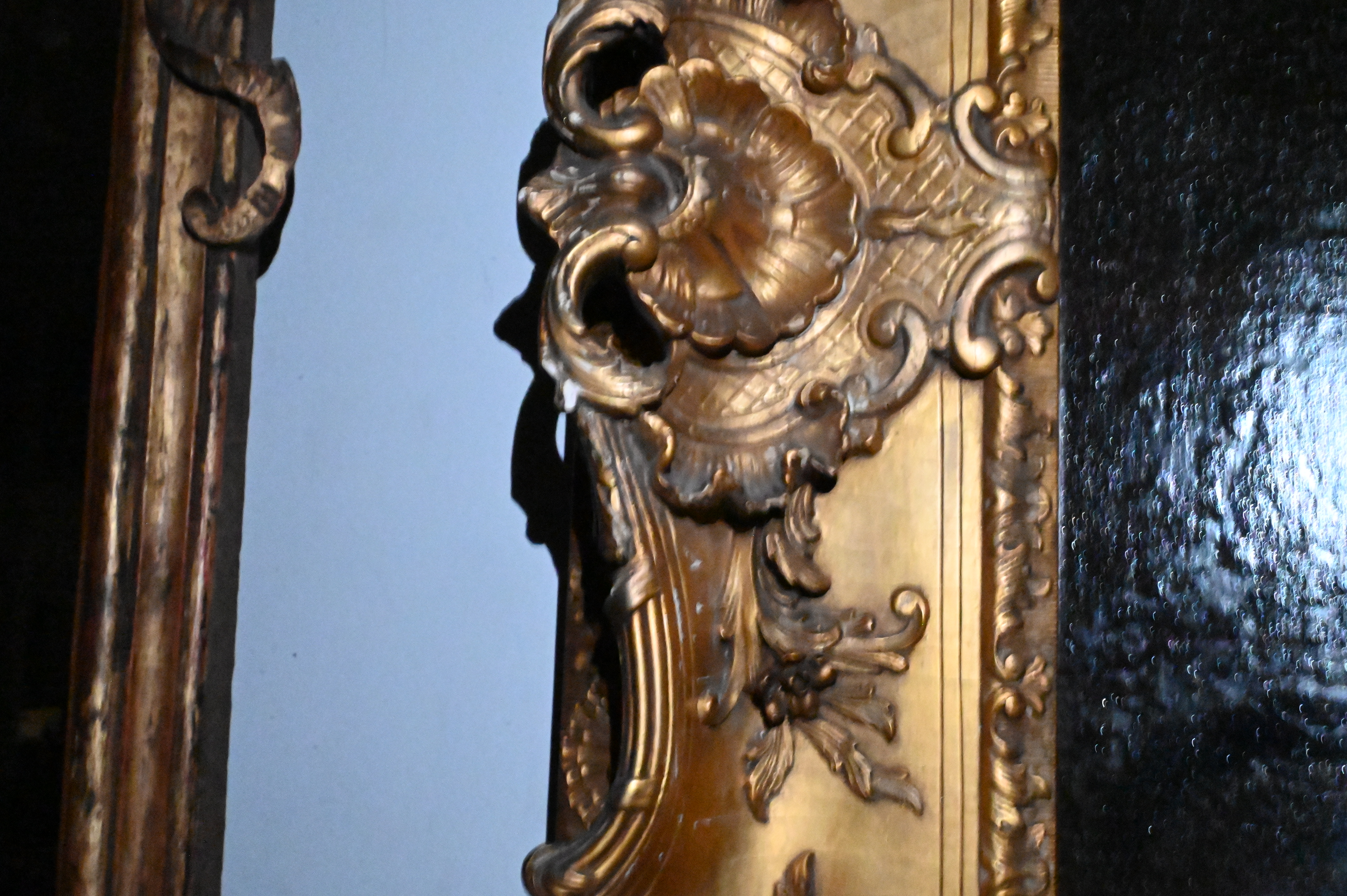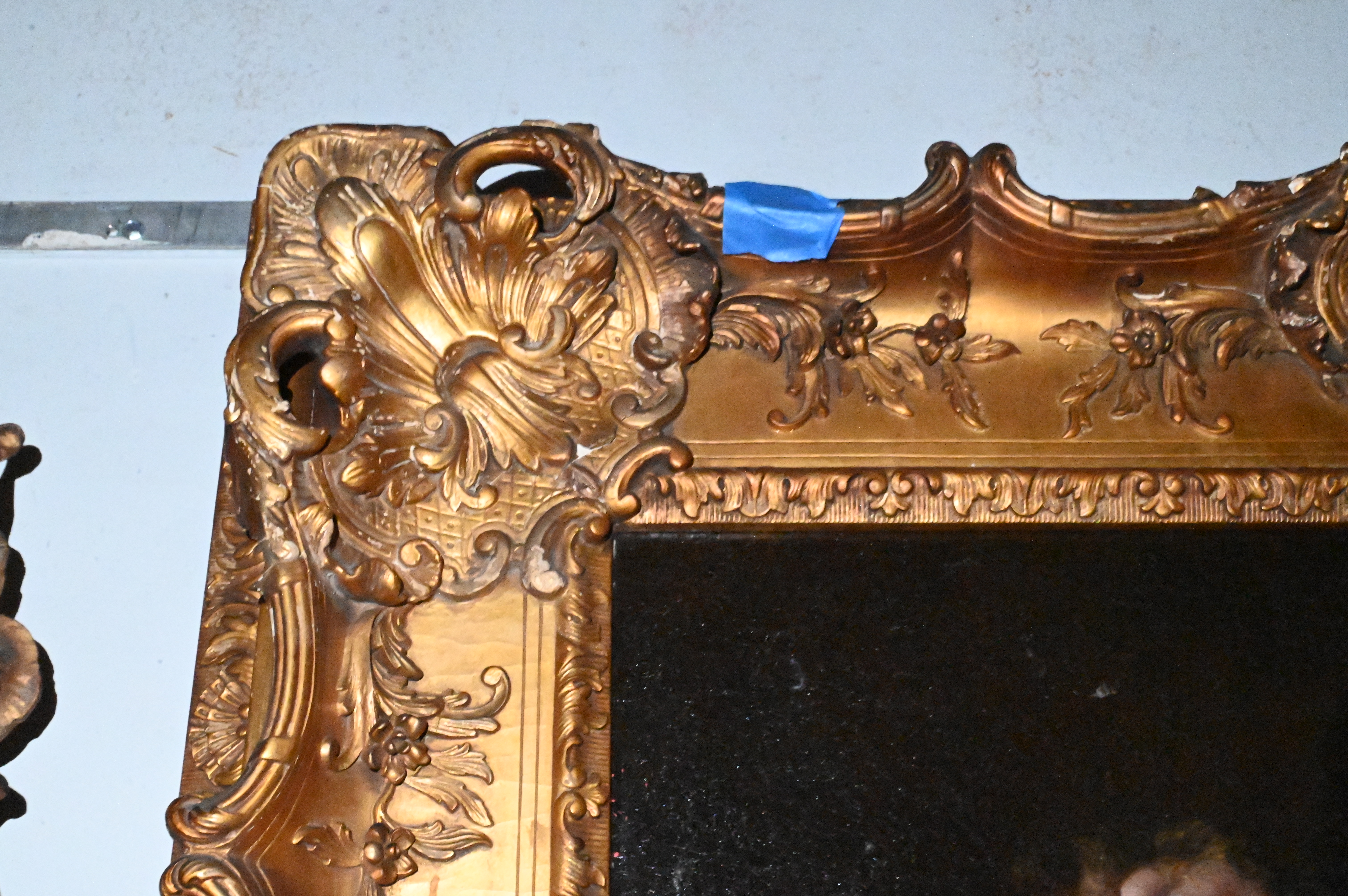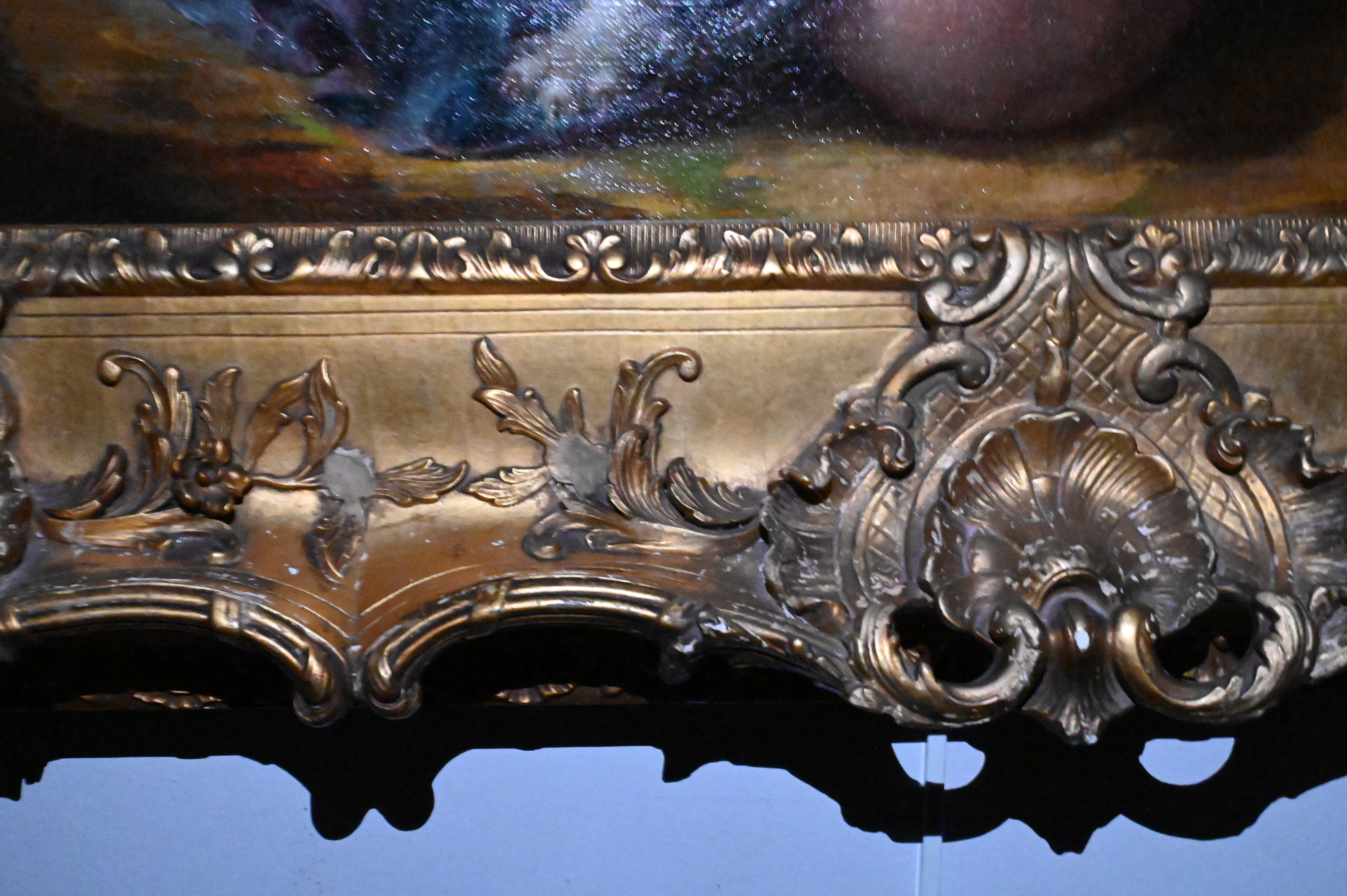 Canvas has been relined and restretched. craquelure. Repairs to frame. varnish concentrating in background. inpainting.