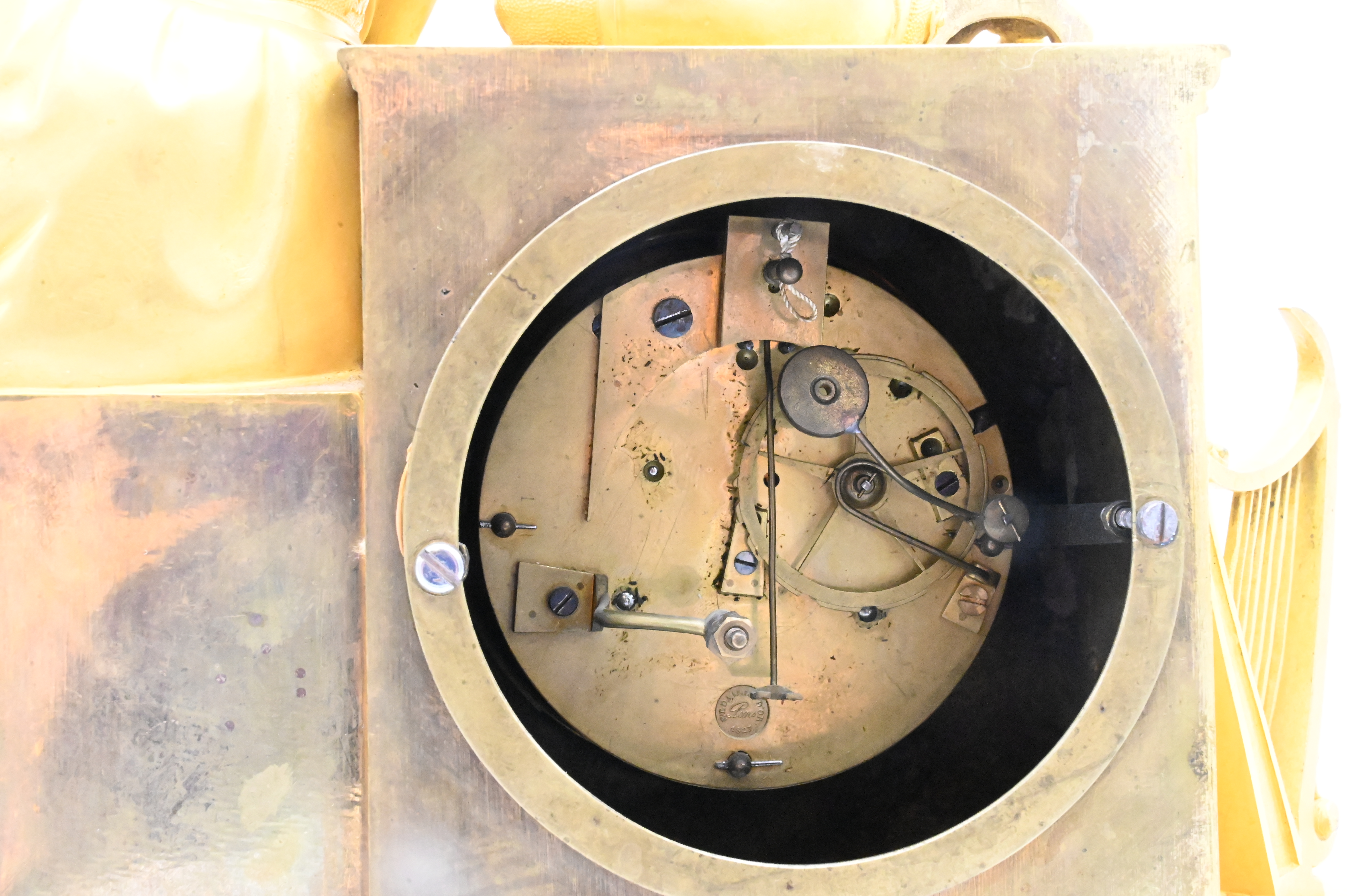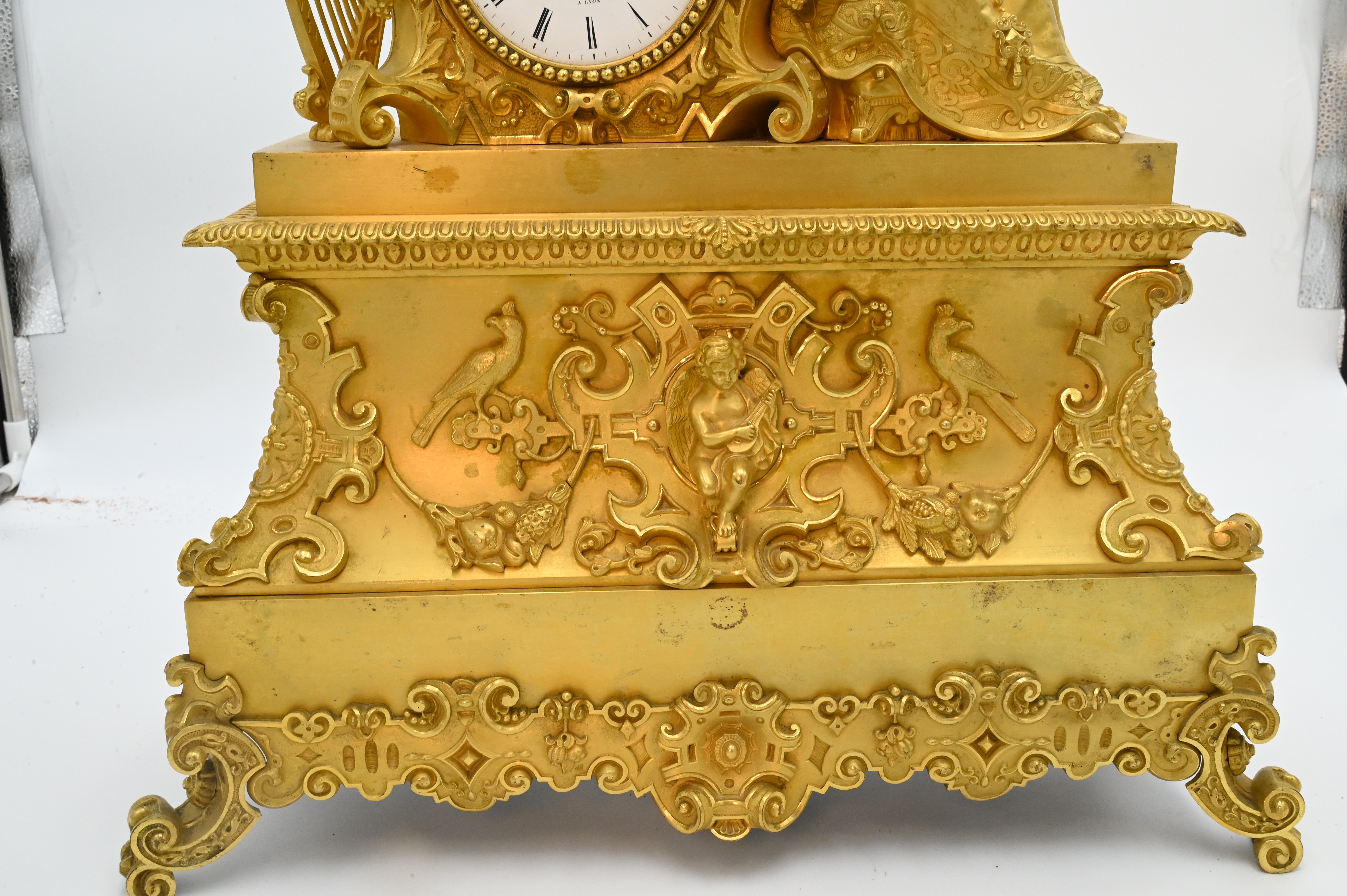 Gilt Bronze Mantel Clock, female figure leaning on a clock on gilt base, height 20 inches, length 16 inches, depth 6 inches.