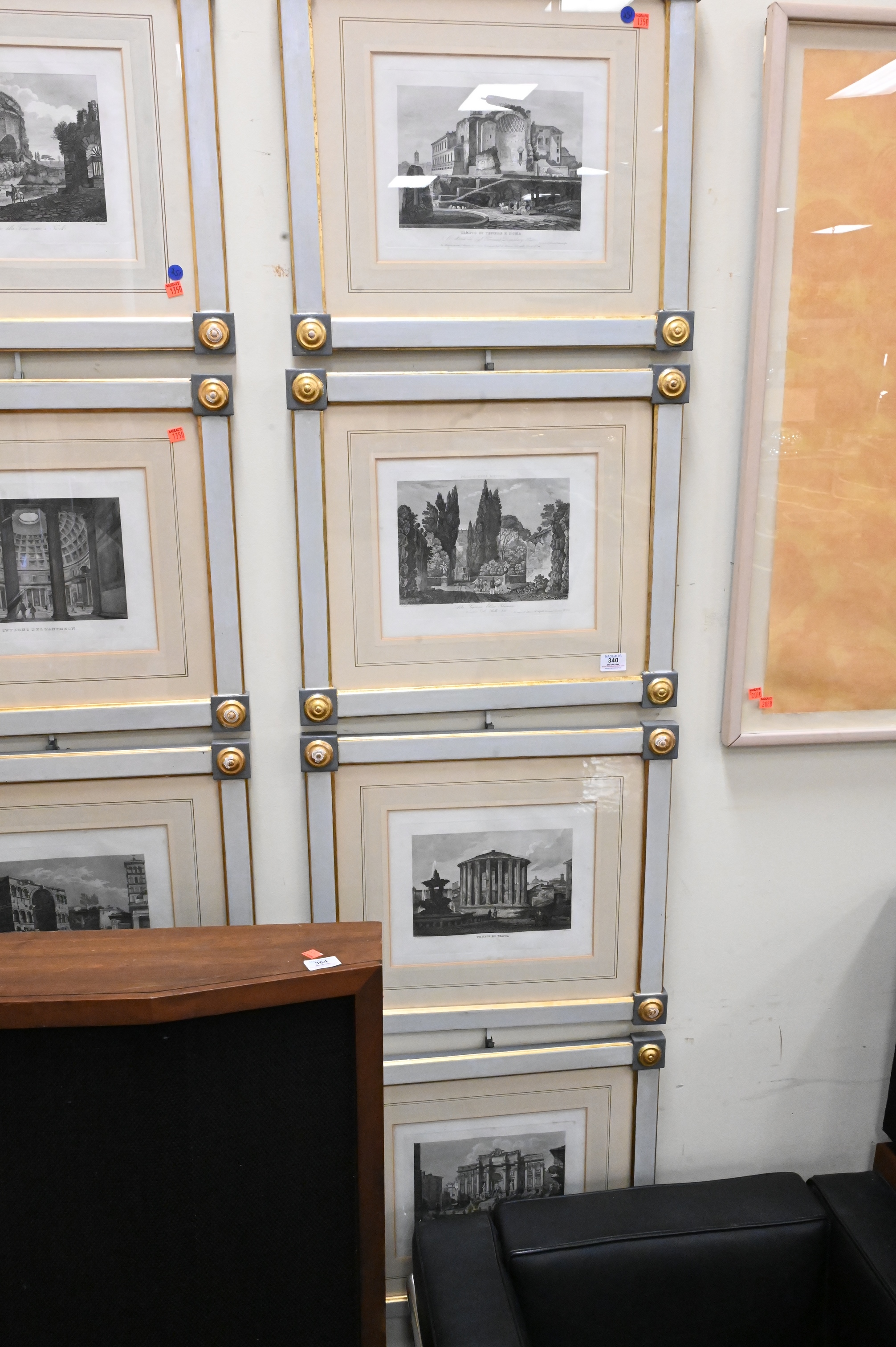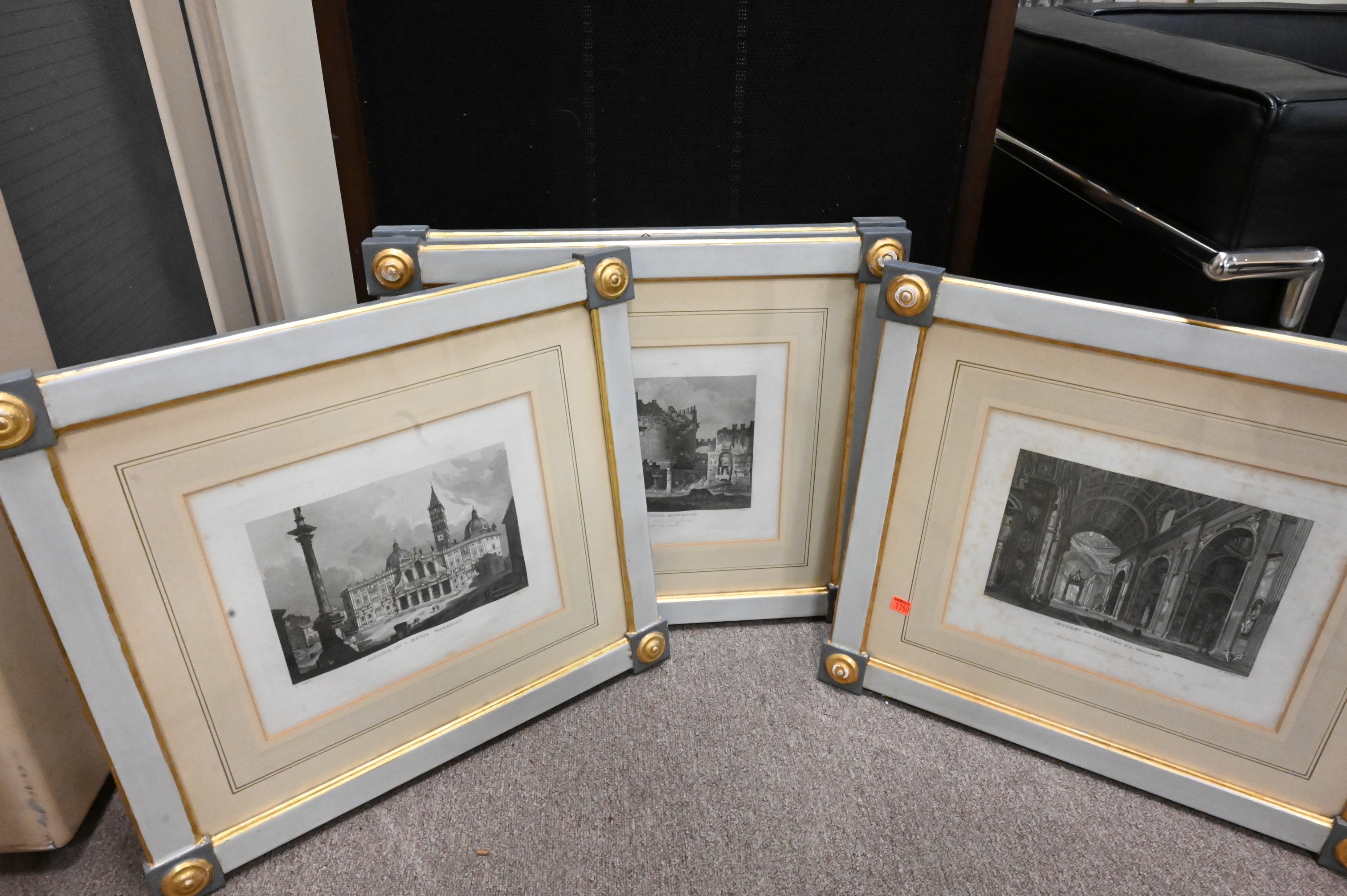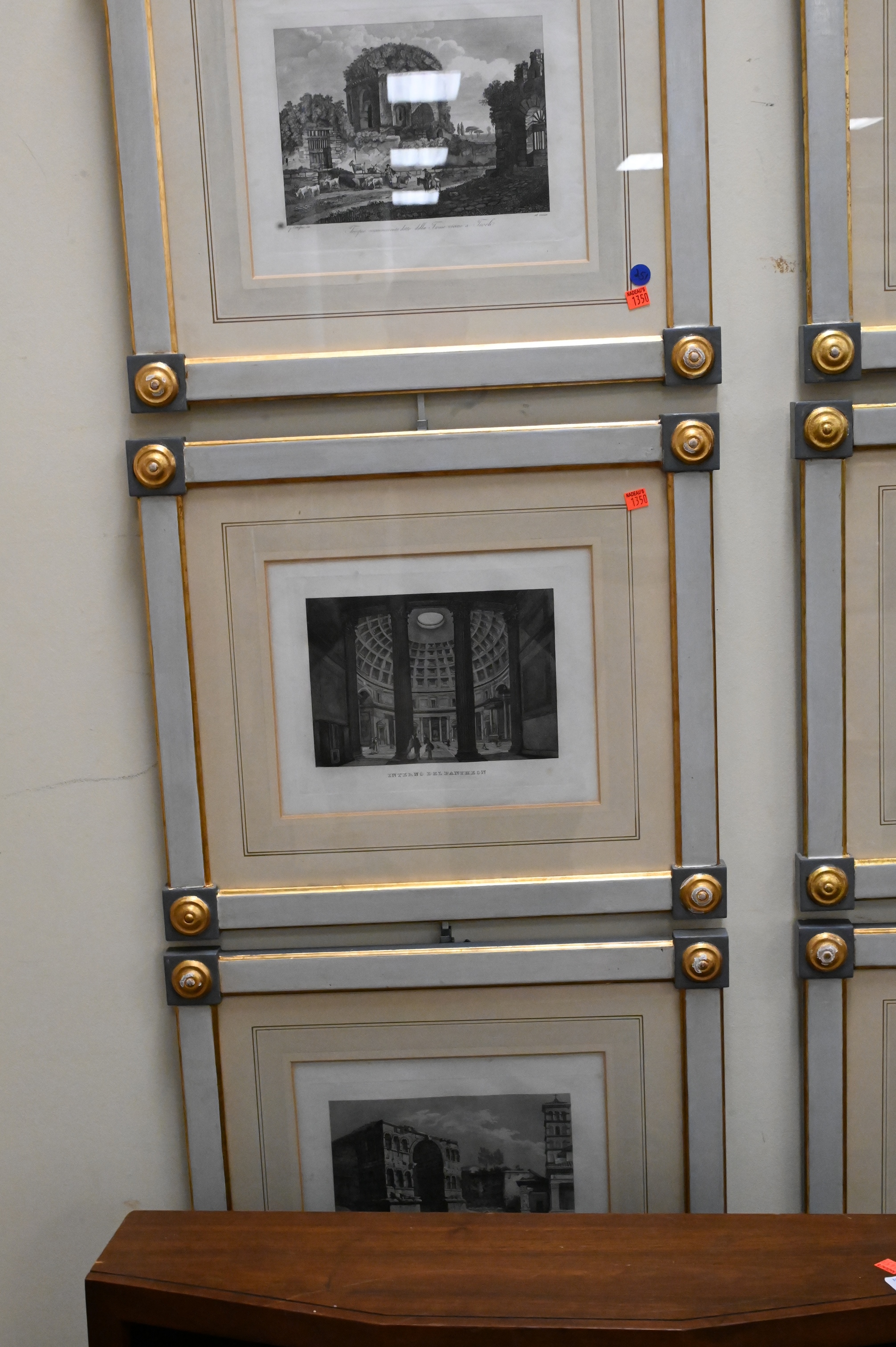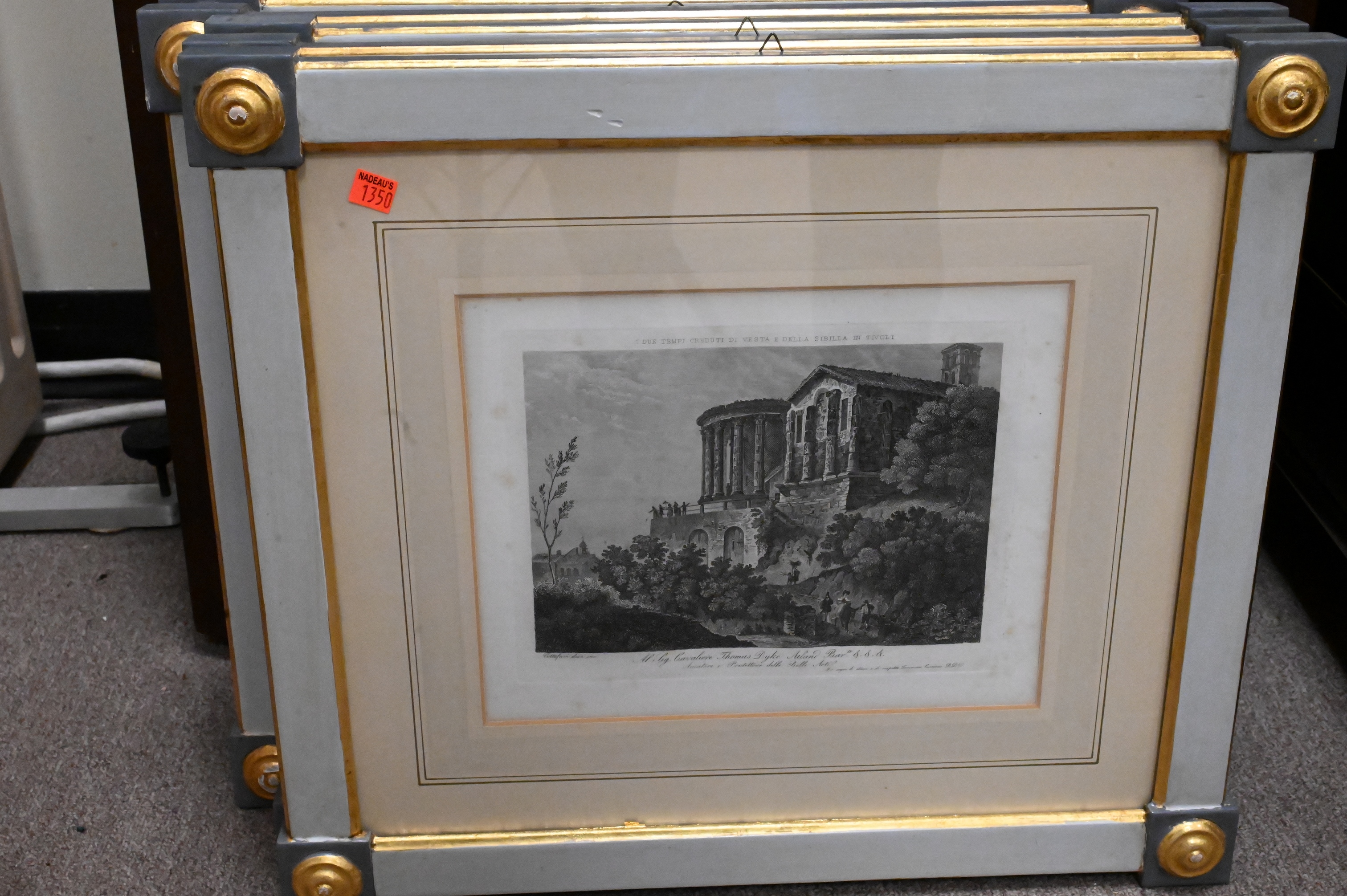 Italian School Engravings, 19th century Studies of Ancient Temples, to include Tempio Comunemente Detto; Sepolcro Di Metella; Fontana Di Trevi; Tempio Di Vesta; Ciano Quadrifronte; AL Sig Cavaliere; Amfiteatro Flavio; Basilica Di Sumaria Maggiore; Interno Di Sopretso Vaticano; Alla Signora Thomson; Interno Del Pantheon; along with Tempio Di Venere E Roma; plate 8″ x 10 1/2″, foxed overall, in fair condition. Provenance: Property from a private New York collection sold to benefit charitable foundations.