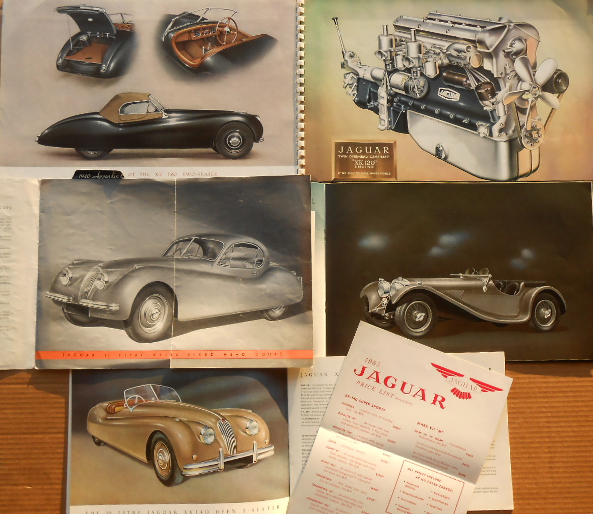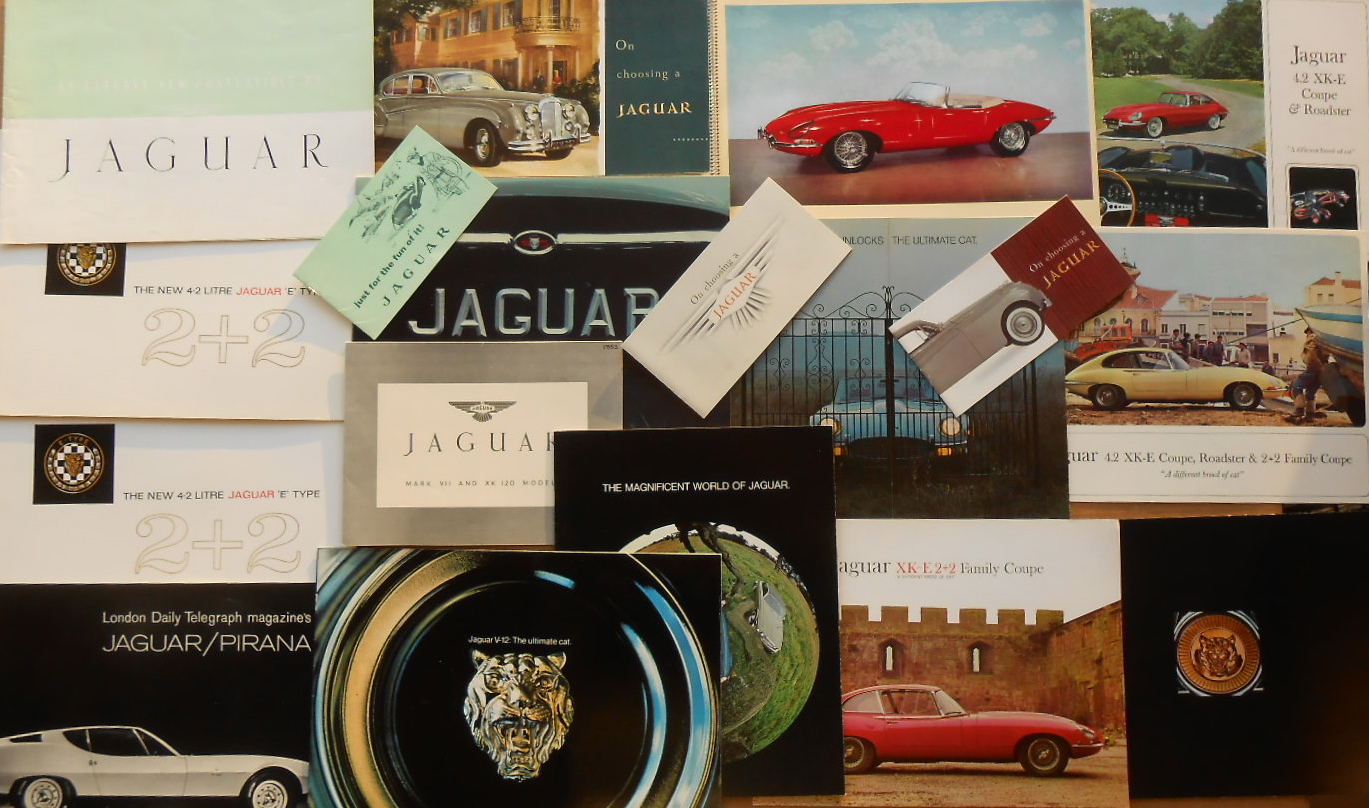 Jaguar sports car brochures – 1934 SS100 the 1974 XK E – 23 large and 3 small