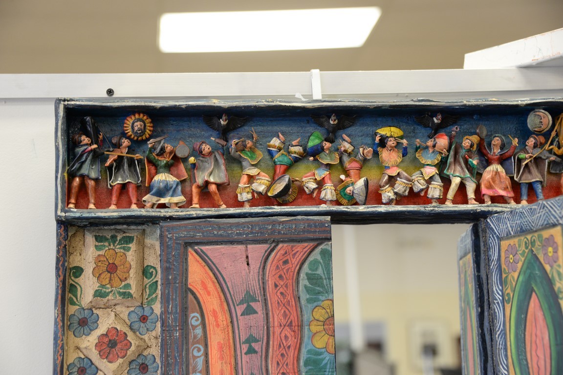 Jimenez Retablos mirror with figures on top and bottom. 26 1/2 x 22 1/2