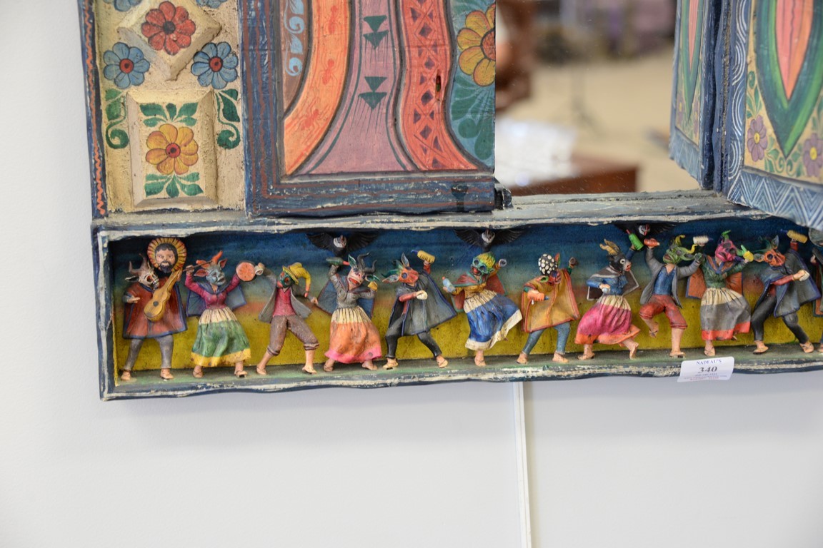 Lot 340: Jimenez Retablos mirror with figures on top and bottom. 26 1/2 x 22 1/2
