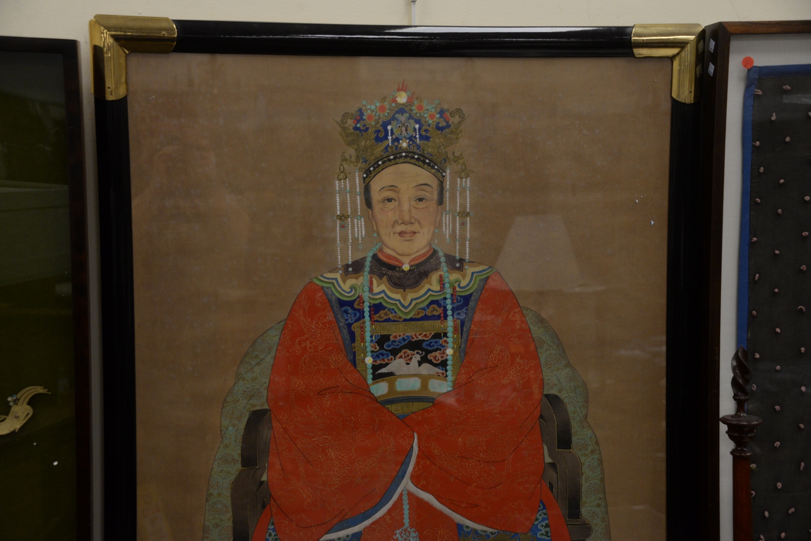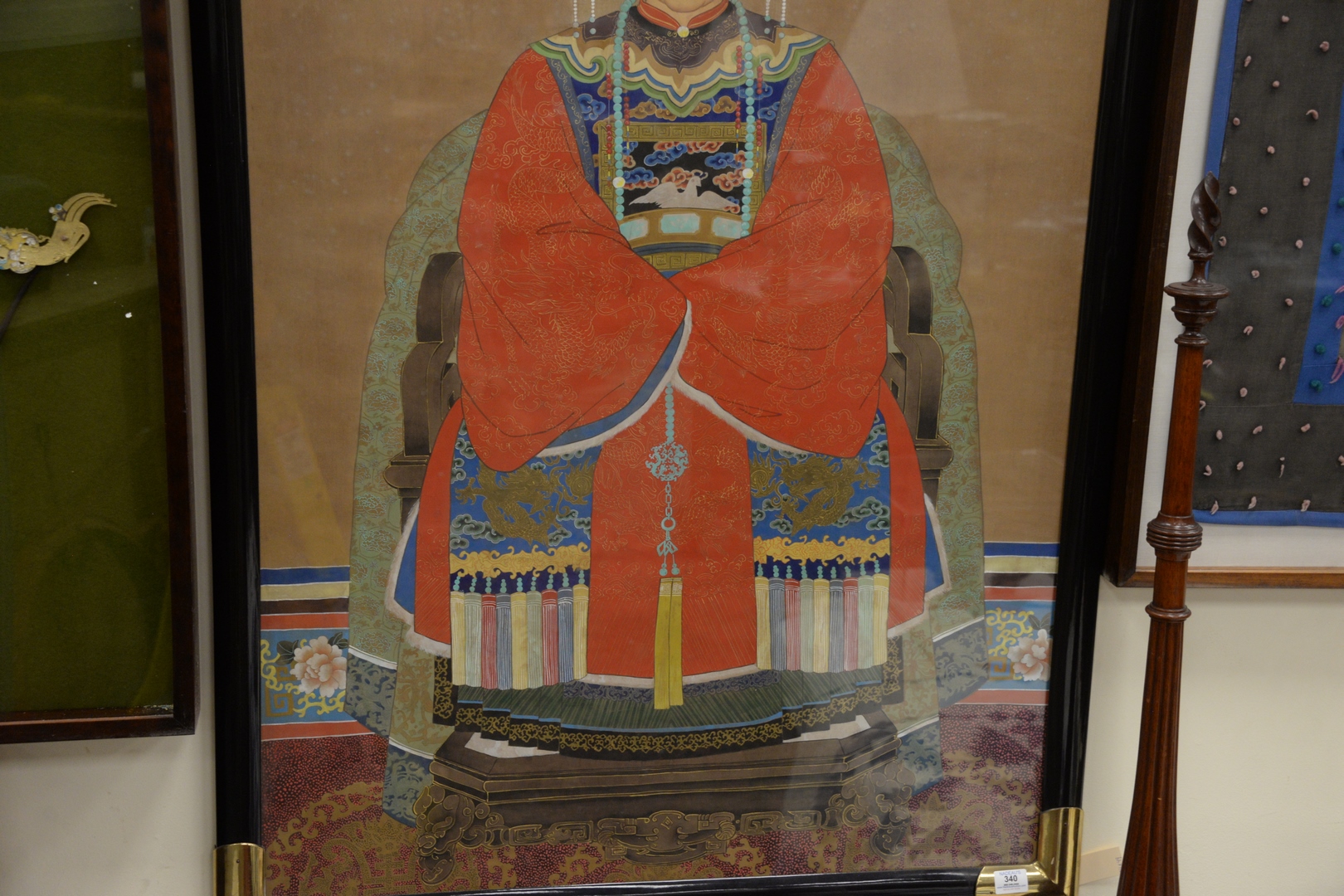Lot 340: Large Chinese Ancestral Portrait seated scholar figure wearing a red robe with dove patch, oil on silk, 34 x 49.
