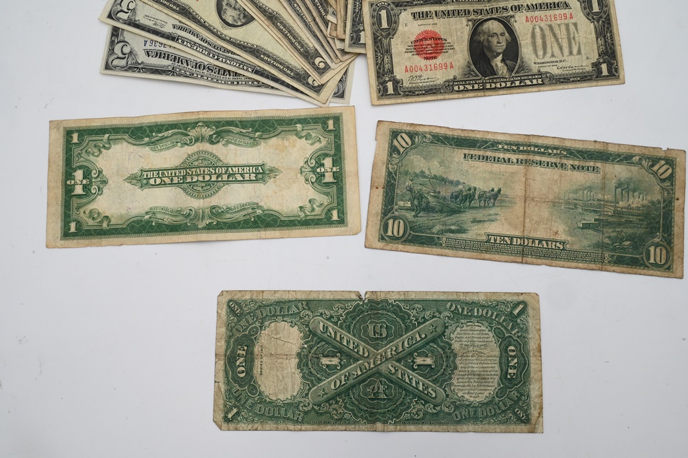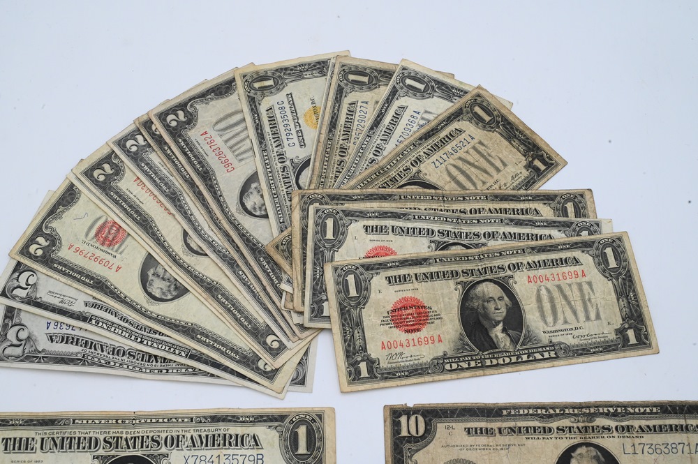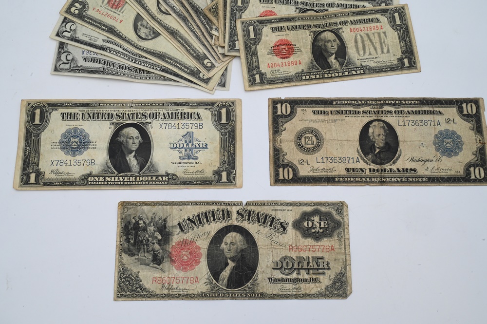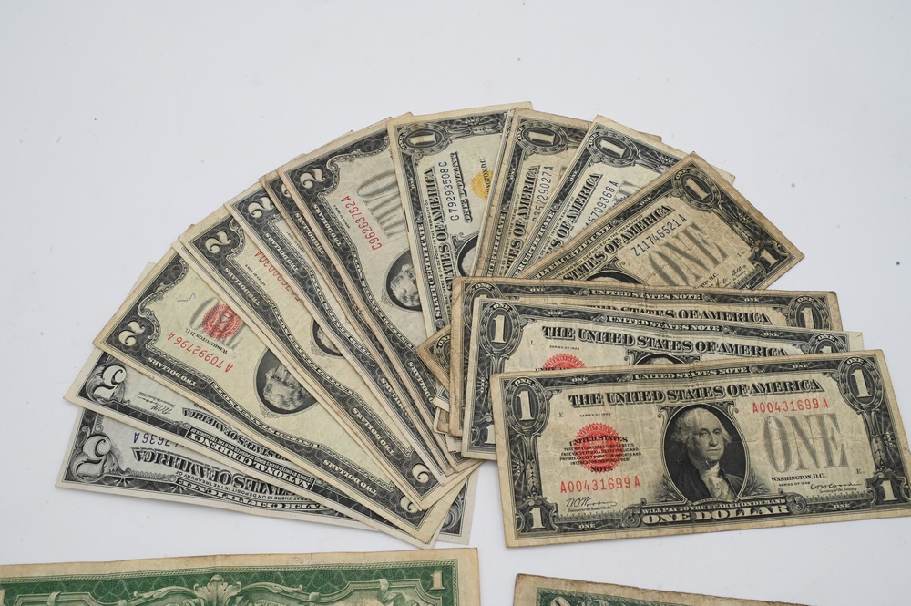 Large Lot of Currency, to include US small paper currency to include Friedberg 1500 three US one dollar notes, Woods and Woodin red seal “funny” back, series of 1928 “raggy”, G-VG, VG, and Fine; two 1928 one dollar silver certificates 17’s, one rag and one VG; three series of 1934 one dollar silver certificates Julian Morgenthau; Friedberg 1602 series 1928B one dollar silver certificate Woods and Mills; Friedberg 2300 series 1935A one dollar silver certificate World War II emergency issue yellow seal; six two dollar US notes to include Friedberg 1505 1928 – D, Friedberg 1506 1928 – E; Friedberg 1507 1928 – F, Friedberg 1508 1928 – G. Friedberg 1509 1953; Friedberg 1511 1953 – B; two 5 dollars silver certificates to include series of 1929 Federal Reserve of New York 1850 – B, fine; along with series of 1934 – A Friedberg 2302 silver certificate no. Africa yellow seal.