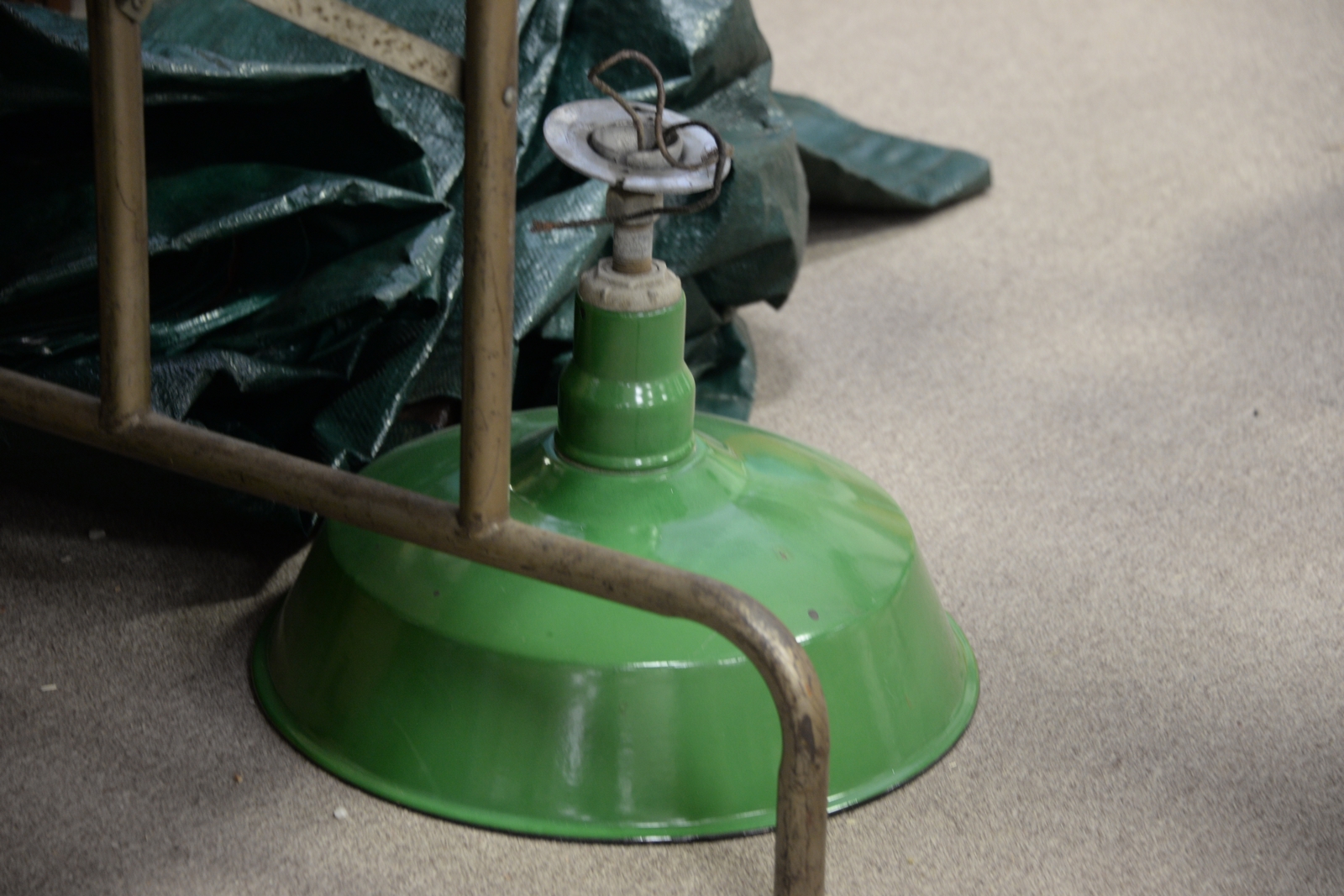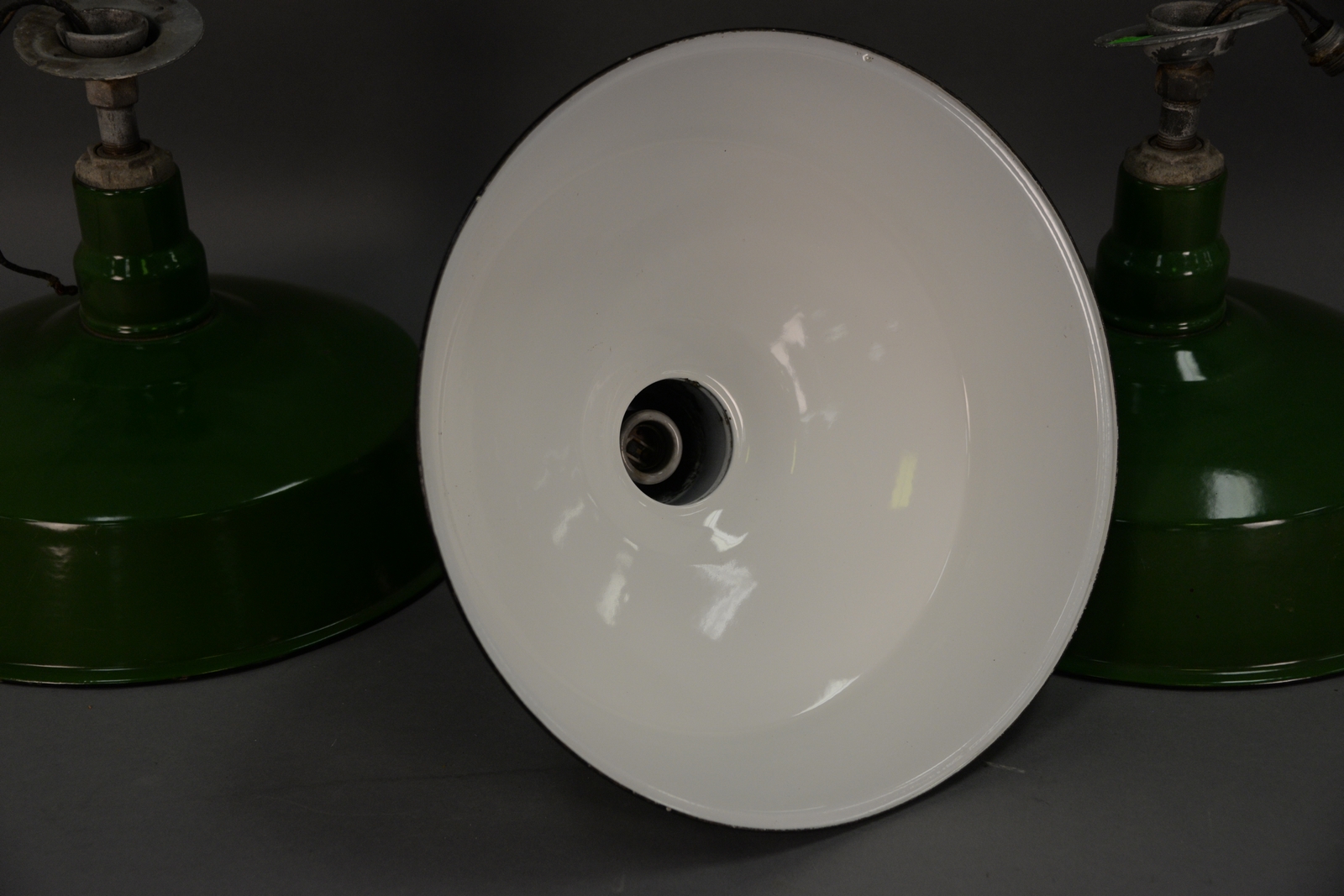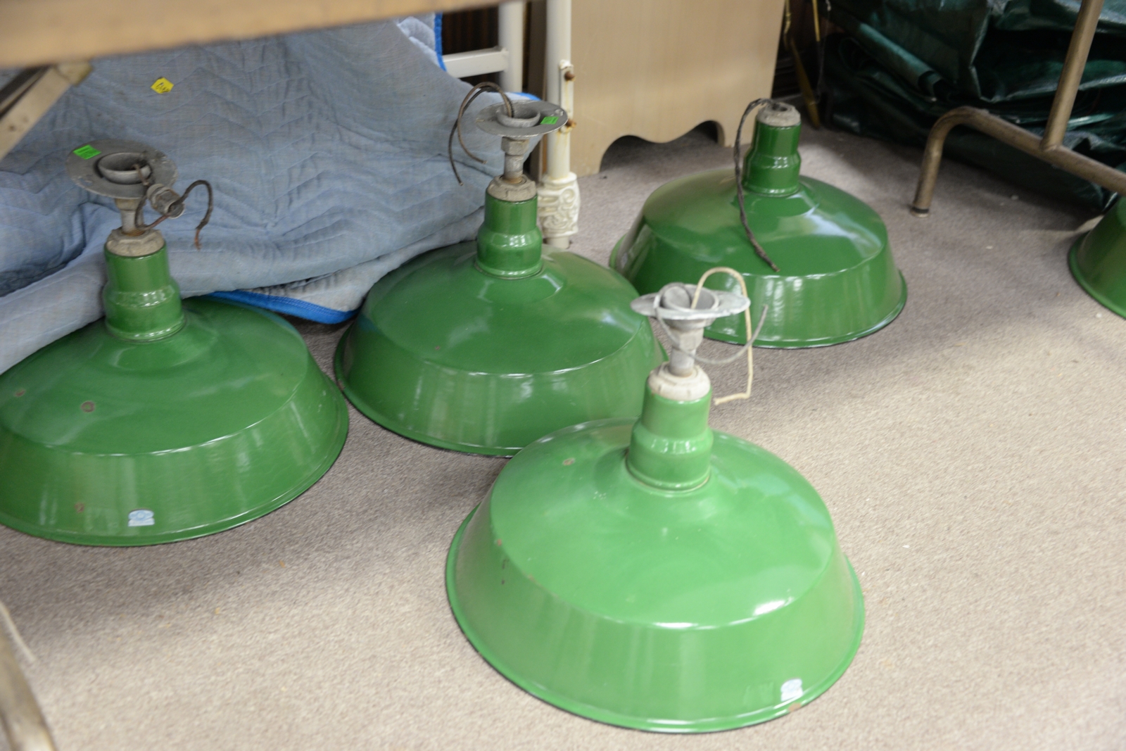 Nine industrial lammps, Union Made. ht. 14in., dia. 16 1/4in.