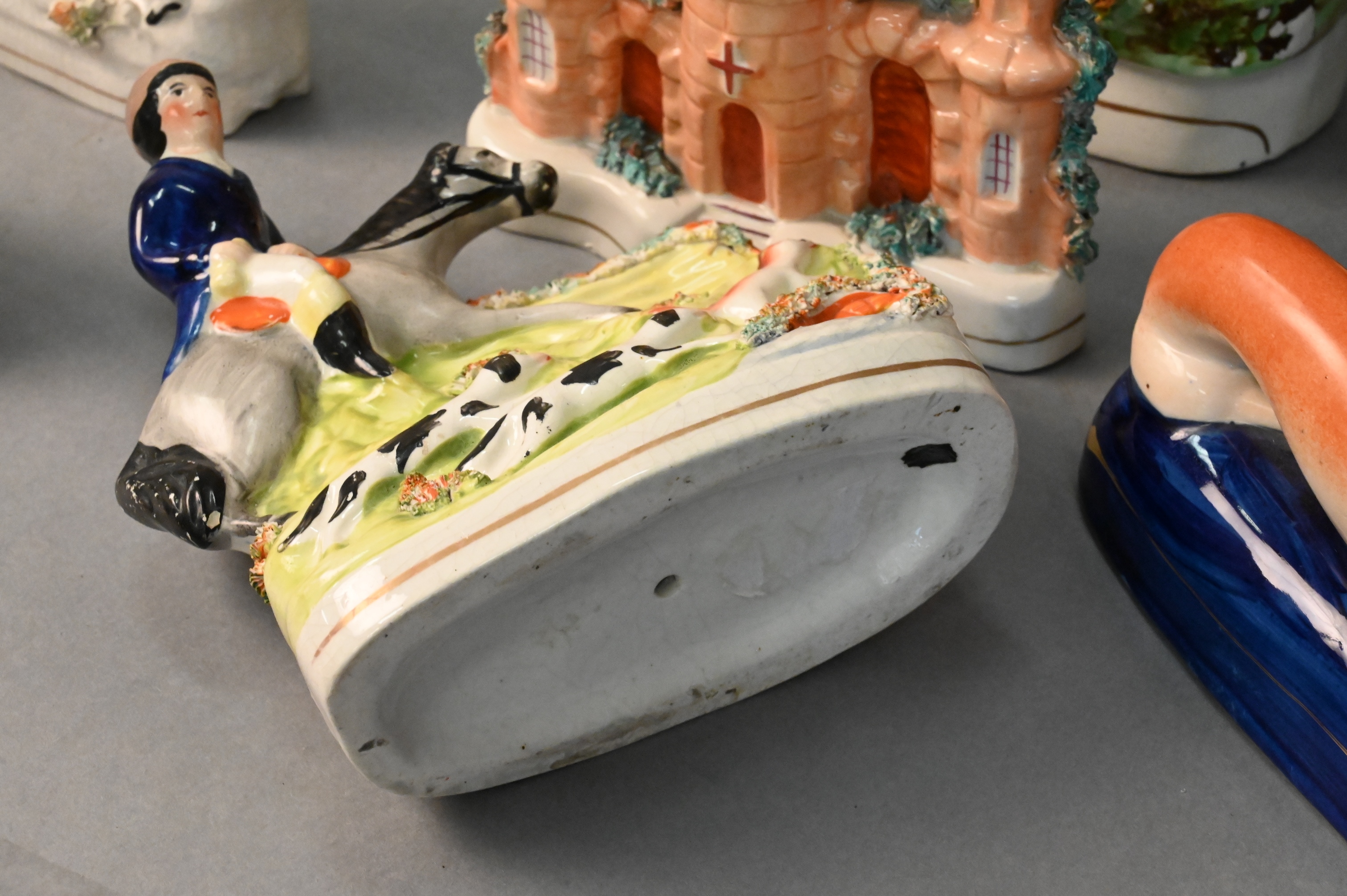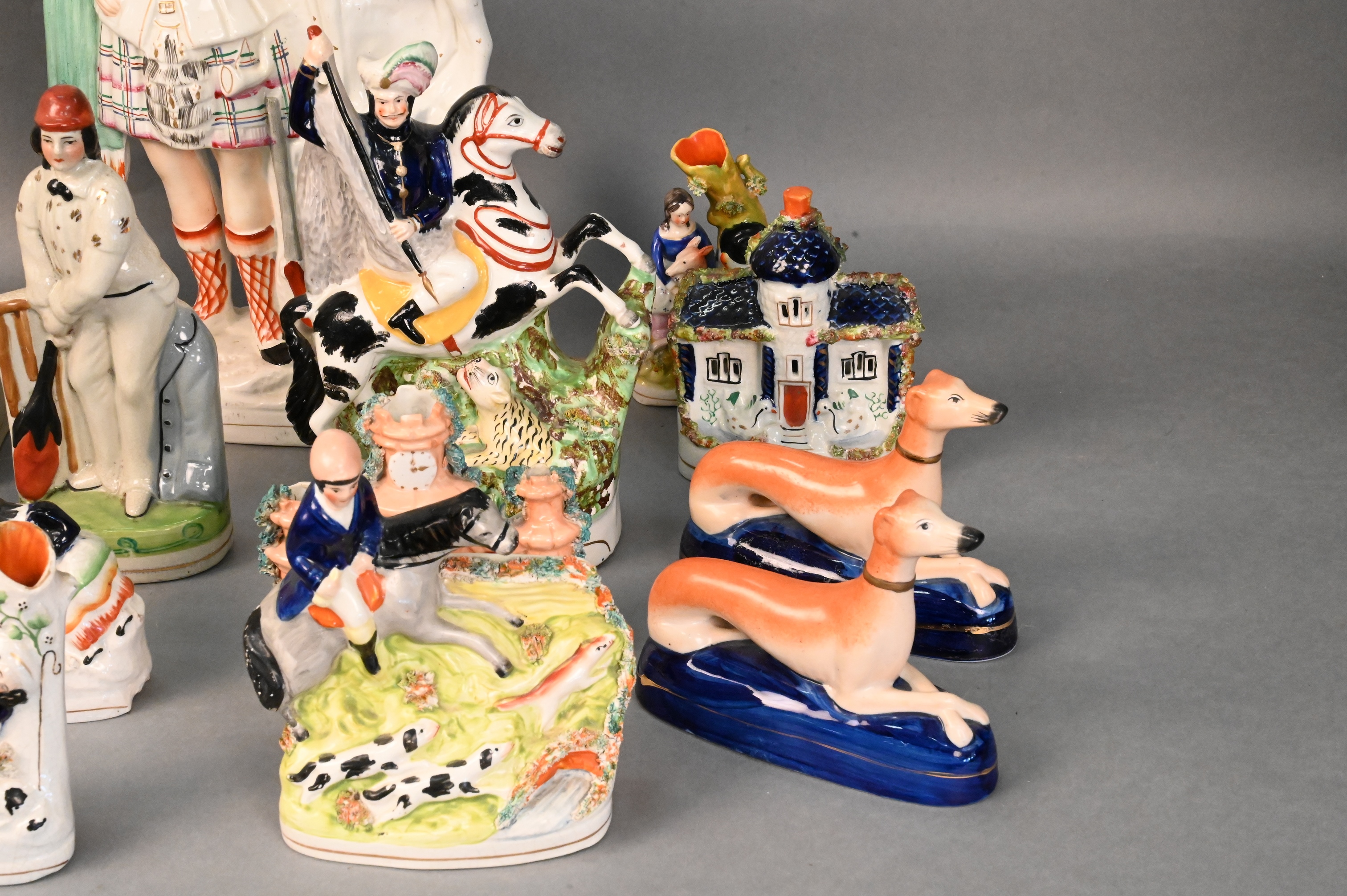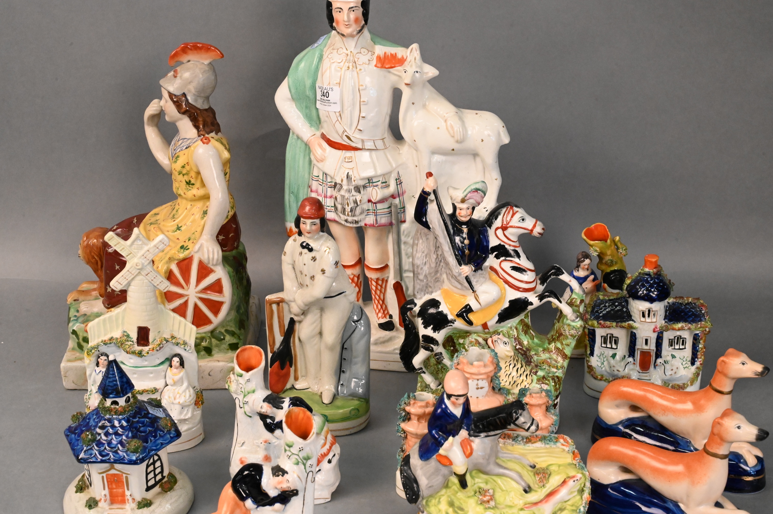 to include four buildings, marriage windmill, castle, estate and round cottage, pair of recumbent grey hounds, chicket player, large “Brittannia” female figure and lion, large Scottish men in kilt with deer, pair of sleeping shepherd spill vases one of a man with a dog, one of a woman with a calf, spill vase with a woman and deer, fox hunt scene of a man on horse with two dogs chasing foxes, and a man on horseback hunting a leopard