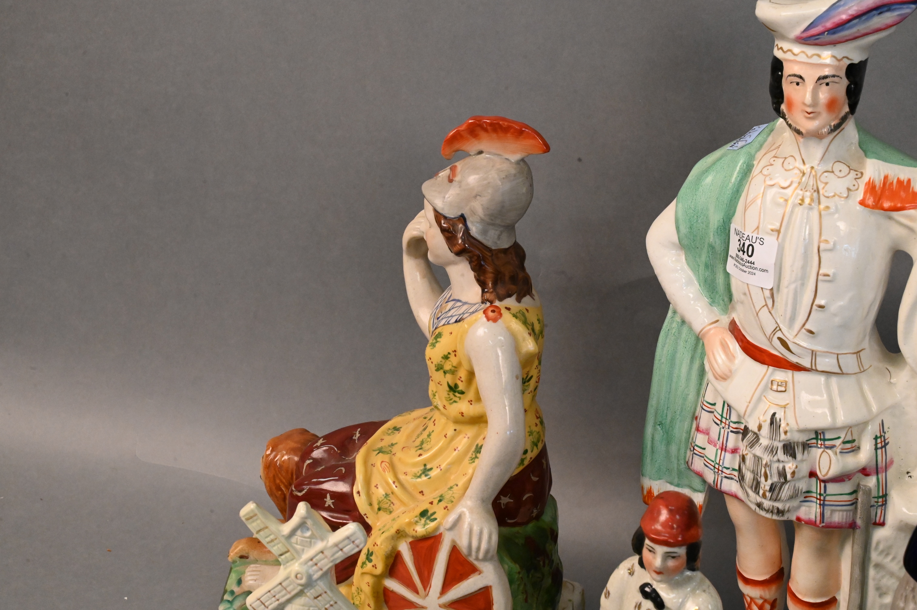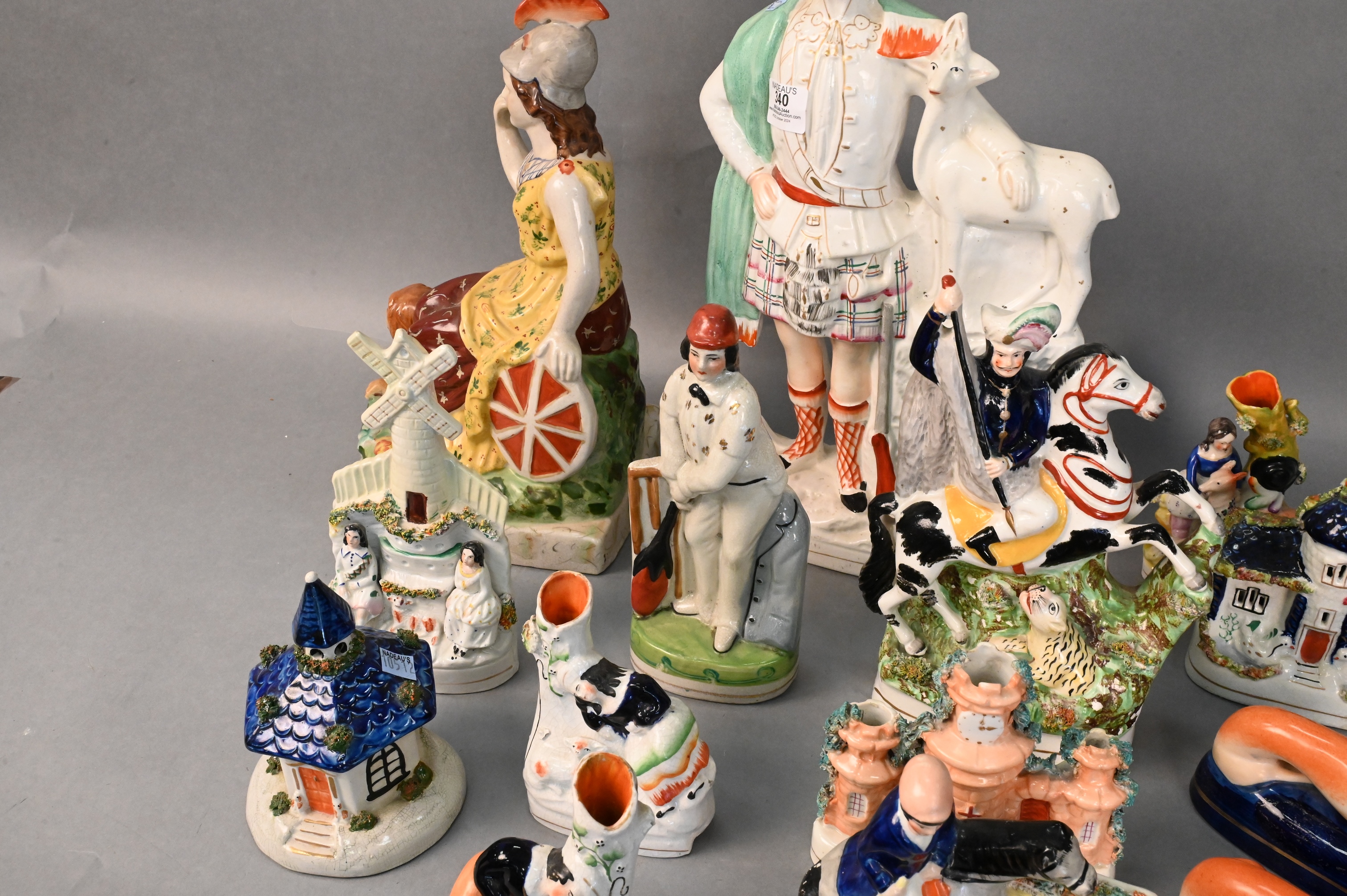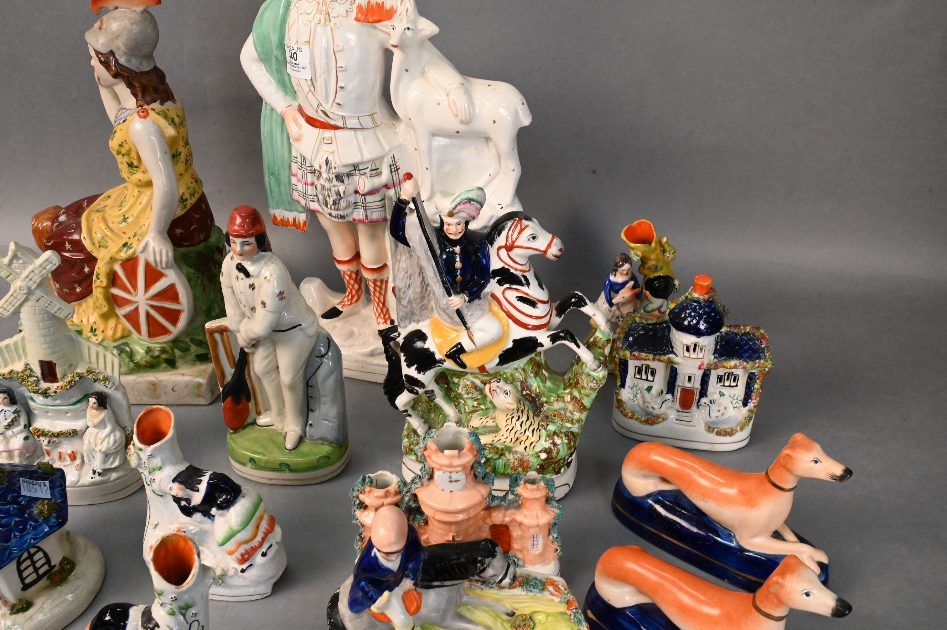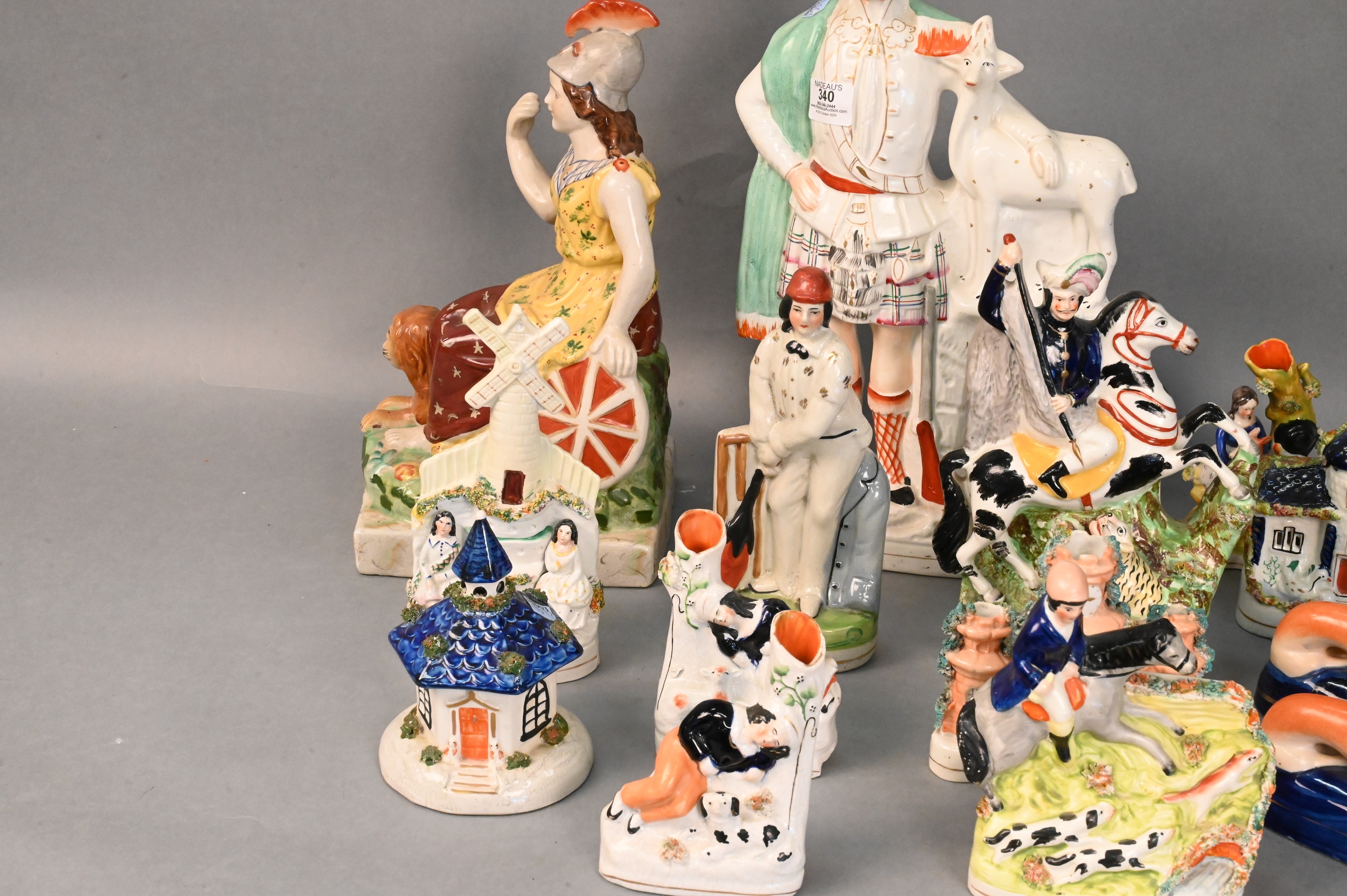 to include four buildings, marriage windmill, castle, estate and round cottage, pair of recumbent grey hounds, chicket player, large “Brittannia” female figure and lion, large Scottish men in kilt with deer, pair of sleeping shepherd spill vases one of a man with a dog, one of a woman with a calf, spill vase with a woman and deer, fox hunt scene of a man on horse with two dogs chasing foxes, and a man on horseback hunting a leopard