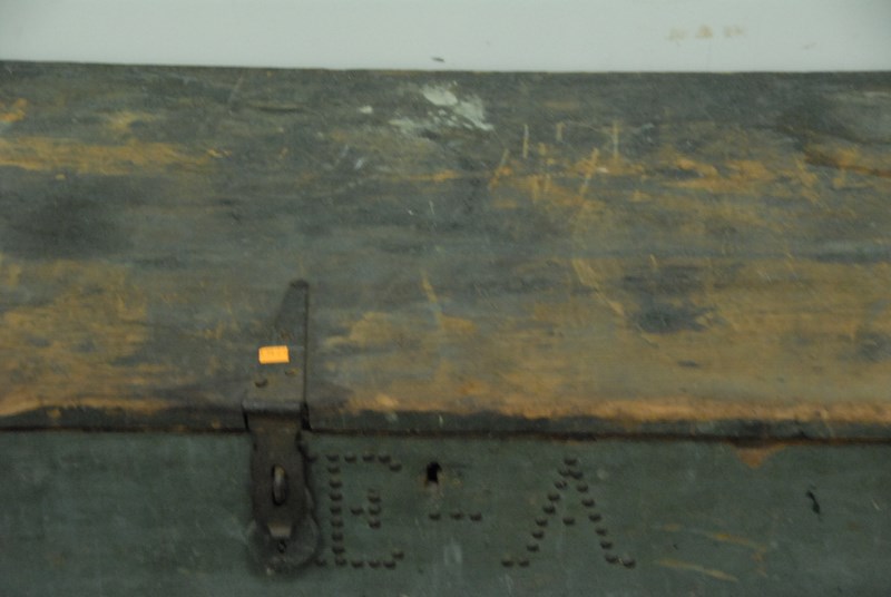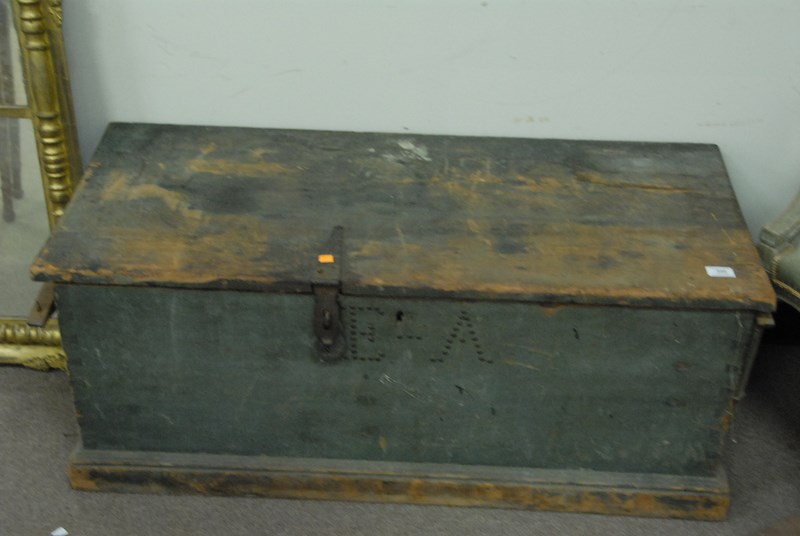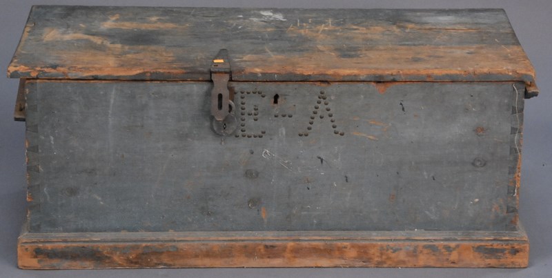 Primitive six board chest in blue paint, lg. 43in. ht. 18in.