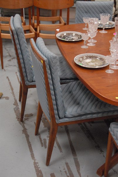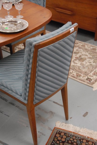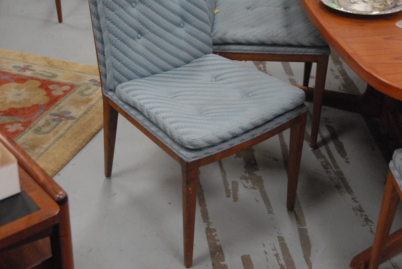 Widdicomb style set of six walnut dining chairs with blue upholstery.