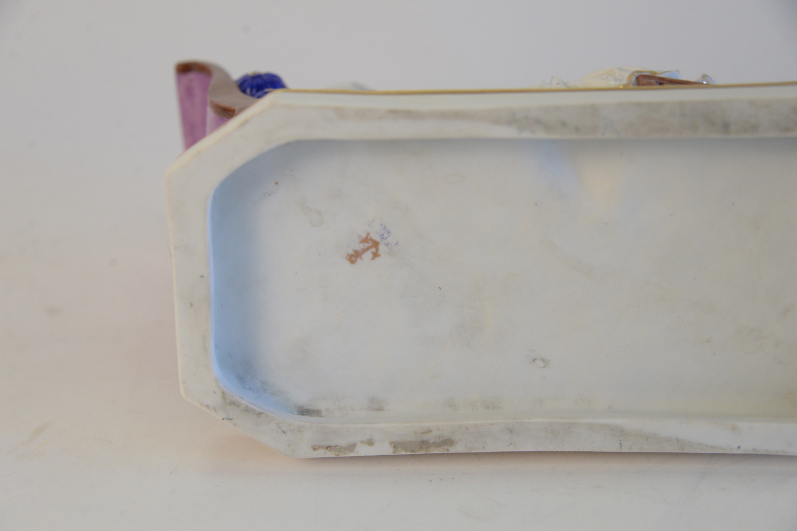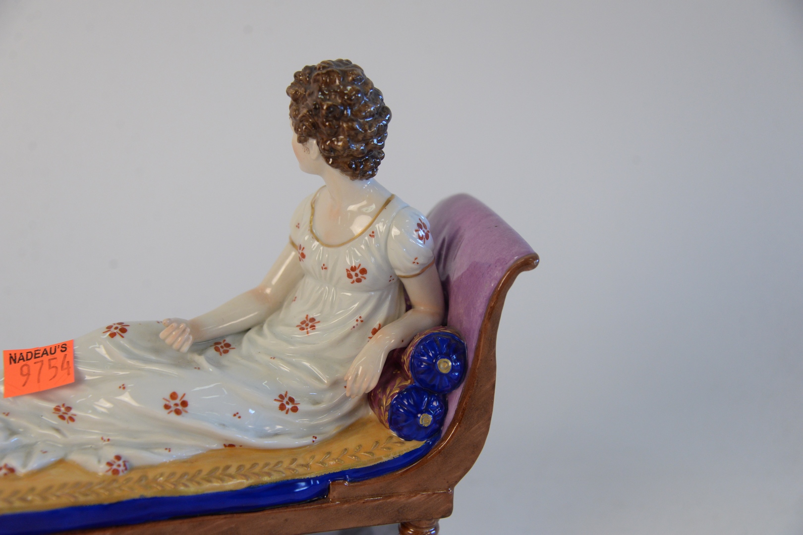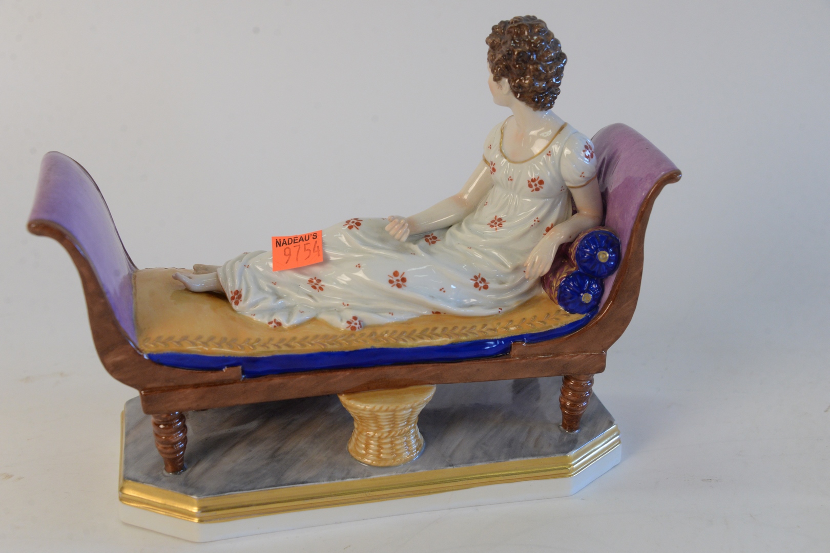 Lot 341: Chelsea Porcelain Recamier Figure, and reclining woman marked with gold anchor, height 7 inches, length 9 inches.