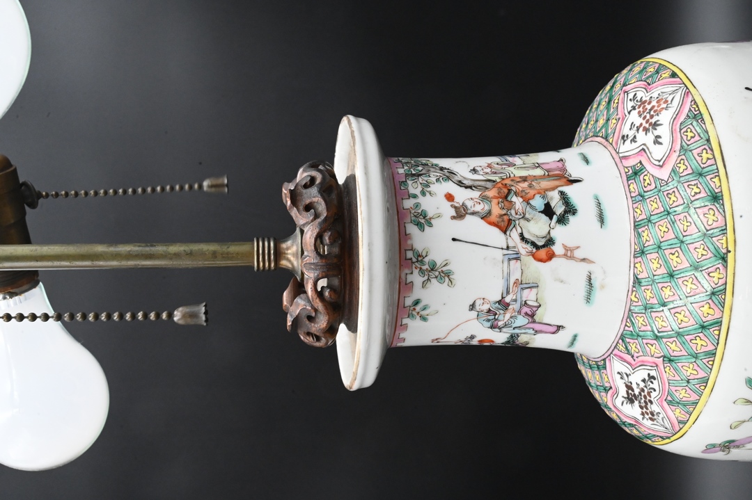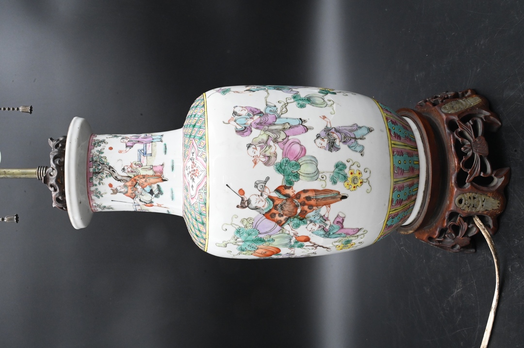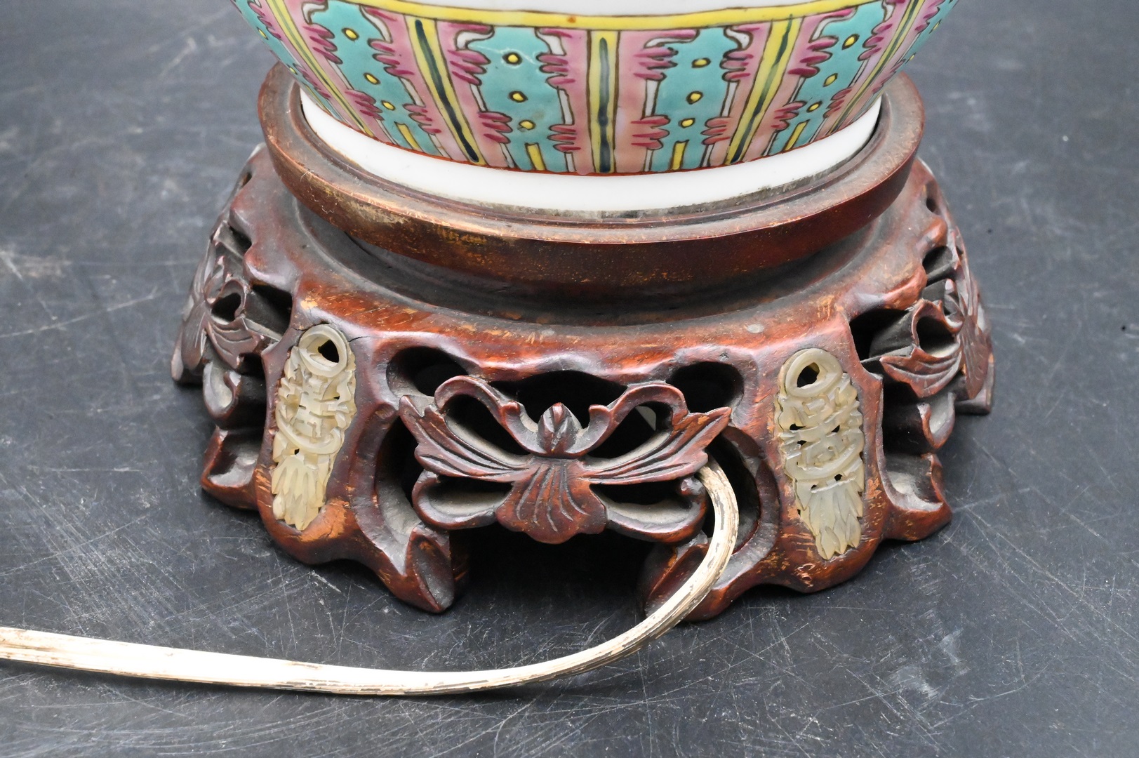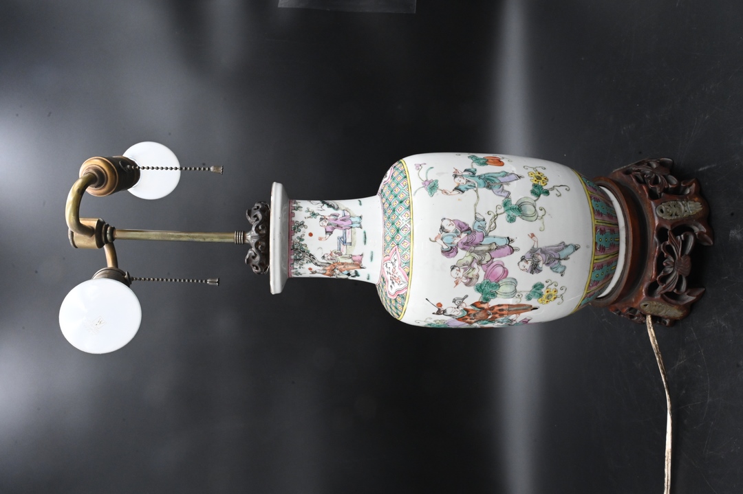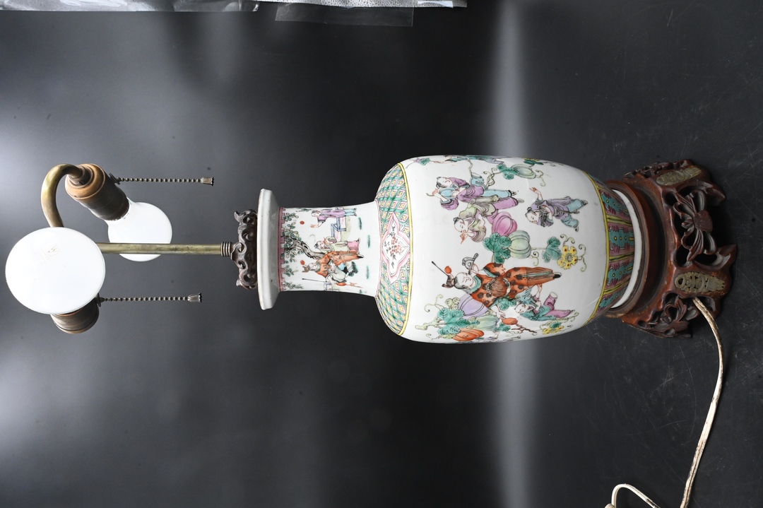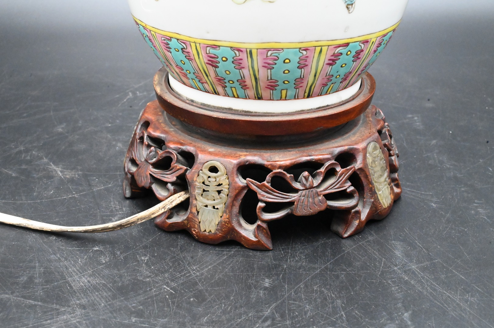 Chinese Famille Rose Porcelain Vase, having painted figures on carved wood base, mounted with stone plaques, total height 23 inches, vase height 12 1/2 inches, Provenance: Estate of Peter Tillou, Litchfield, Connecticut.