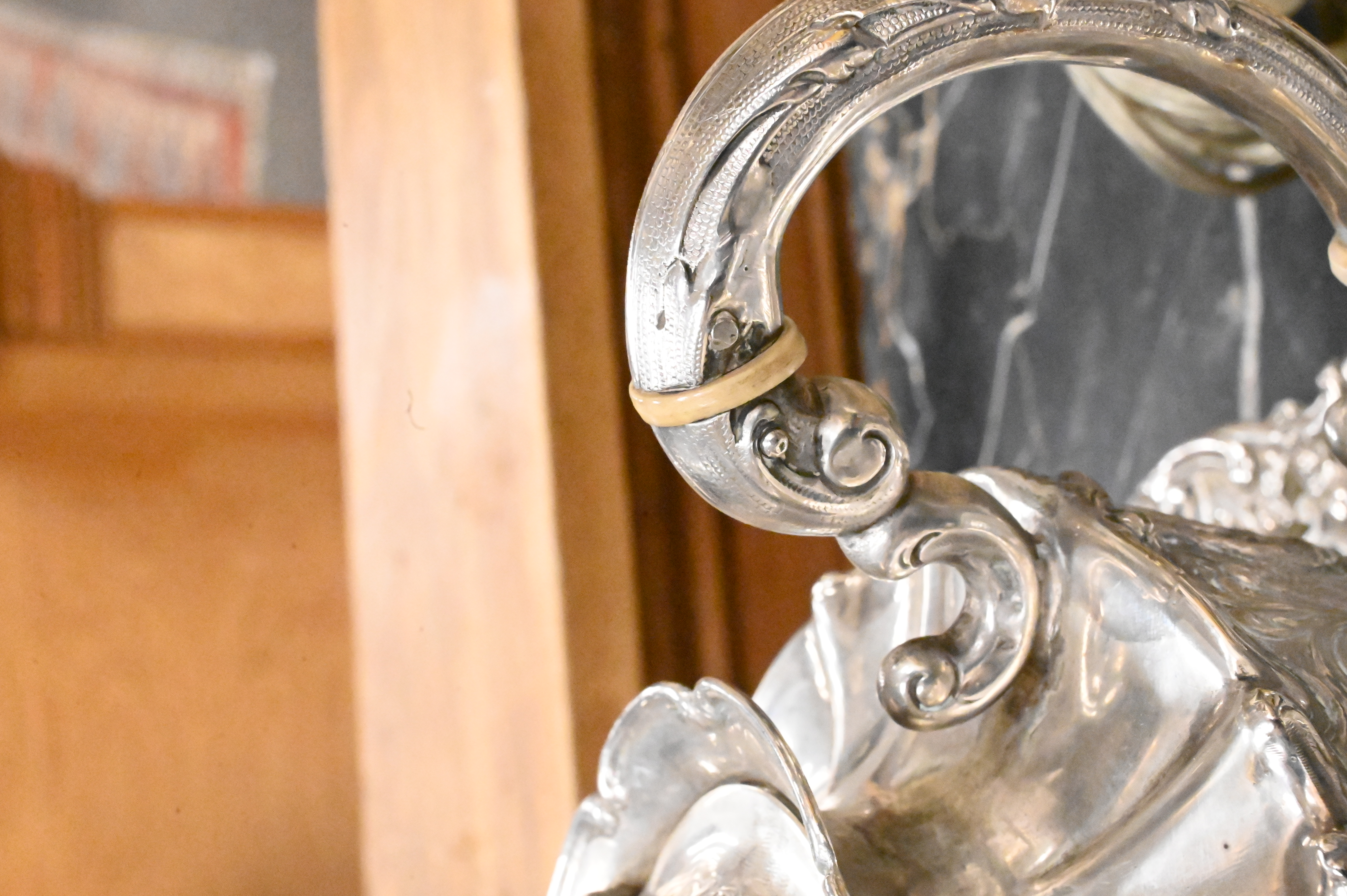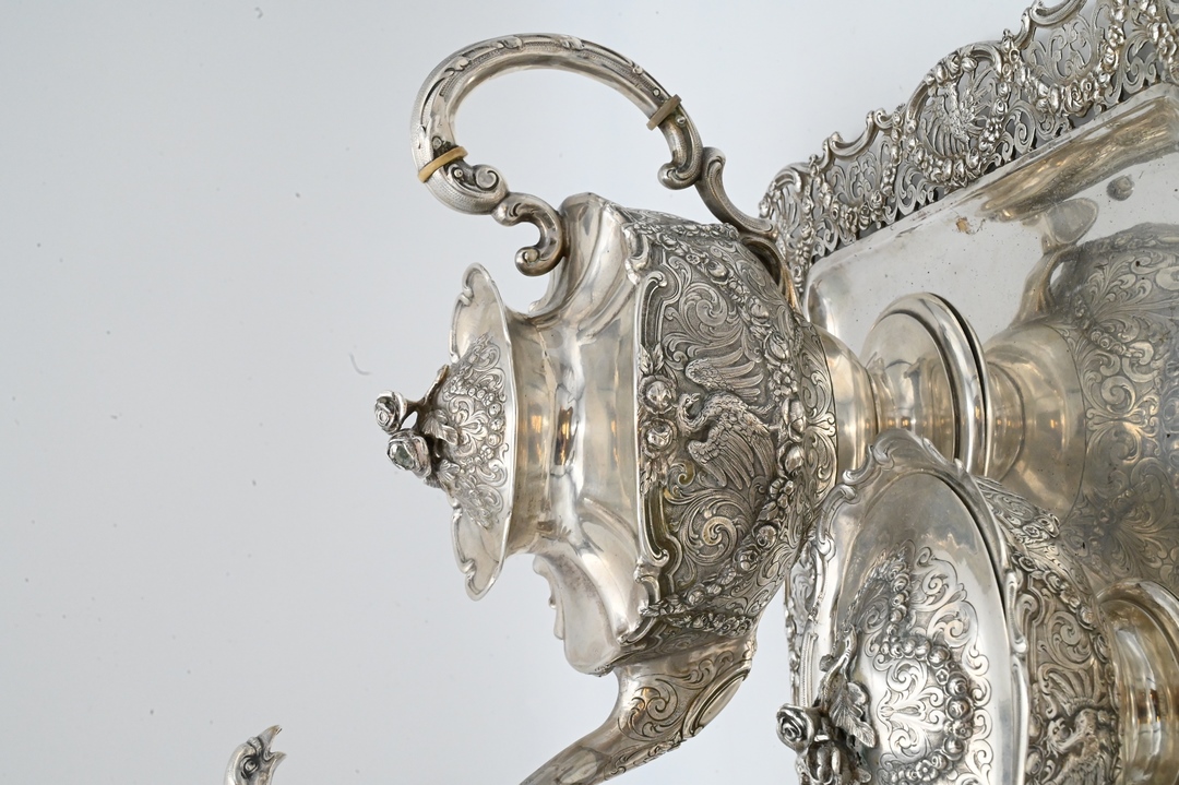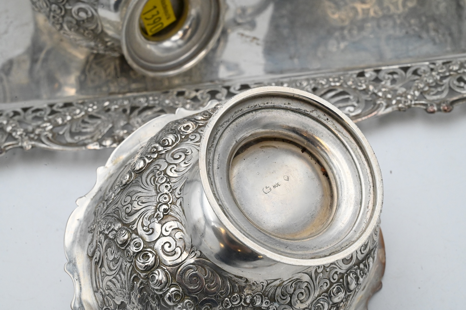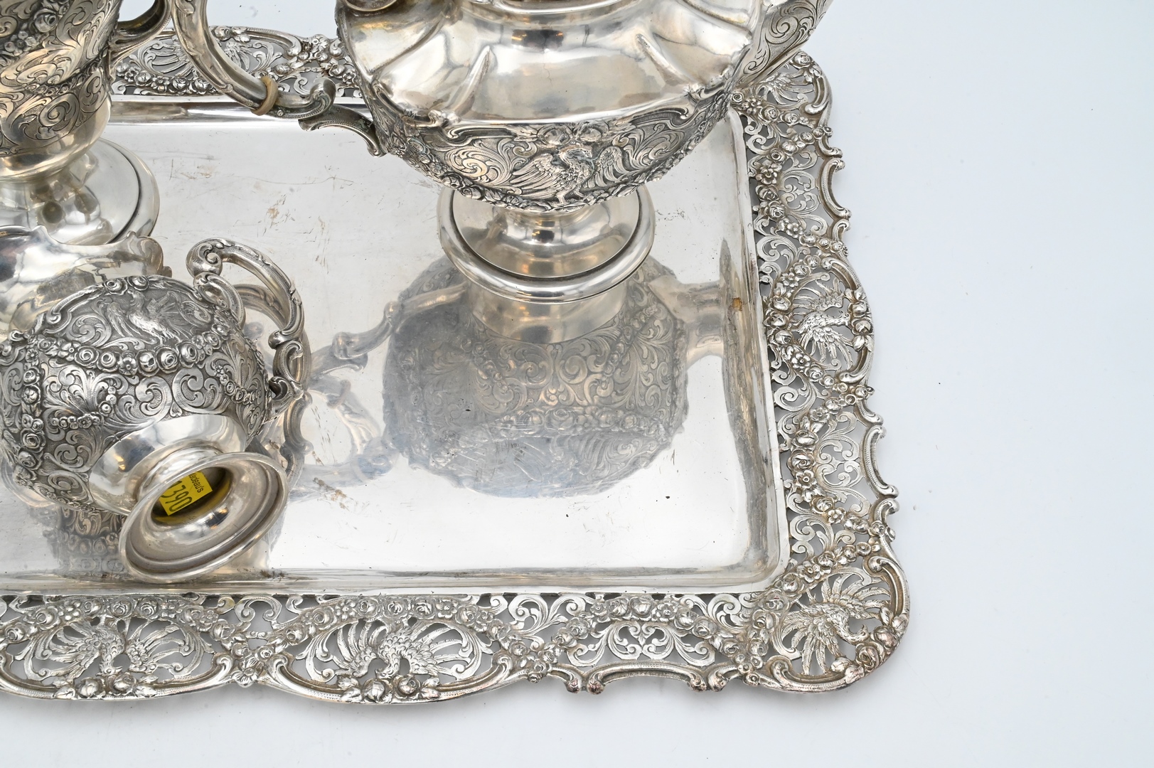 teapot height 11 inches, tray 12 1/2″ x 17″, 106 t.oz.