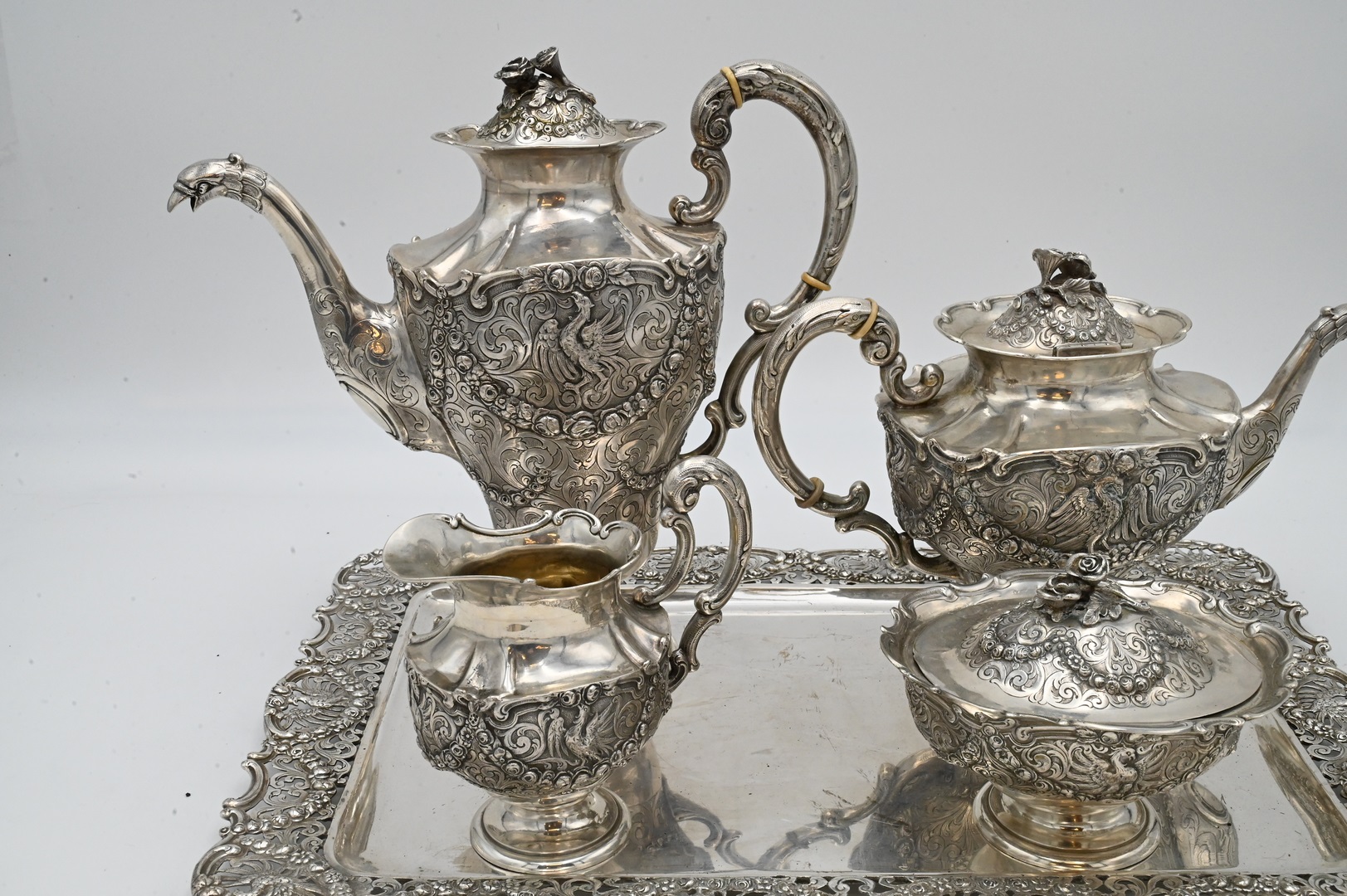 to include teapot, coffee pot, sugar, creamer, along with tray, all having bird motif