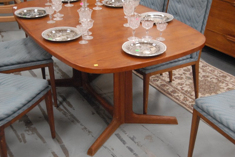 Lot 341: Danish teak dining table with unusual cross stretcher on base, ht. 28 1/2in. lg. 64in. no leaves