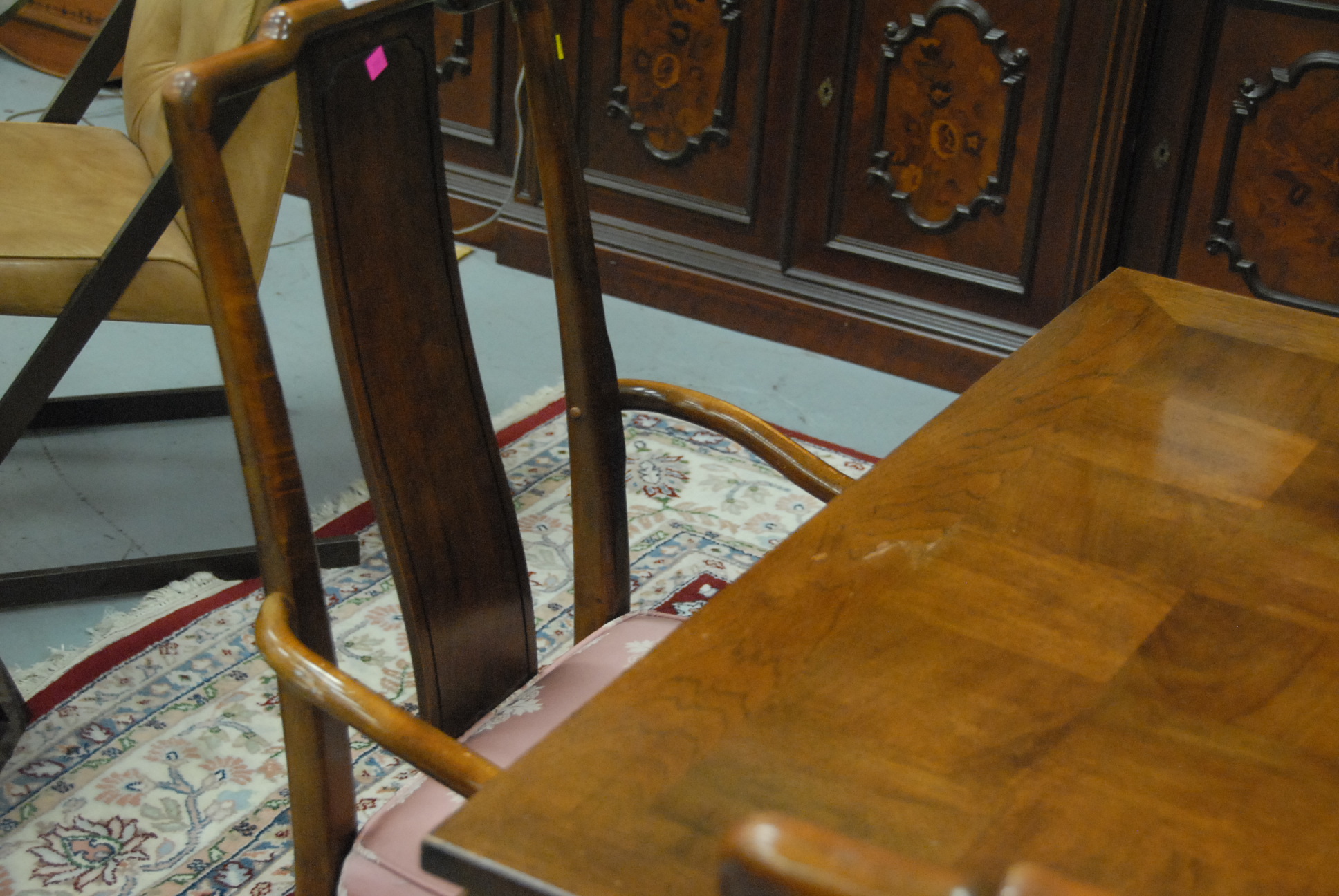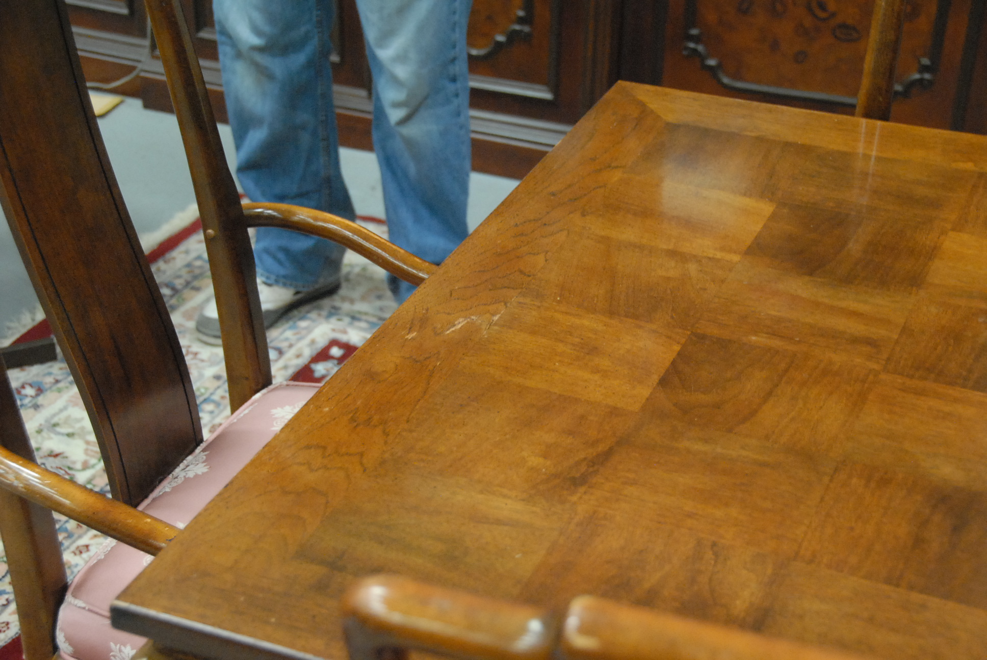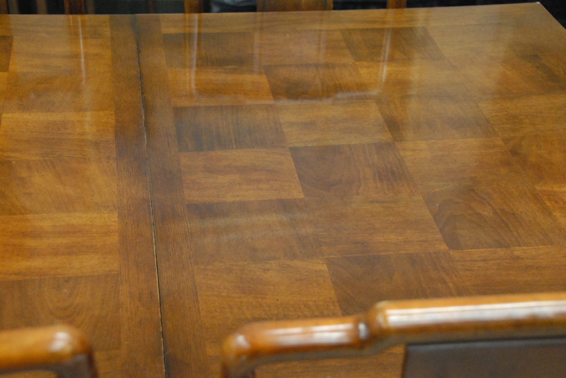 Dining room table with two leaves and six chairs, top: 60 x 40 leaves 22in. each.