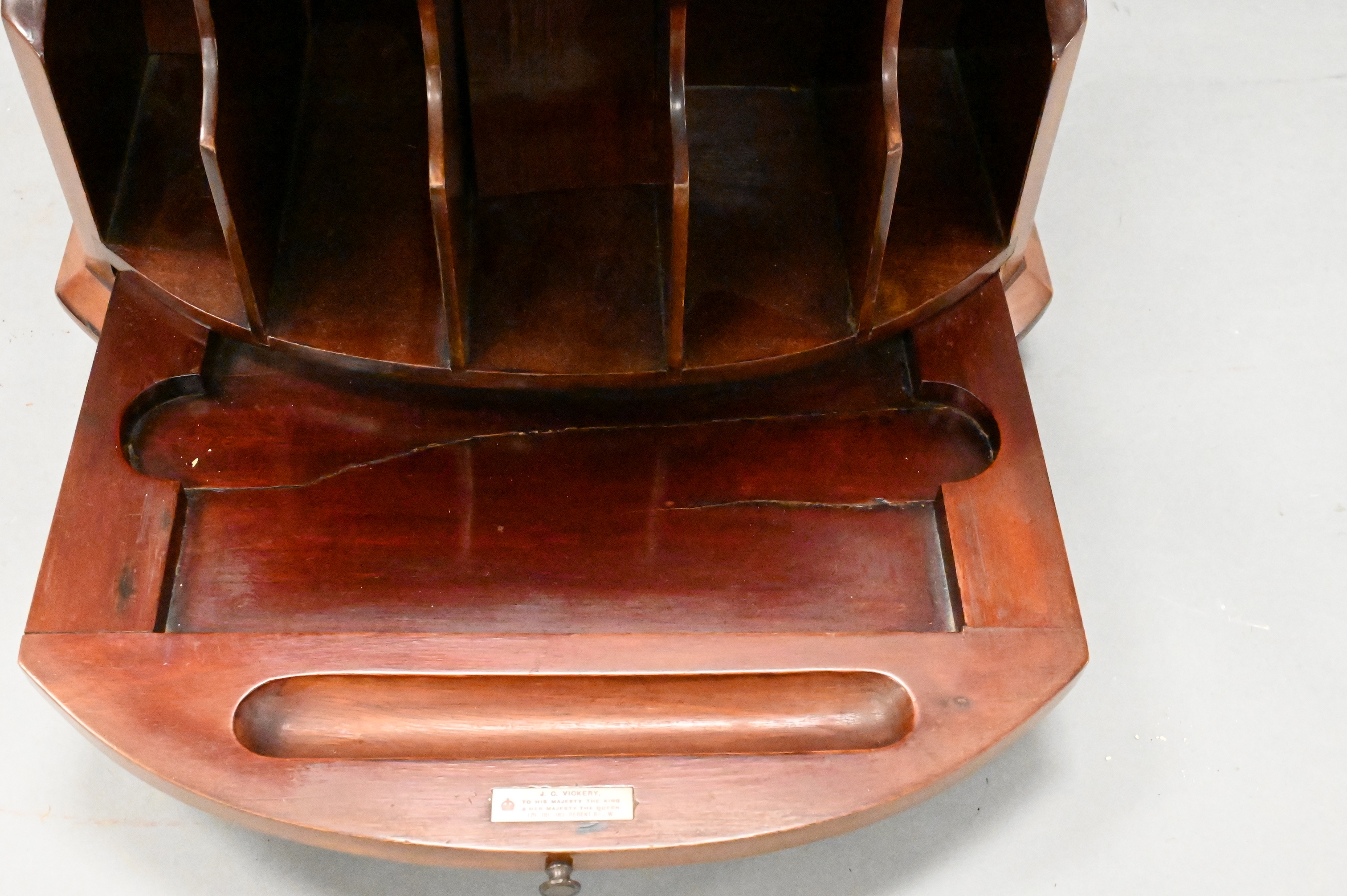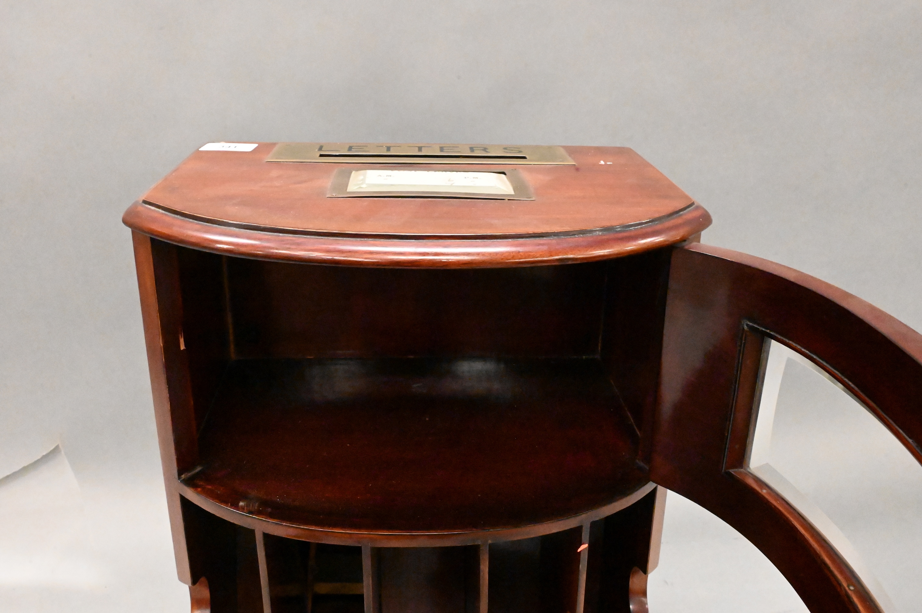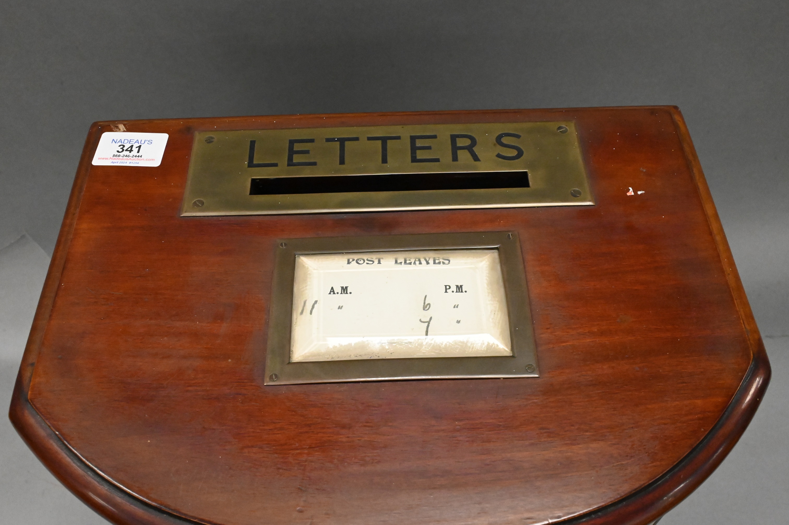 retailed and marked “J.C. Vickery, London, to His Majesty the King and Her Majesty the Queen, 179, 181, 183 Regent Street W.” having brass plaque marked letters on top, curved door with beveled glass over letter holder and pull out slide, with brass wall mount