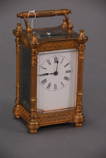 Lot 341: French brass and glass carriage clock, small chip lower left front dial plate, ht. 6in. wd. 3in.