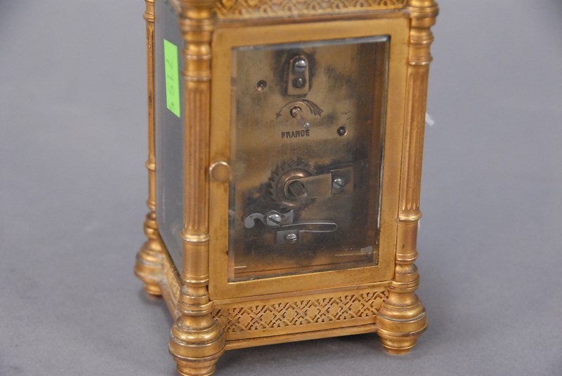 French brass and glass carriage clock, small chip lower left front dial plate, ht. 6in. wd. 3in.