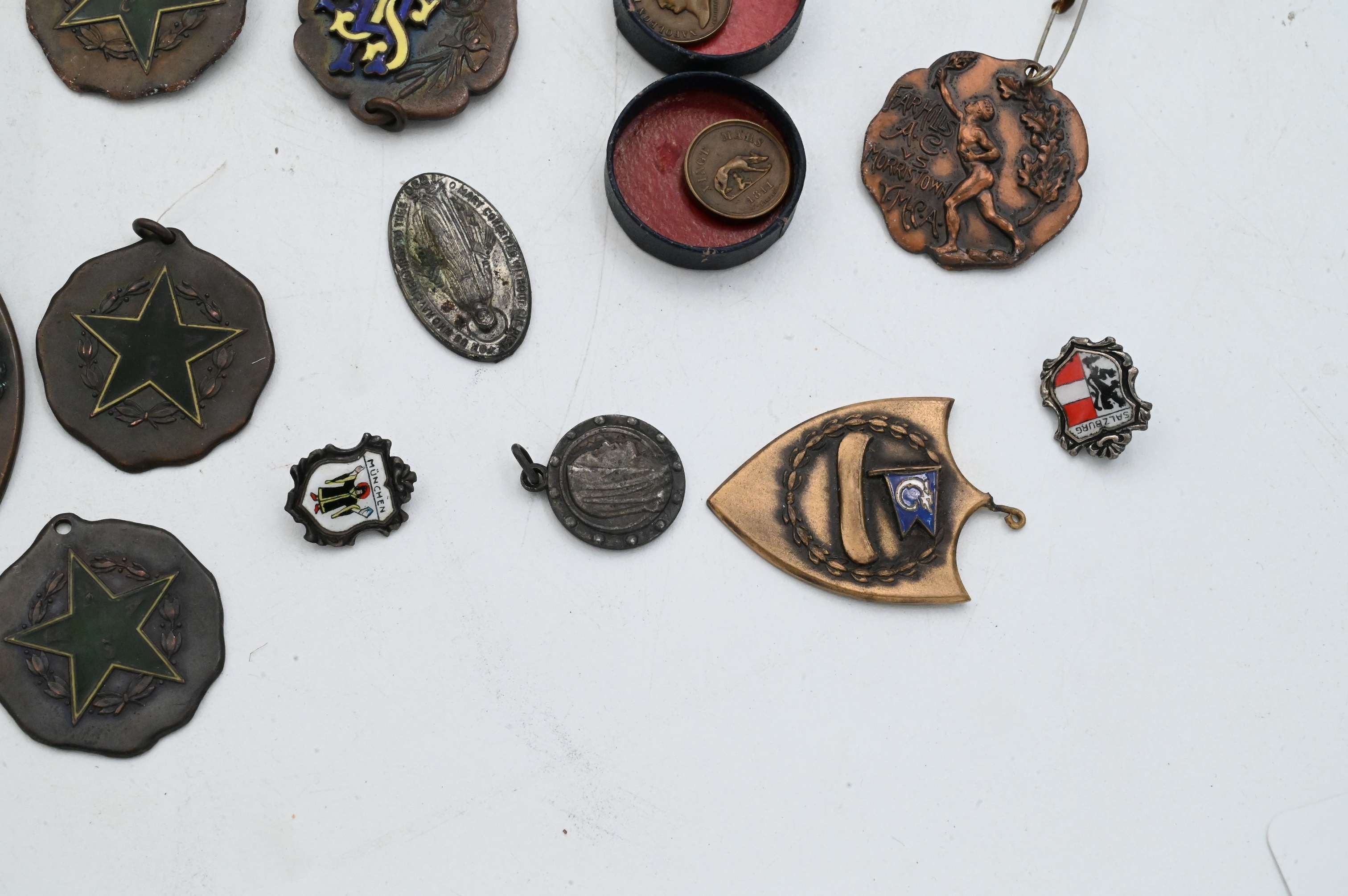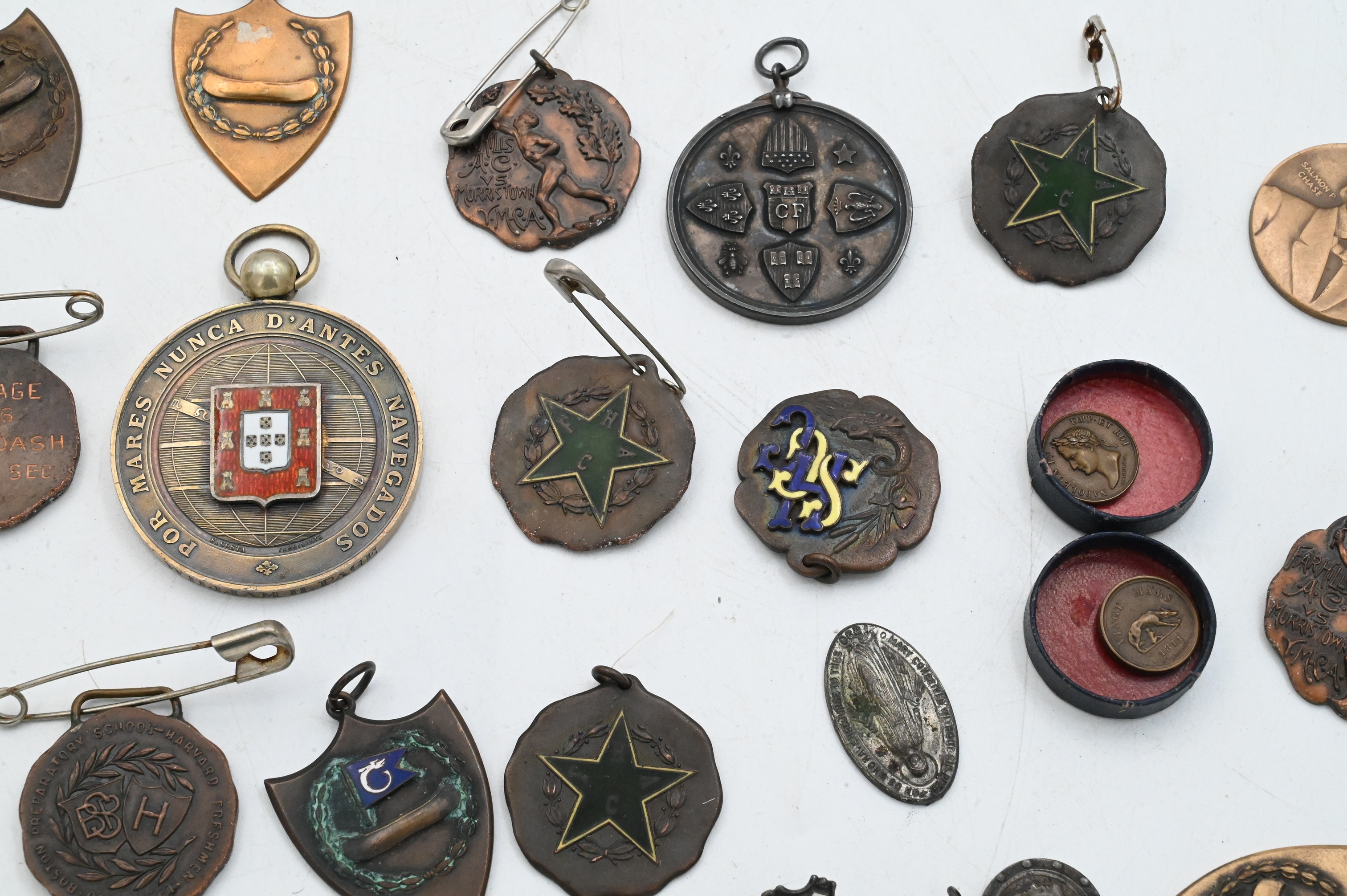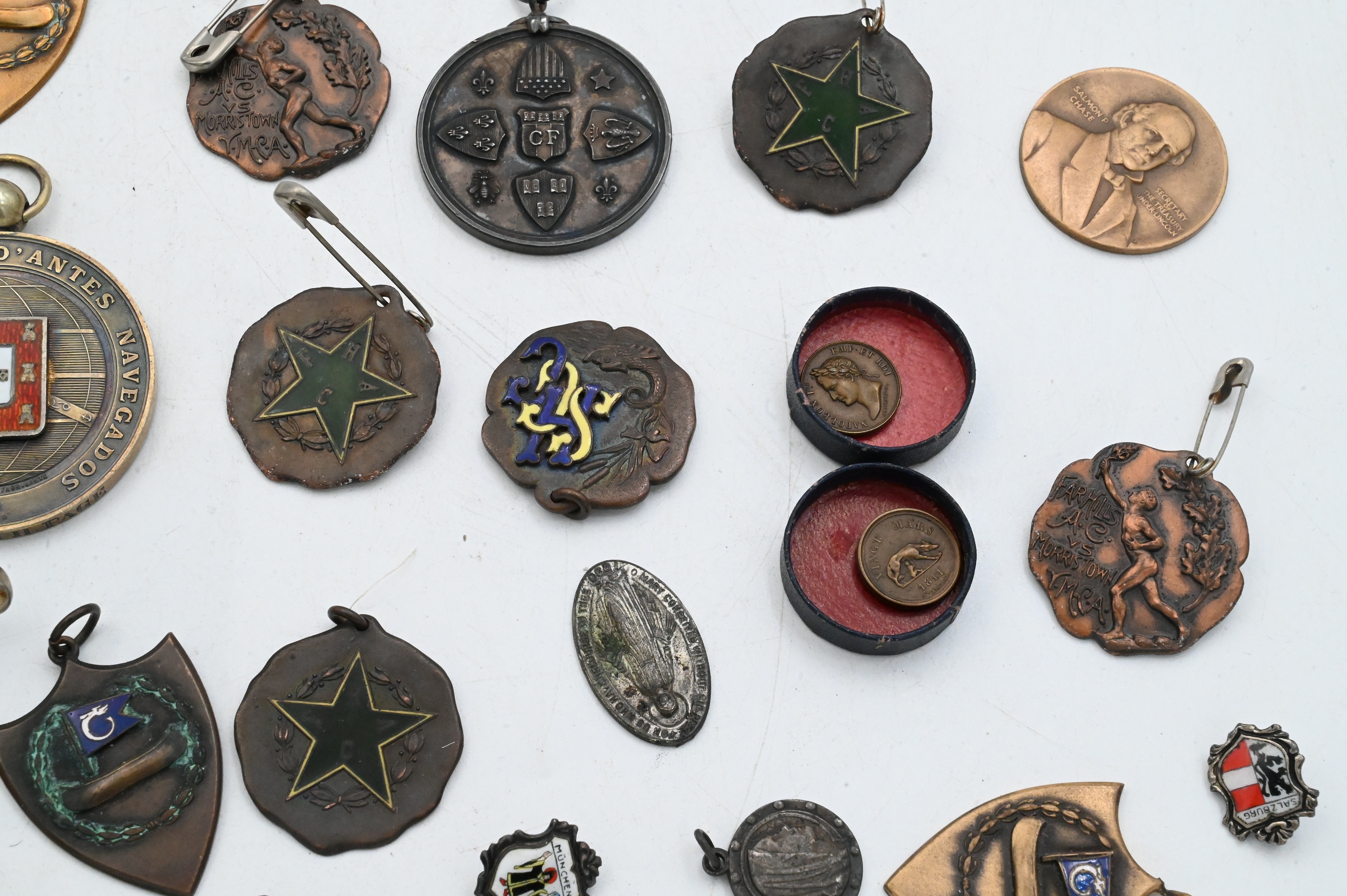 Including assorted European and American bronze and enameled medals and badges, such as a Sociedade de Geographia de Lisboa enameled bronze medallion by F. Costa in original case; Cercle Français de l’Université Harvard silvered bronze medal dated 1886 and inscribed “R.M. Page 1910,” also in original case; together with Napoleonic bronze medals, athletic and commemorative medals, and various enameled badges including Berlin, Salzburg, and München crests.