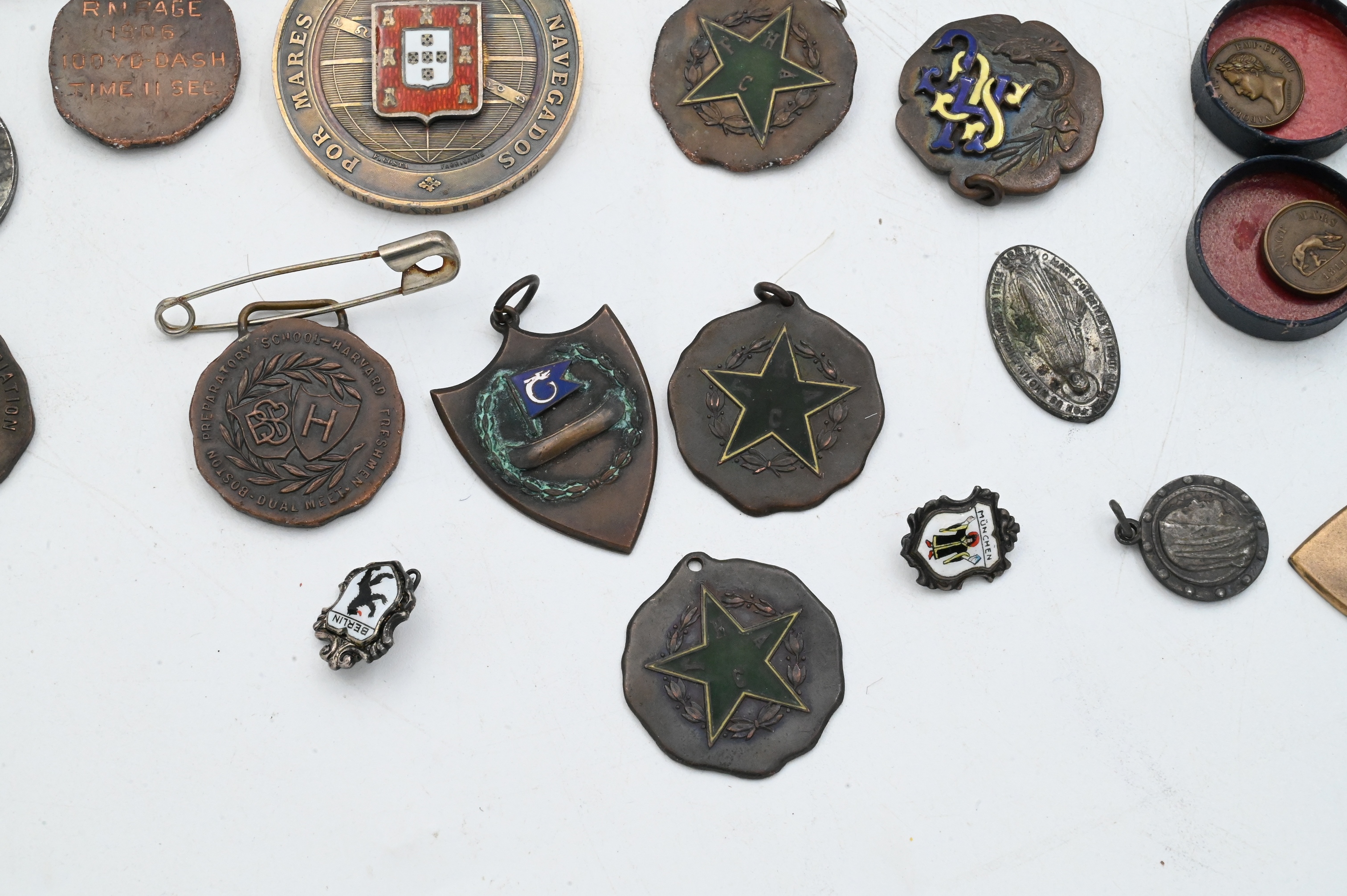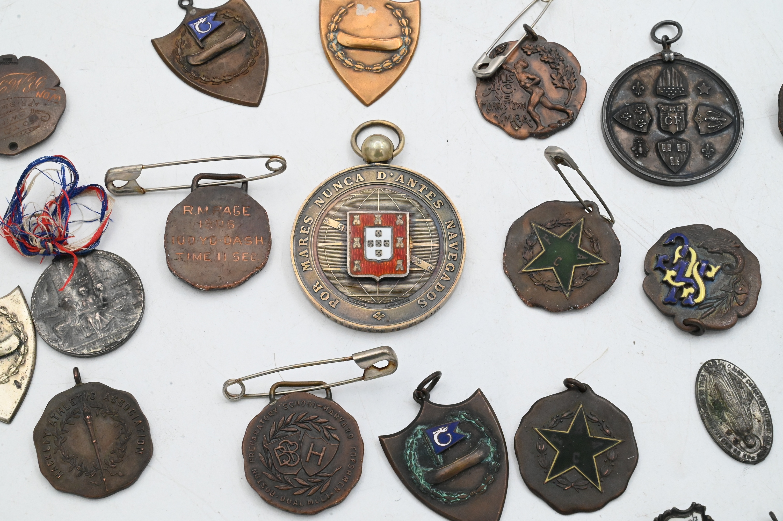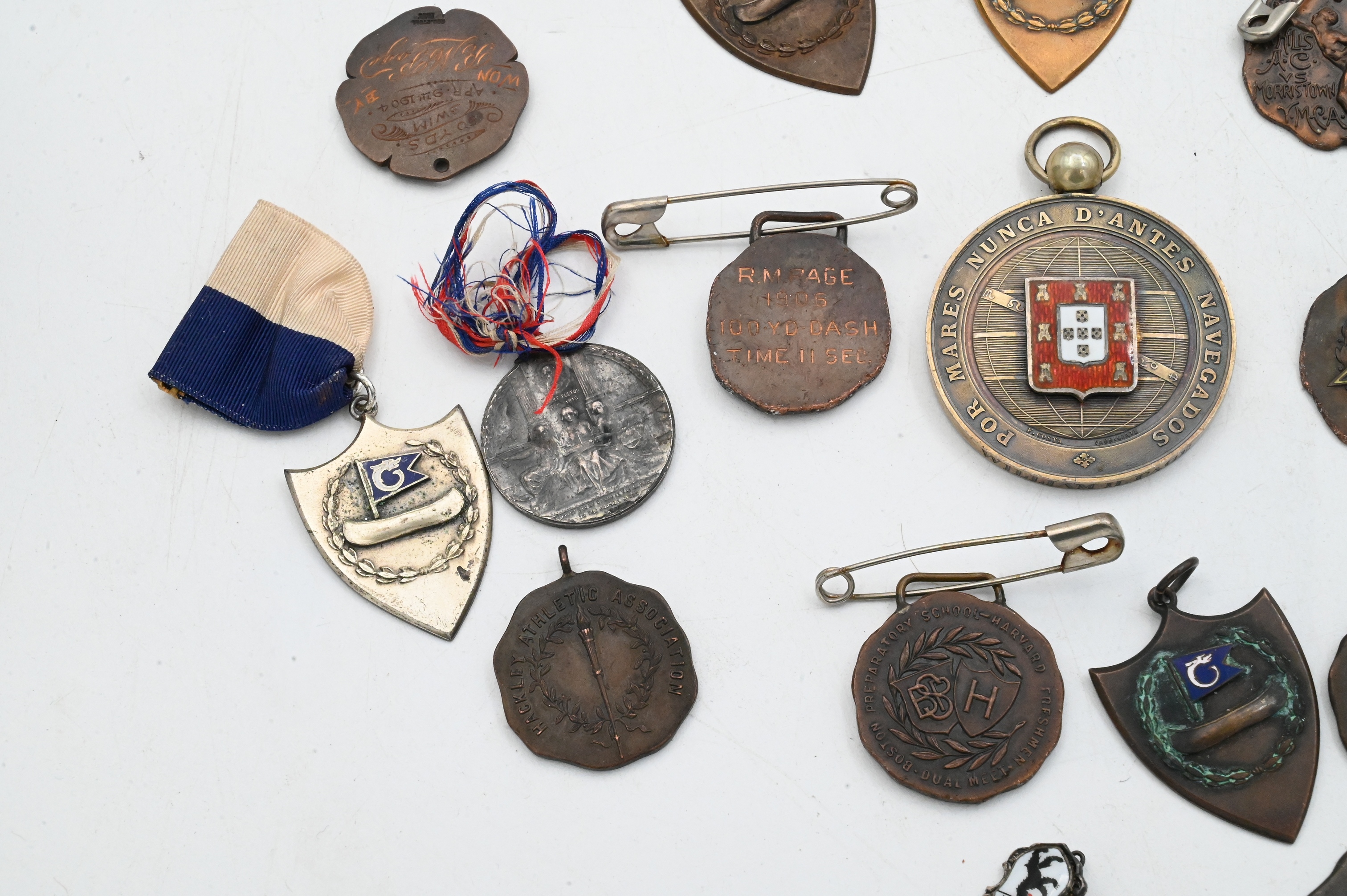 Including assorted European and American bronze and enameled medals and badges, such as a Sociedade de Geographia de Lisboa enameled bronze medallion by F. Costa in original case; Cercle Français de l’Université Harvard silvered bronze medal dated 1886 and inscribed “R.M. Page 1910,” also in original case; together with Napoleonic bronze medals, athletic and commemorative medals, and various enameled badges including Berlin, Salzburg, and München crests.