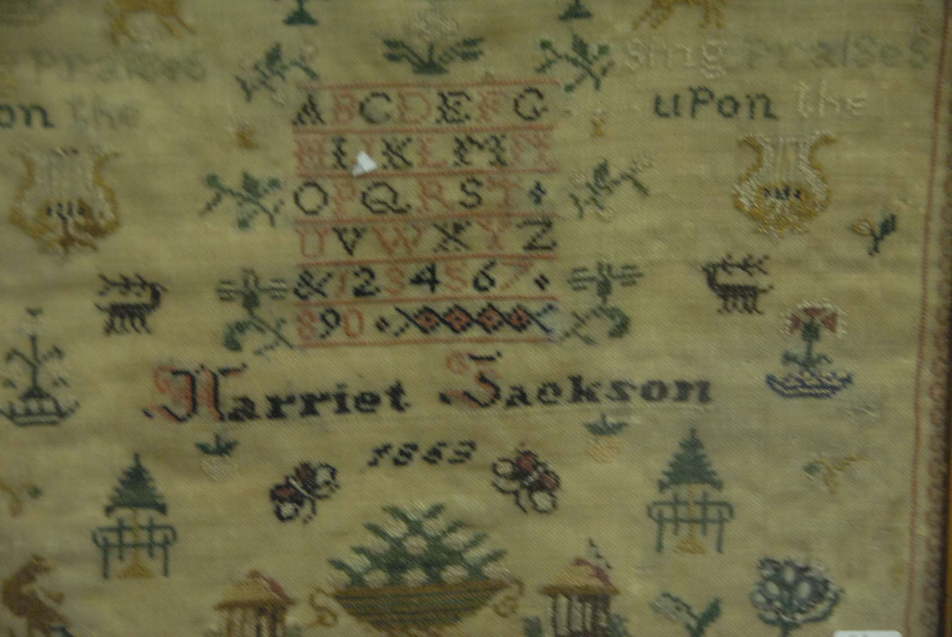 Harriet Jackson 1863 school sampler, 11 1/2 x 11 1/2.