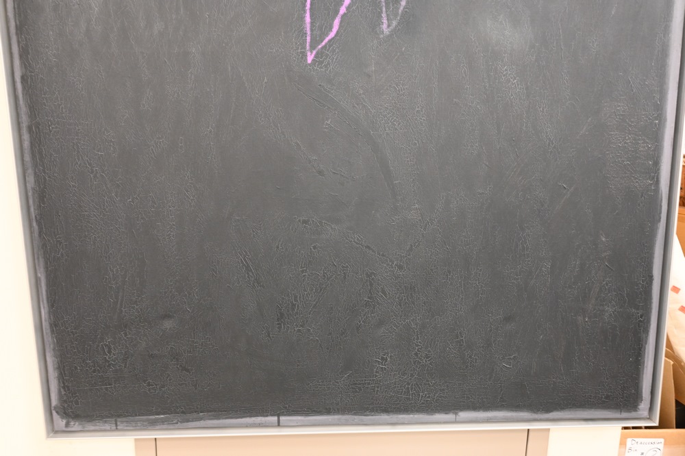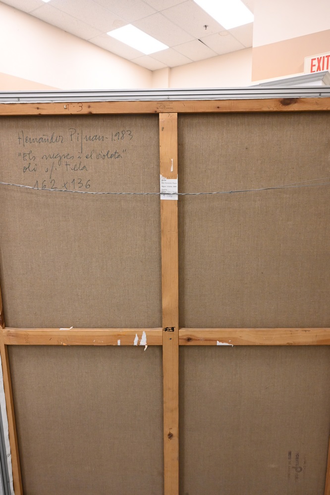 Joan Hernandez Pijuan (1931 – 2005), Els Negres i el Violeta, 1984, oil on canvas, titled and signed on back of canvas, Edict label on back and Galeria Joan Prats stamp, 51″ x 64″.