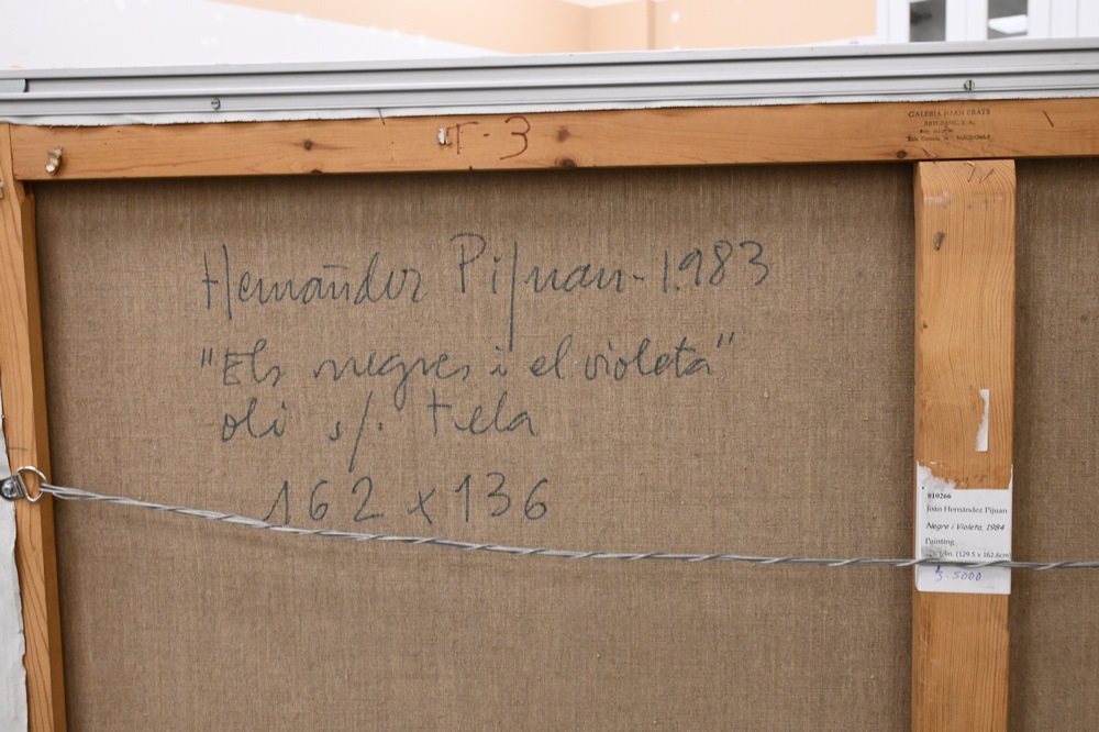 Lot 341: Joan Hernandez Pijuan (1931 – 2005), Els Negres i el Violeta, 1984, oil on canvas, titled and signed on back of canvas, Edict label…