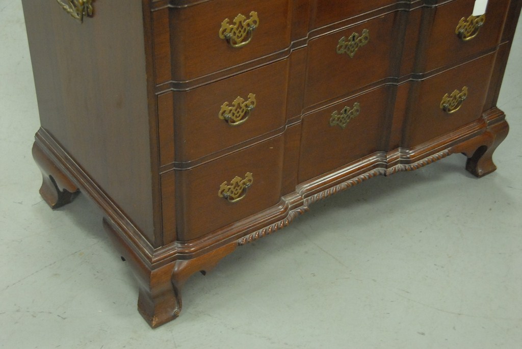 Lot 341: Margolis mahogany chest having triple shell carved block front with gadrooned base on ogee feet and large brass handles on sides, si…