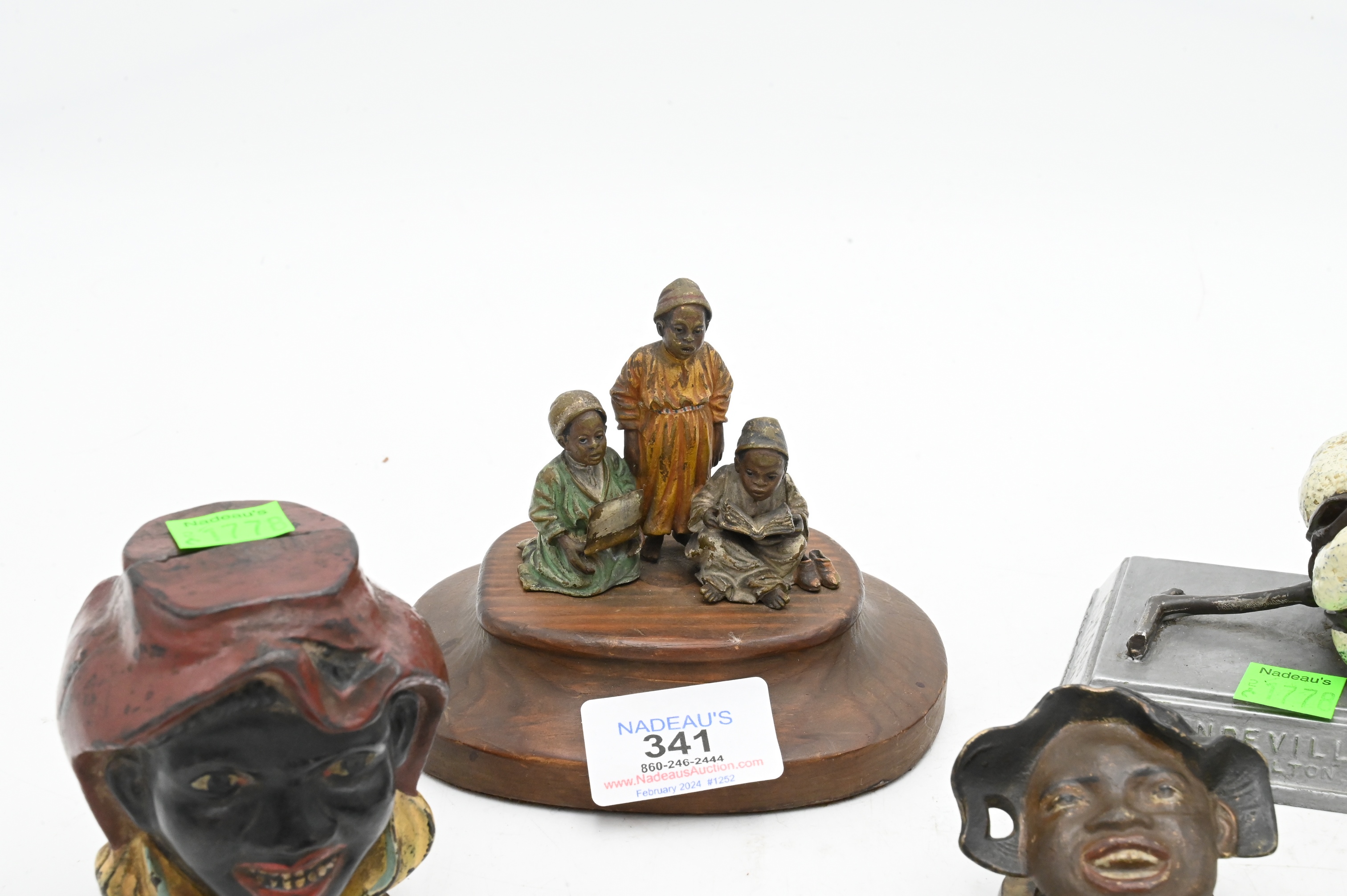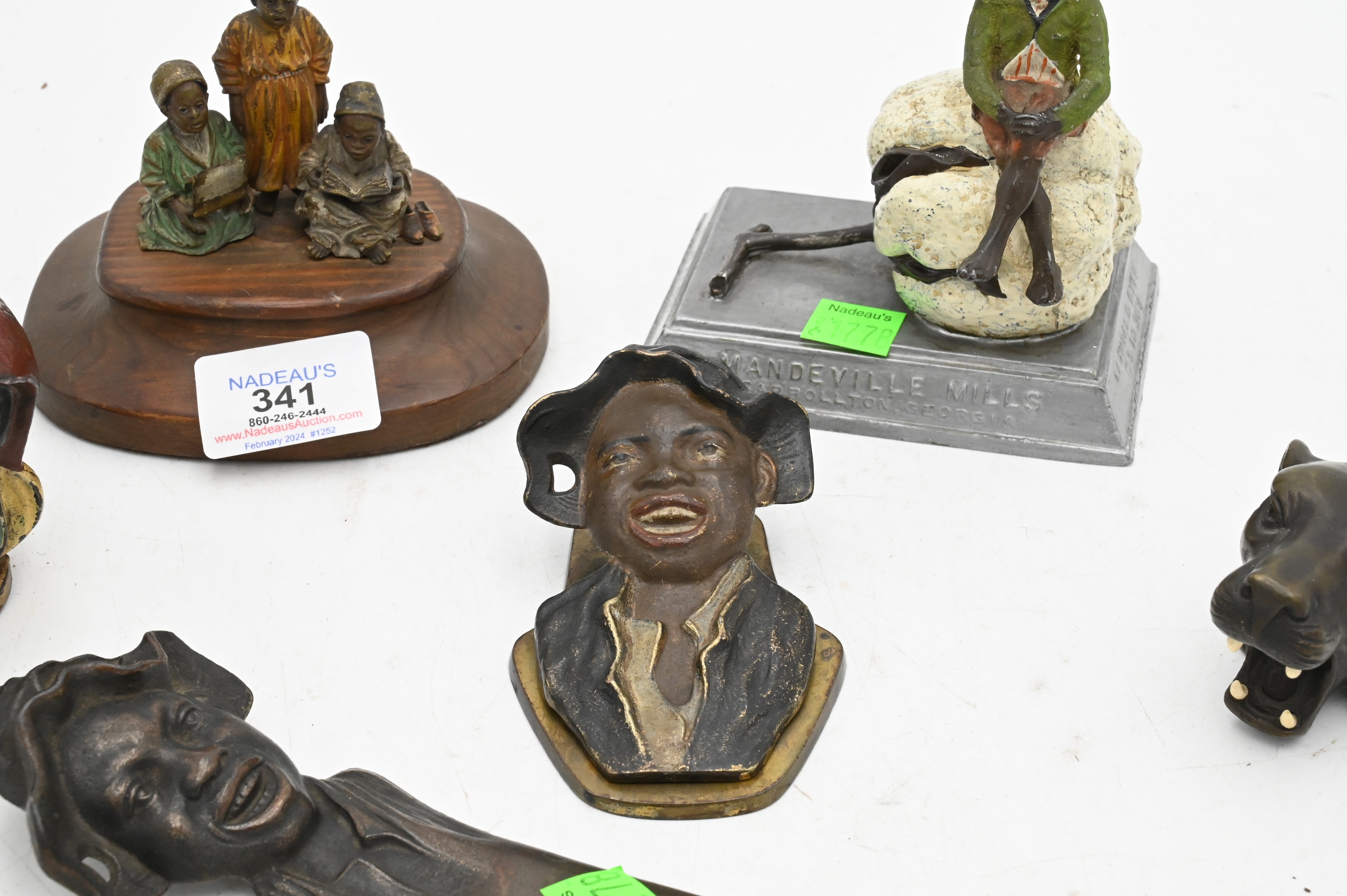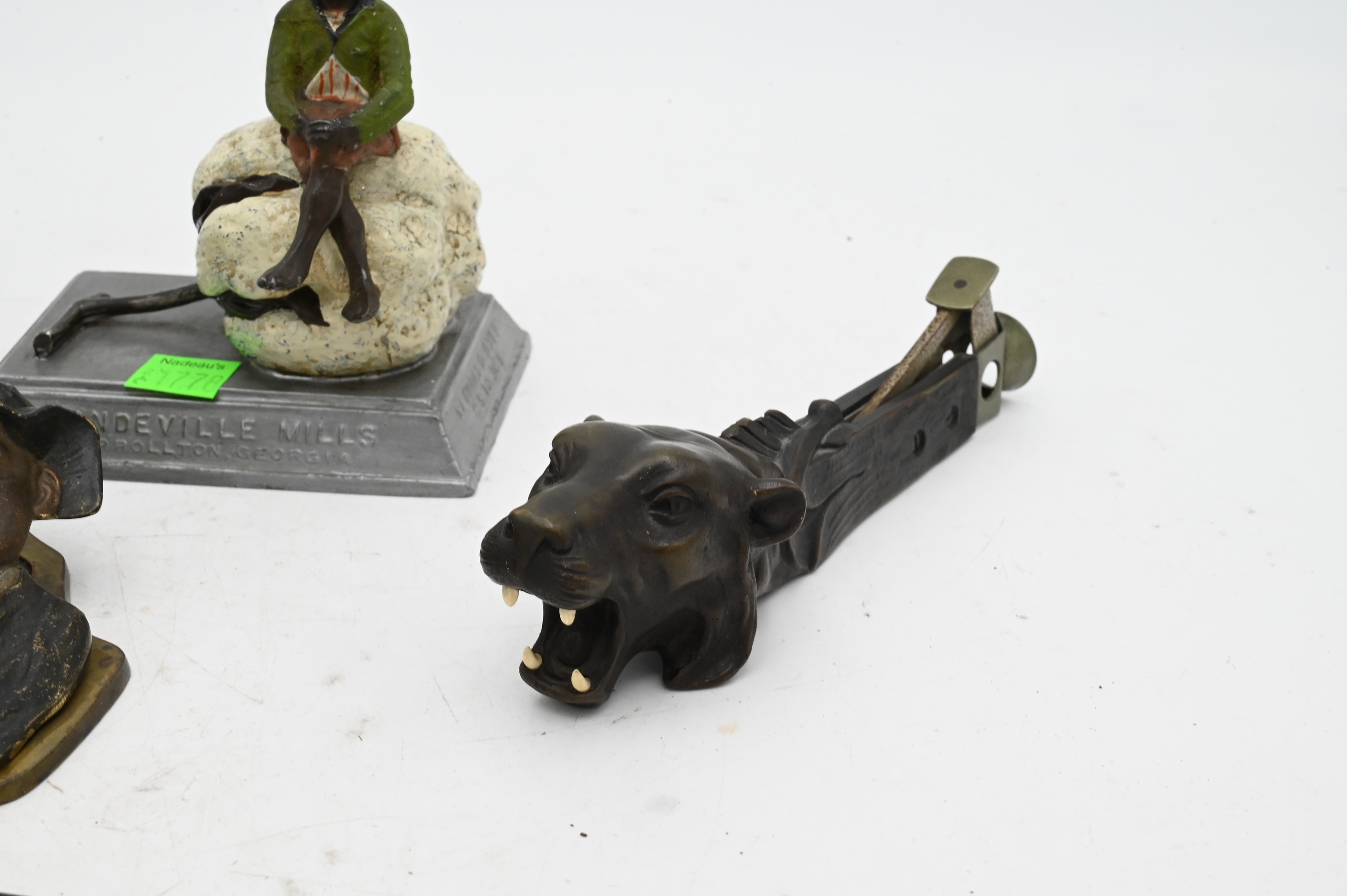 to include cast iron Black Bay letter opener, painted cast iron “Johnny Griffin” clip, A.C. Williams two face Black Bay cast iron bank, Reeves Brothers Mondevilles Mills Bay sitting on cotton advertisement, three Arab Boys reading after Franz Bergman (Austrian 1861-1936) cold painted bronze, bronze tiger cigar cutter