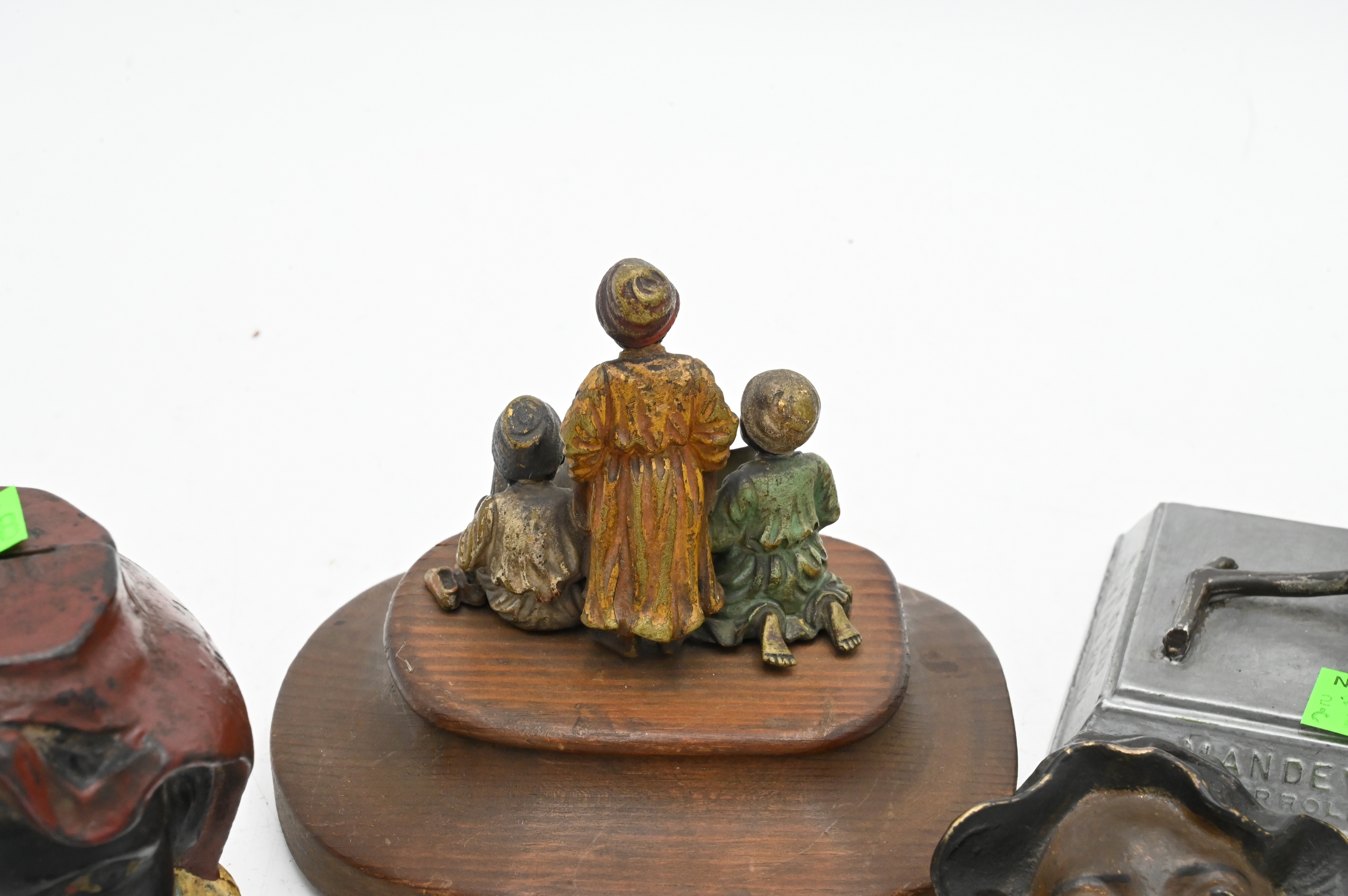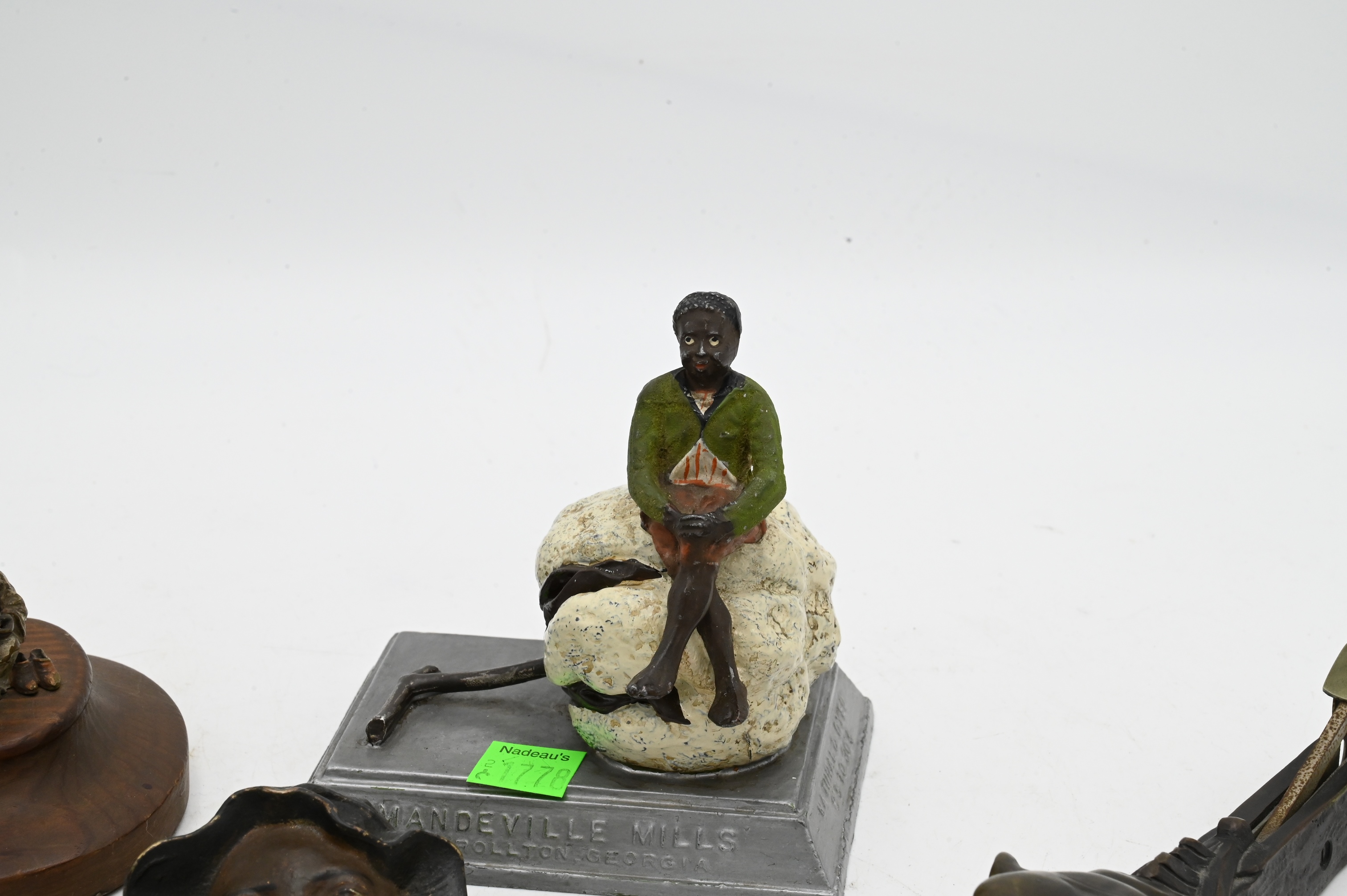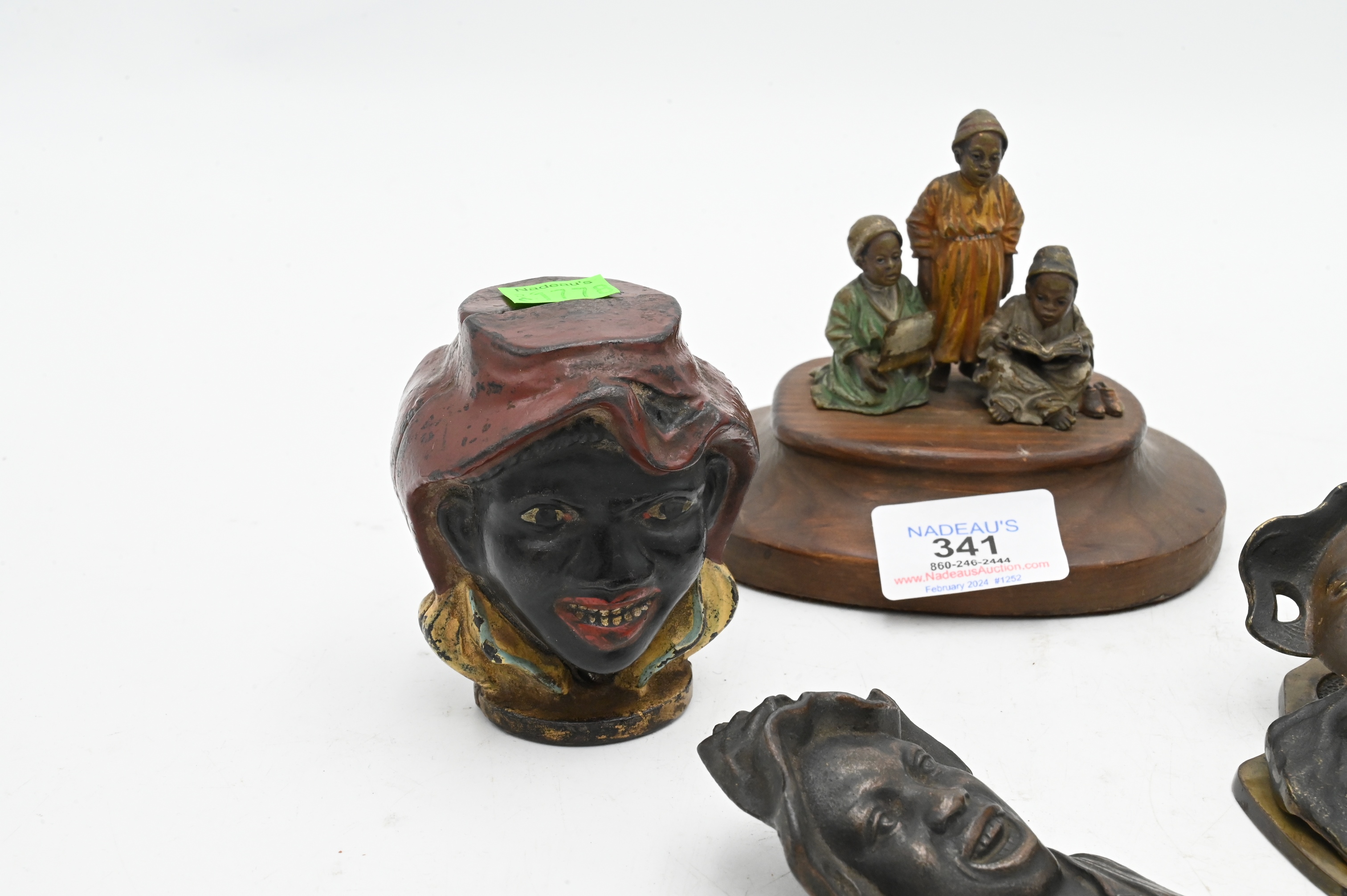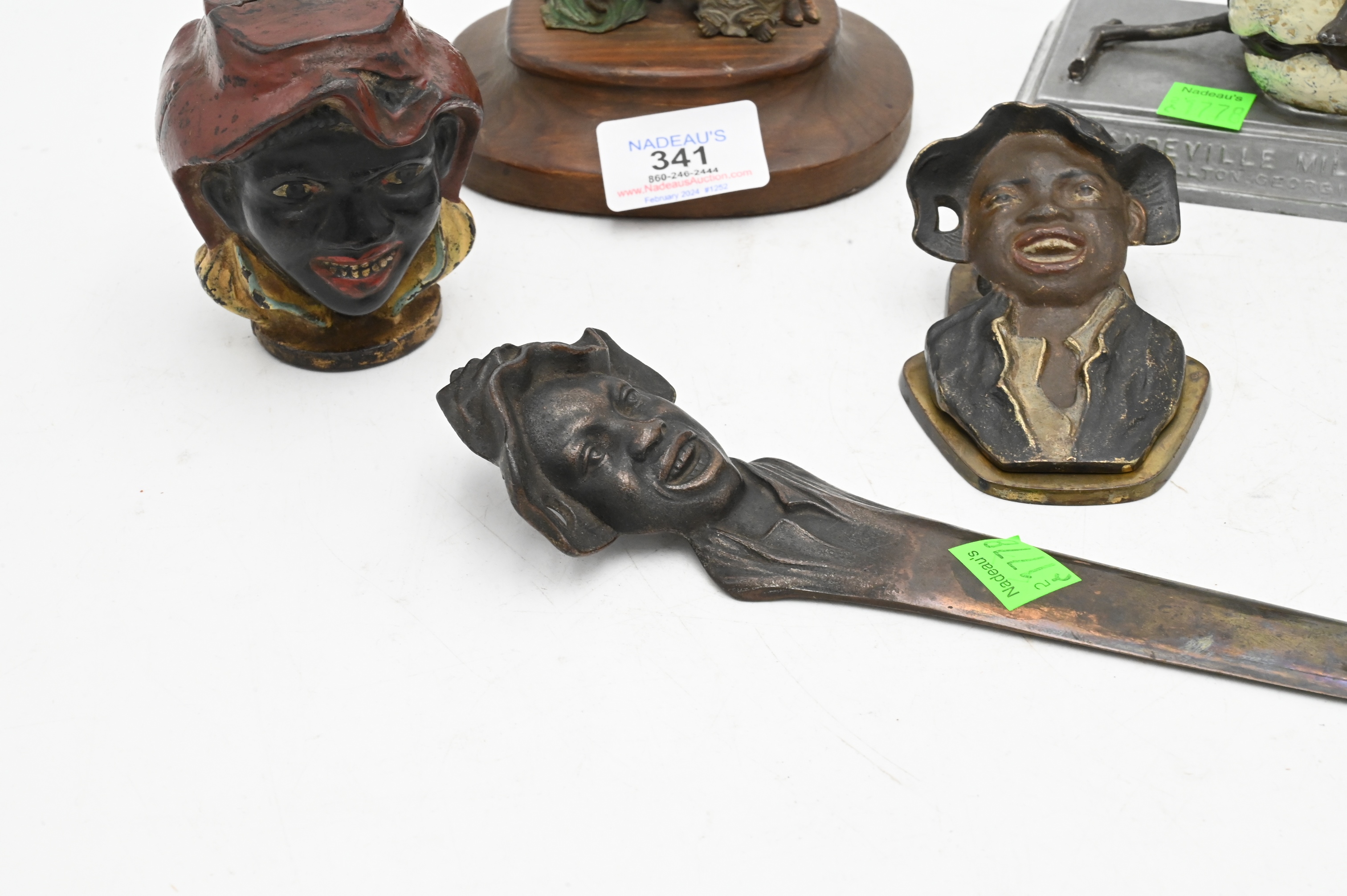 to include cast iron Black Bay letter opener, painted cast iron “Johnny Griffin” clip, A.C. Williams two face Black Bay cast iron bank, Reeves Brothers Mondevilles Mills Bay sitting on cotton advertisement, three Arab Boys reading after Franz Bergman (Austrian 1861-1936) cold painted bronze, bronze tiger cigar cutter