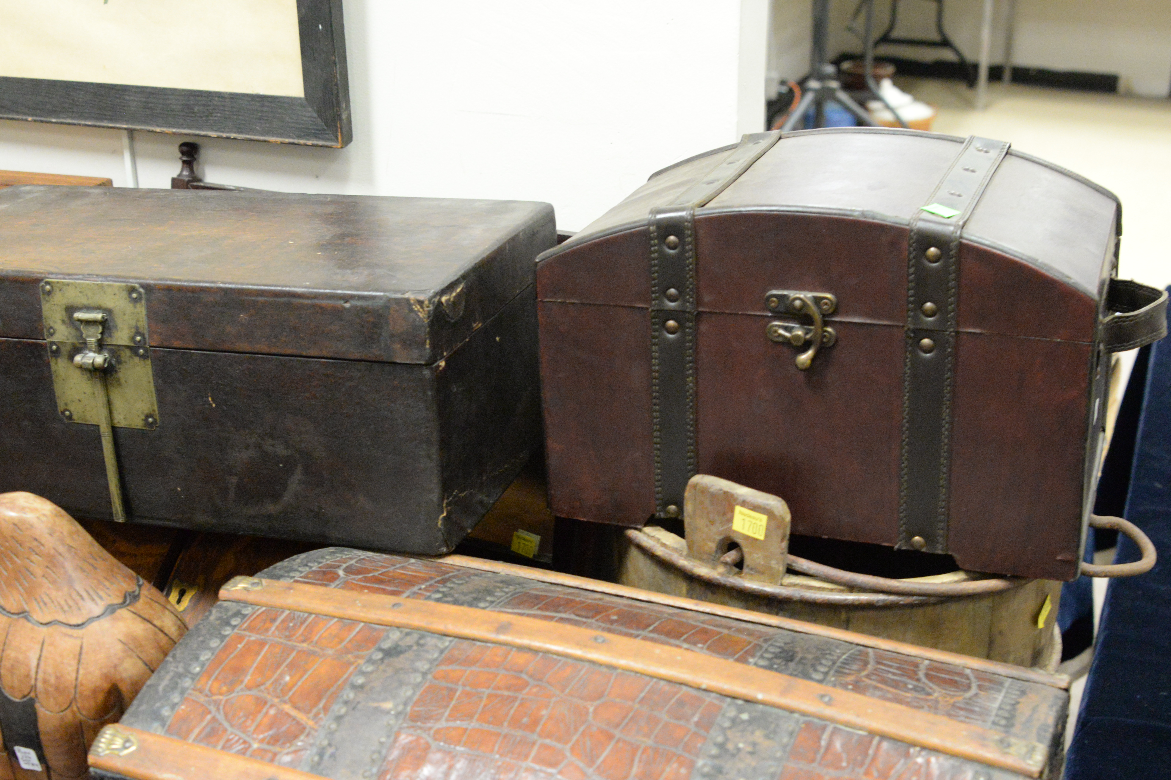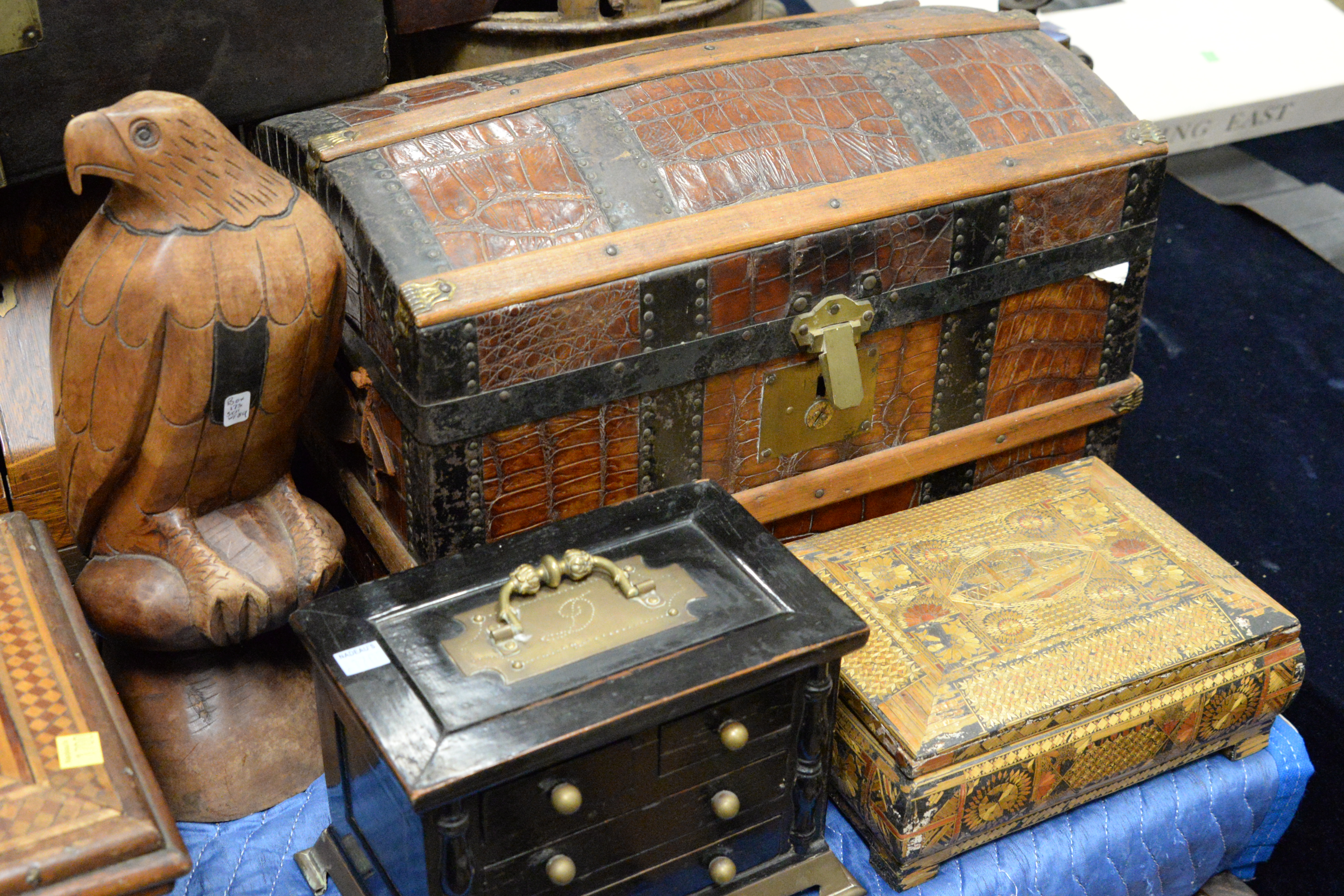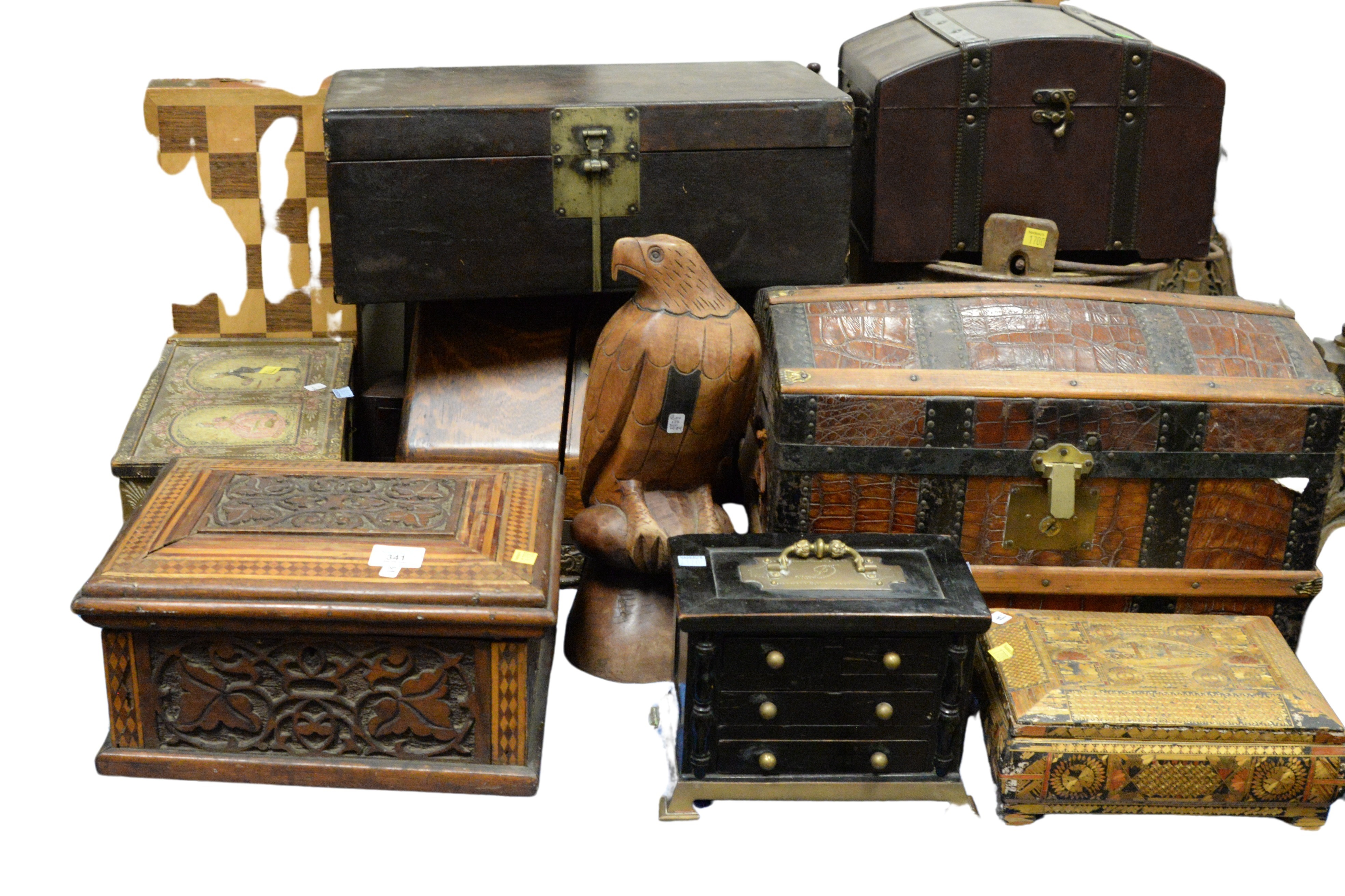 to include two inlaid decorative jewelry boxes, one painted box, chess board, wooden mirror over two drawers, carved eagle figure, alligator, skin chest, utensil box, faux alligator domed box, etc.
