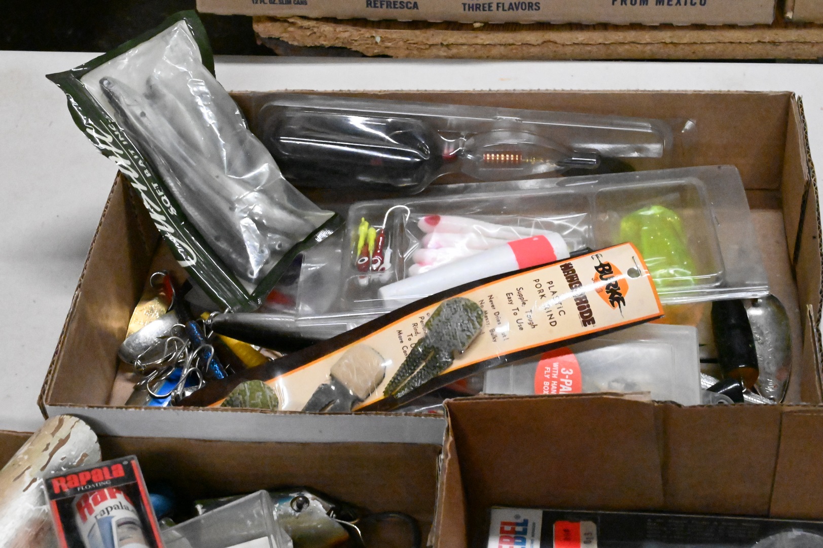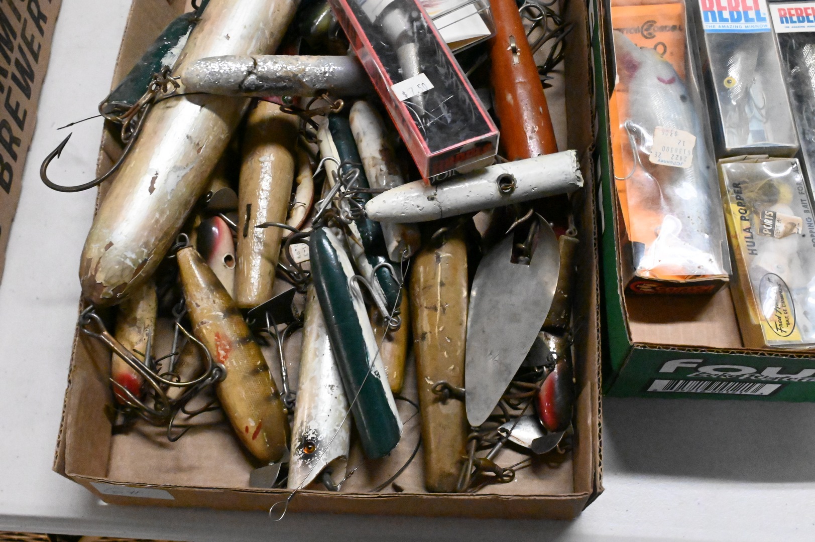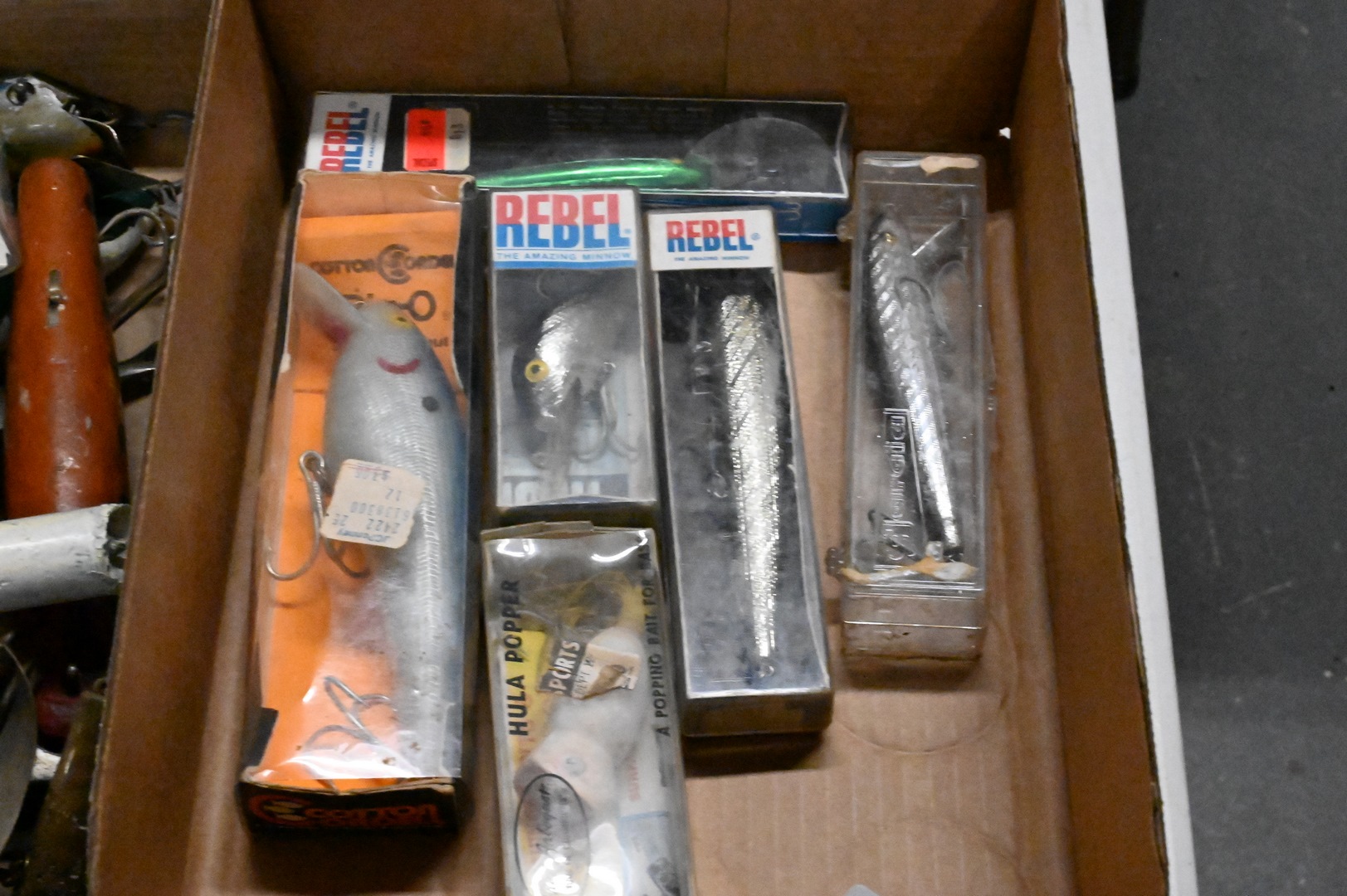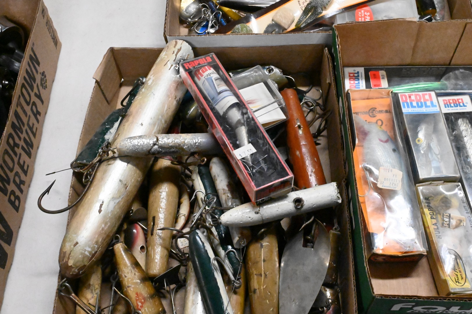 Three Box Lots of Fishing Lures and Various Bait, brands include Rebel, Burke, along with Rapala. Provenance: Estate of Peter Tillou, Litchfield, Connecticut.