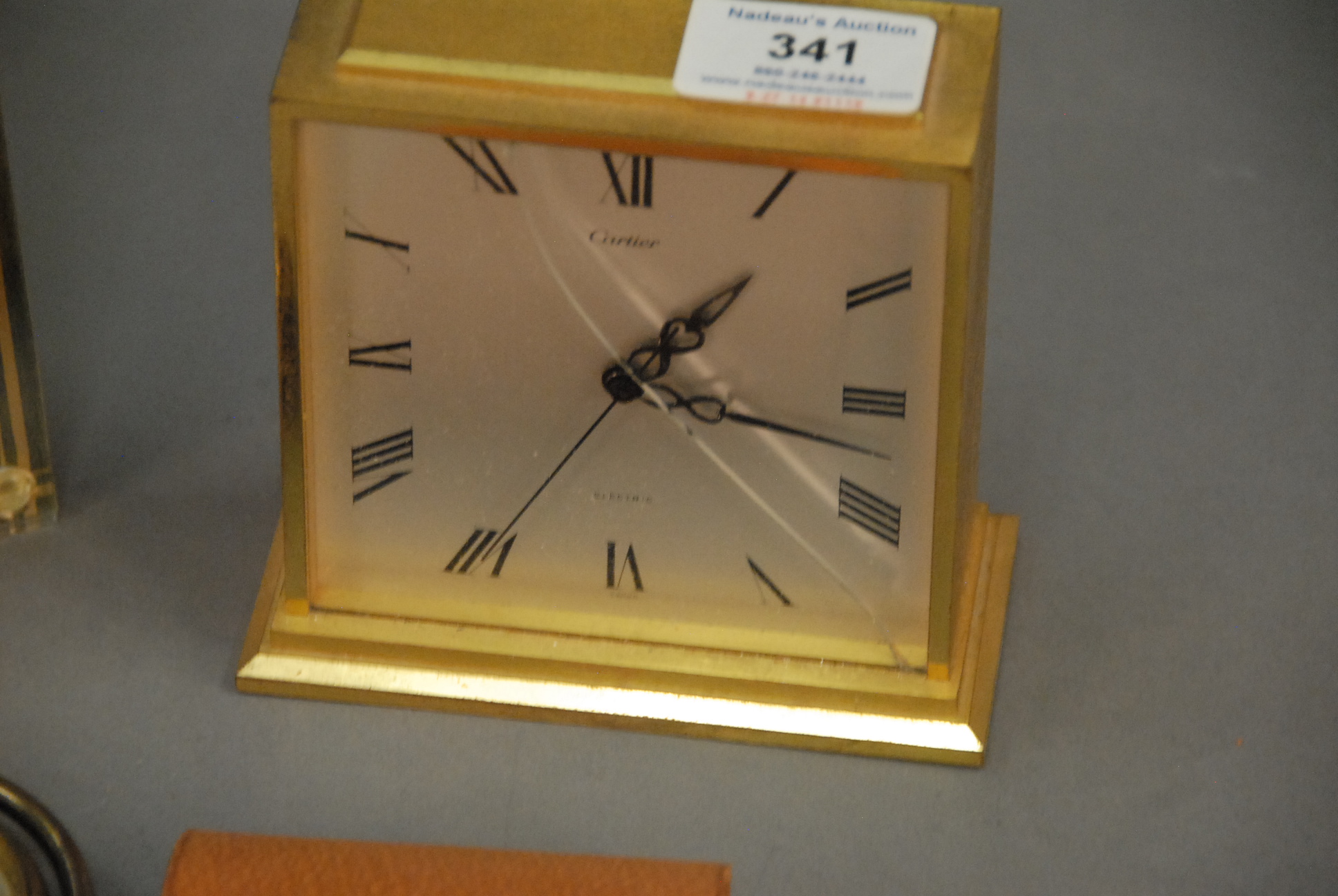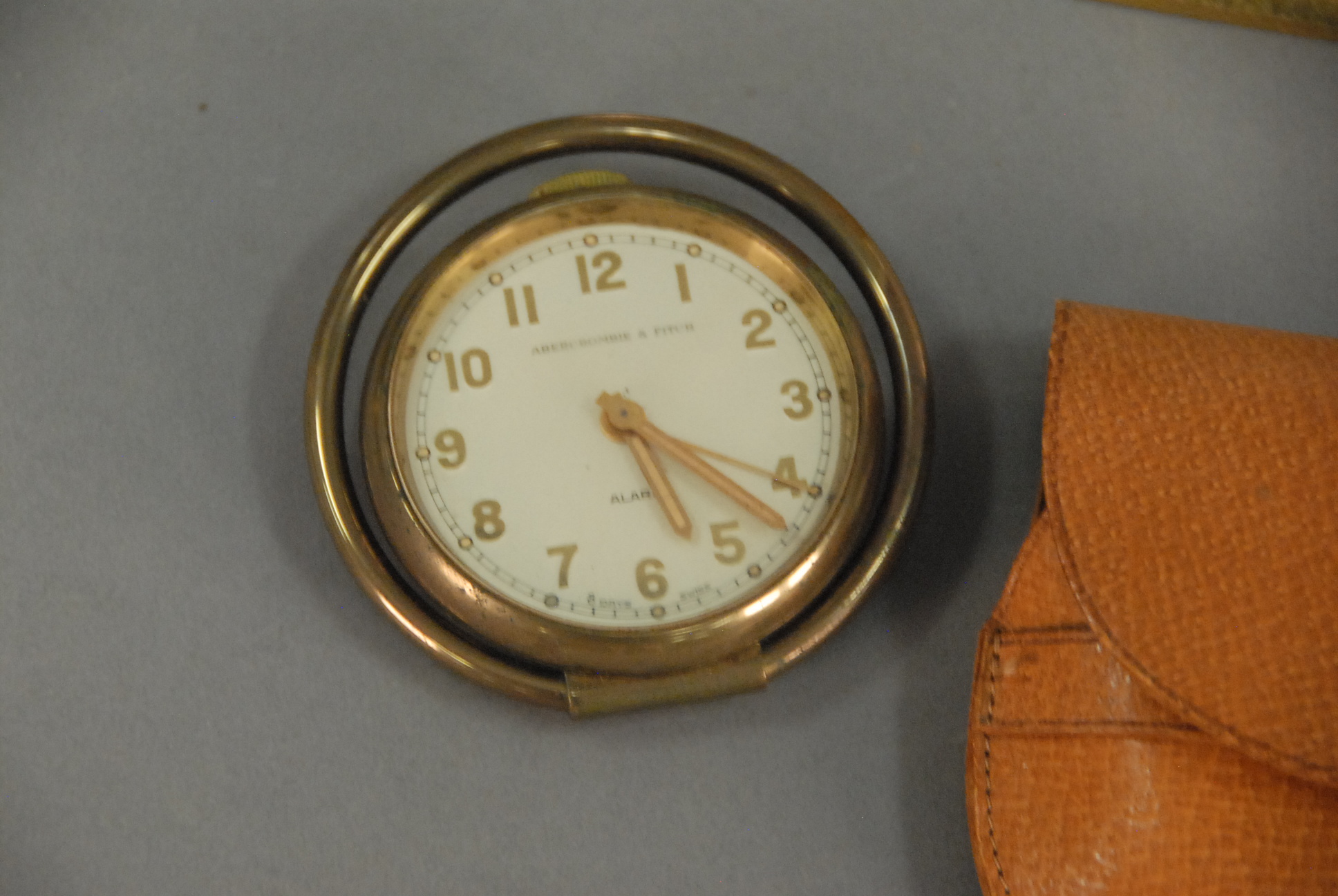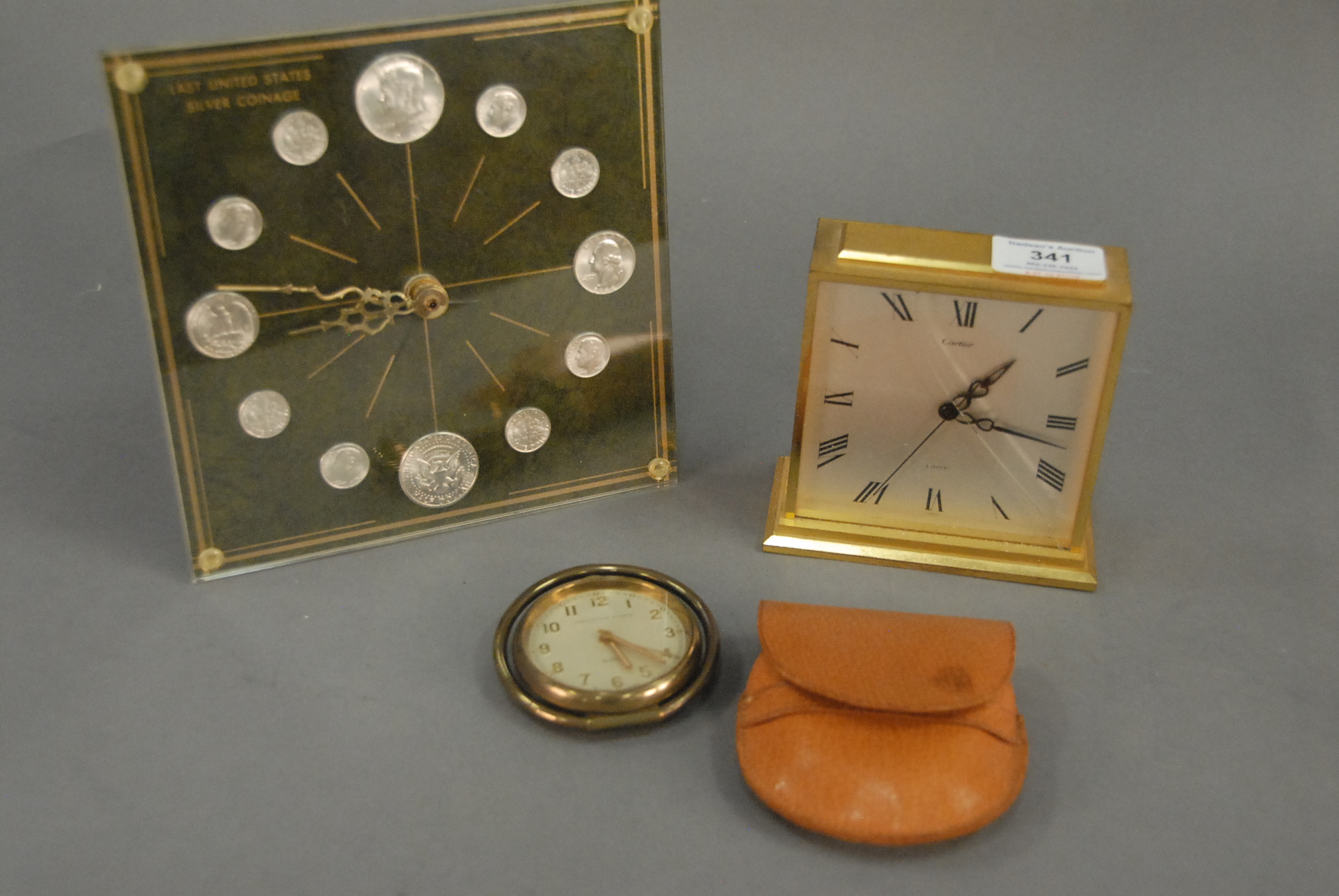 Three clocks including silver coin clock 1964 dimes, quarters, and Kennedy 1/2 dollars Cartier bronze clock and Abercrombie & Fitch travel clock.