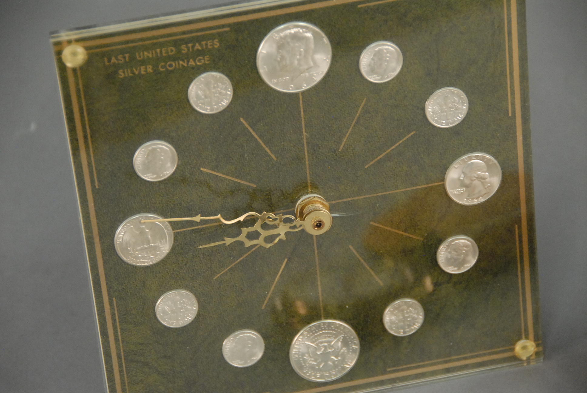 Lot 341: Three clocks including silver coin clock 1964 dimes, quarters, and Kennedy 1/2 dollars Cartier bronze clock and Abercrombie & Fitc…