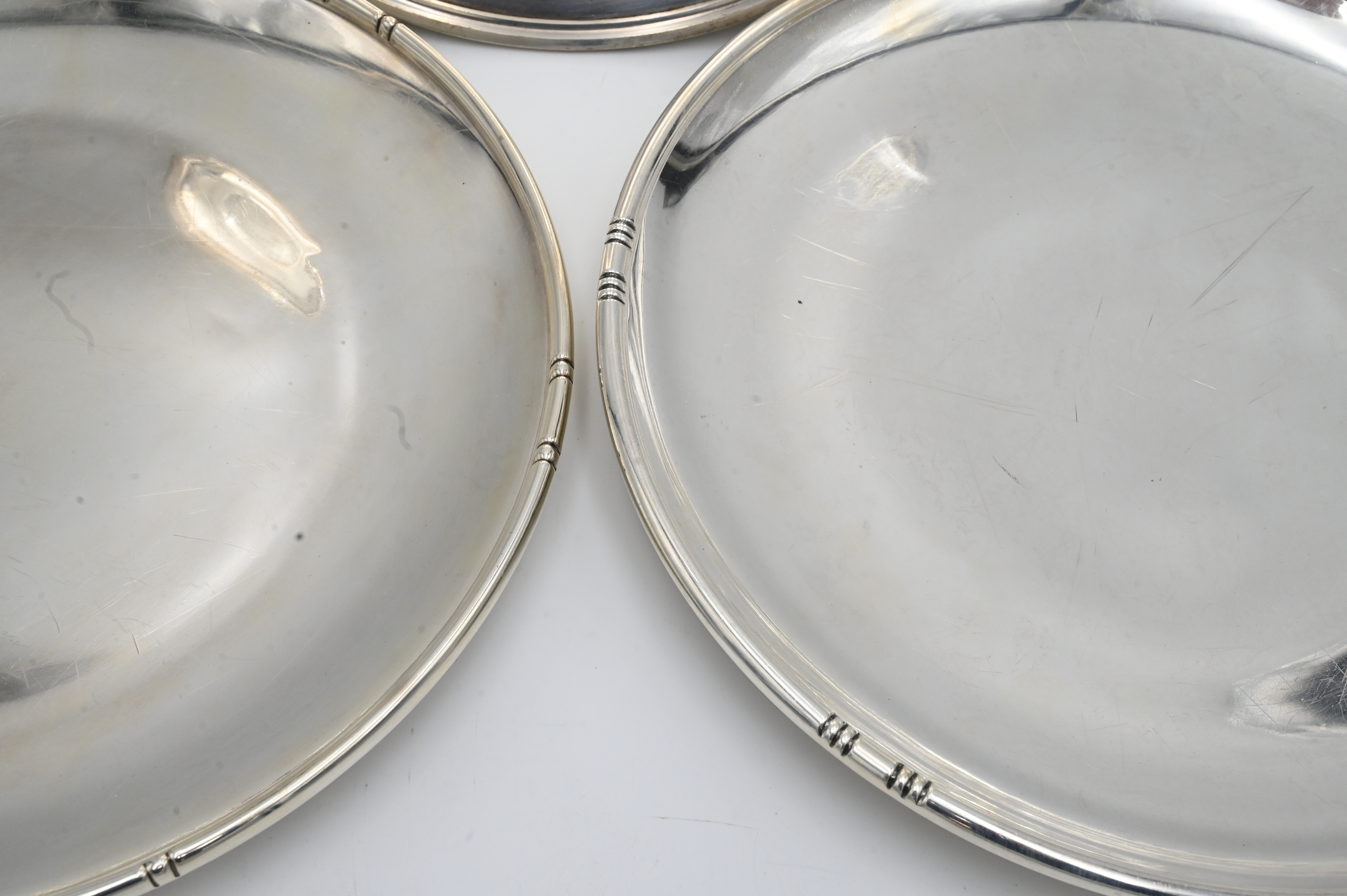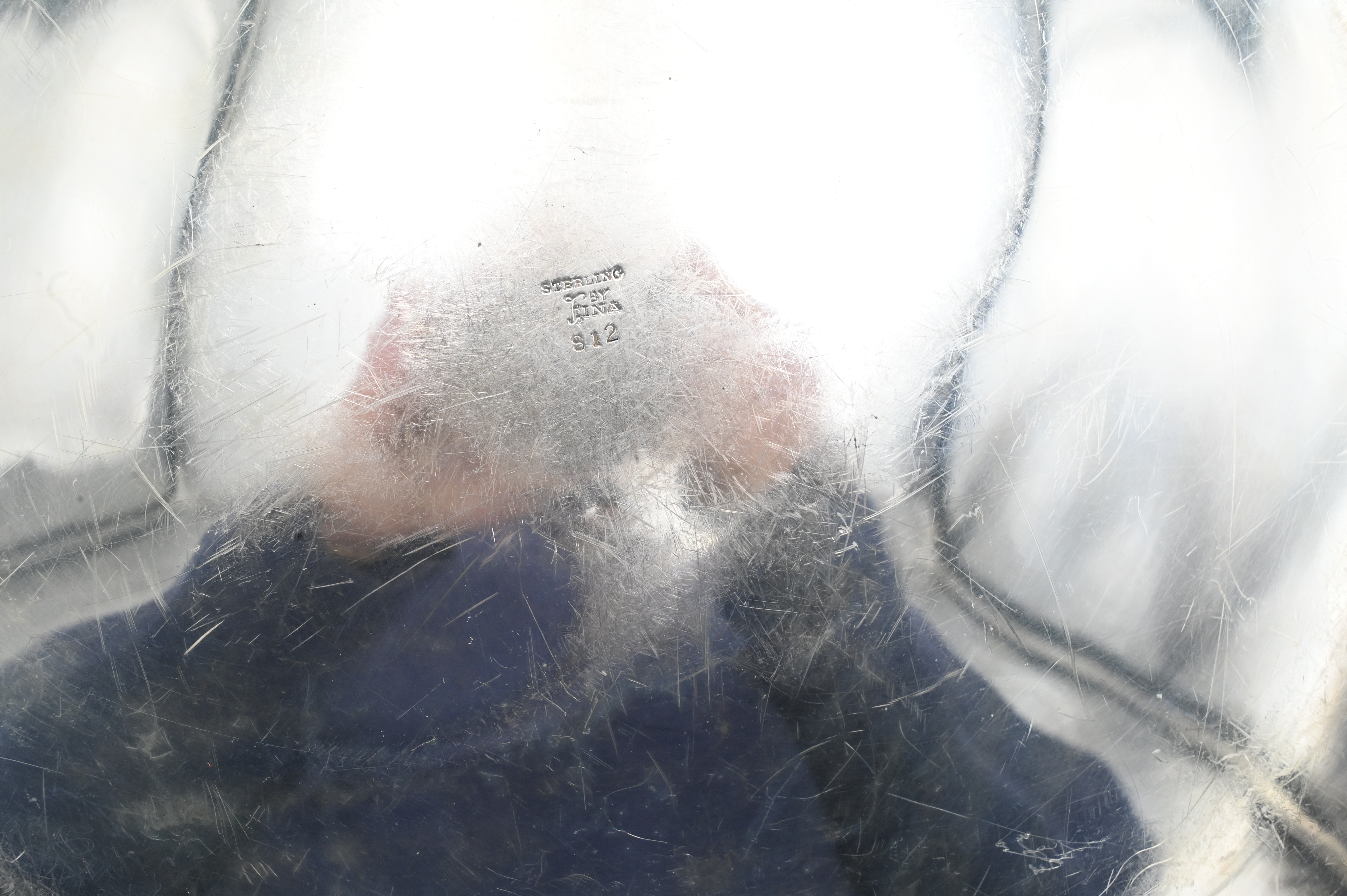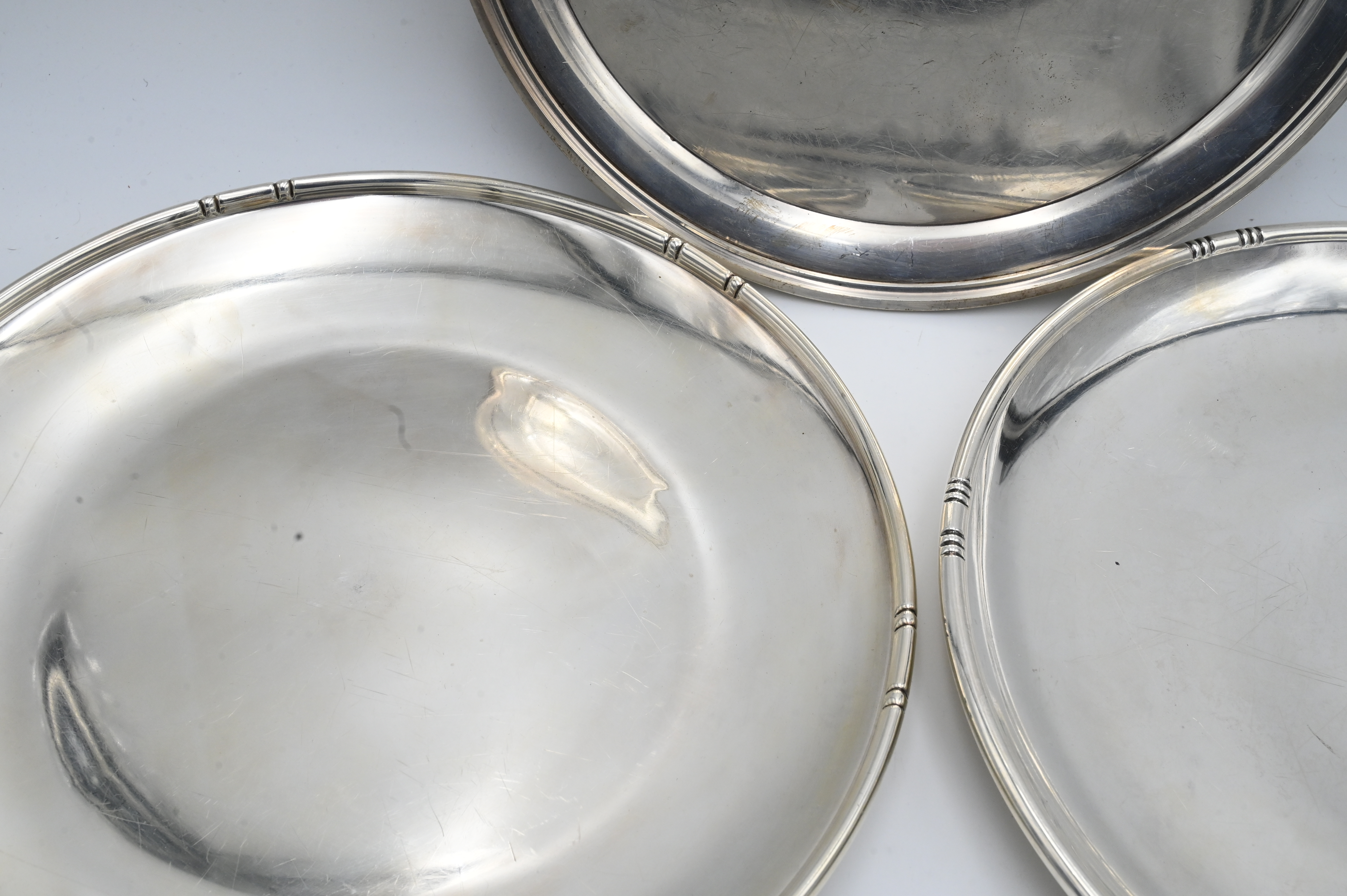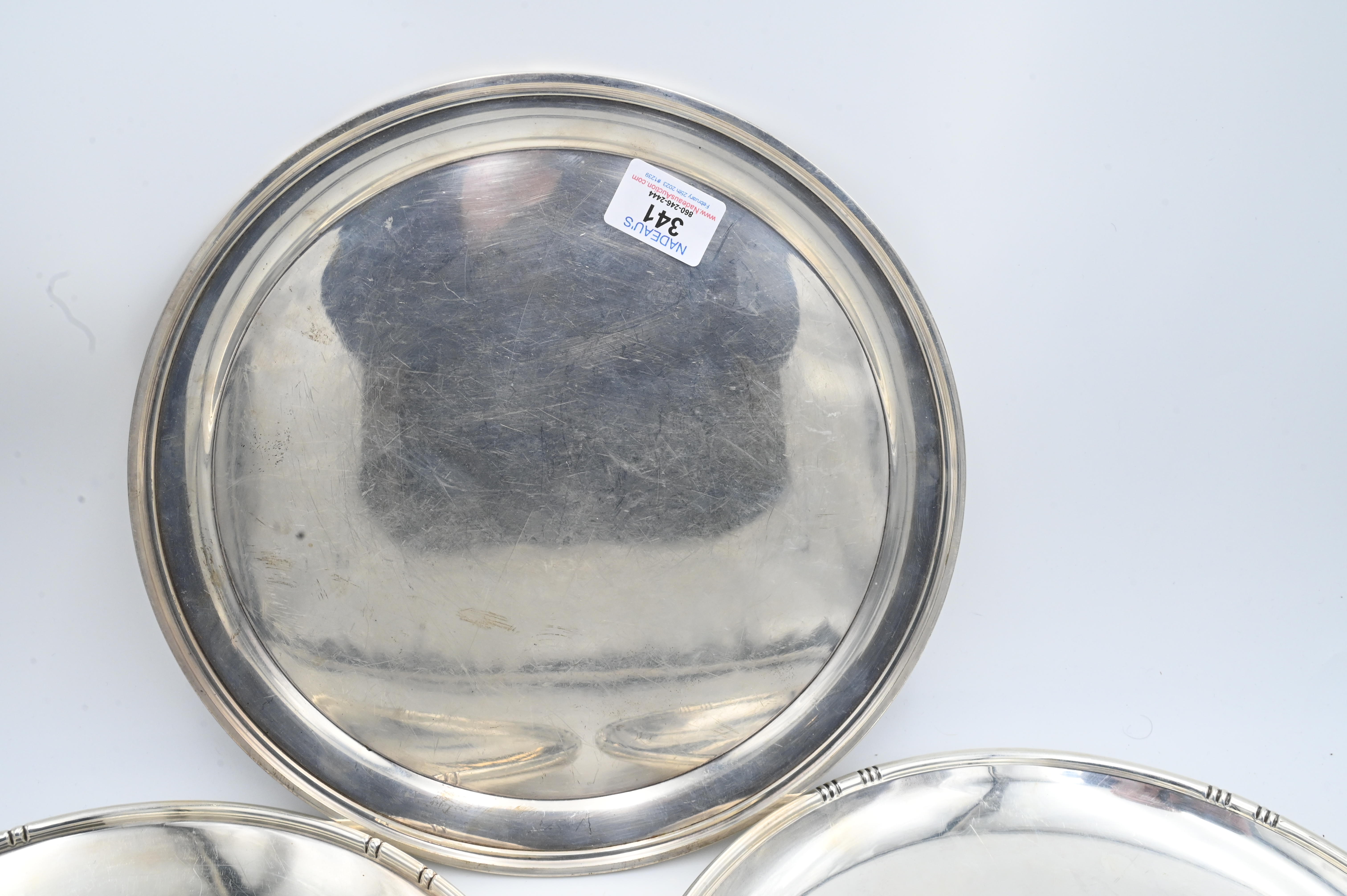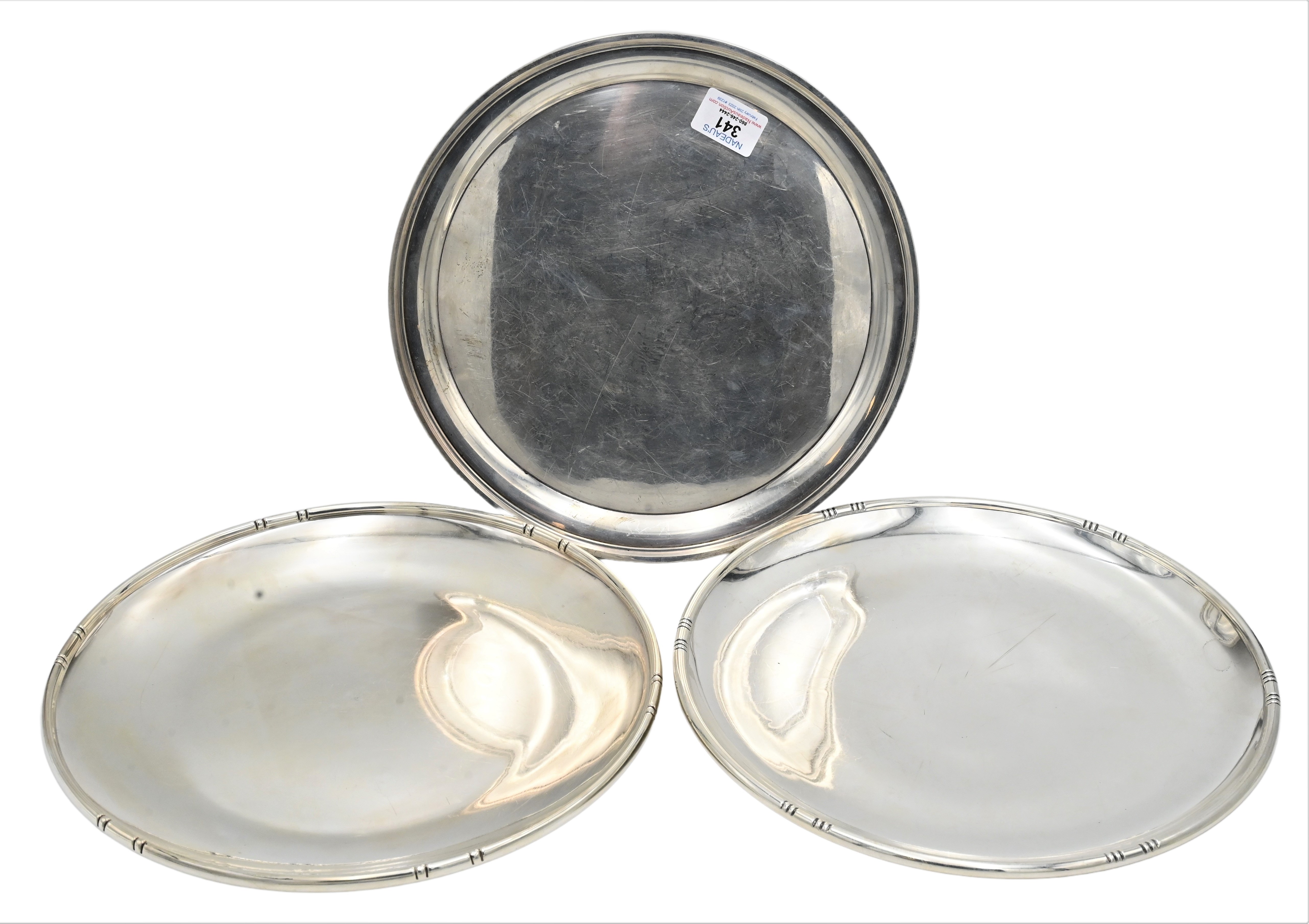 Three Round Sterling Silver Trays, marked S. Kirk & Son Sterling by Fina, along with B&M Sterling ‘Bamboo’ pattern, largest in diameter 12 1/2 inches, 57.3 t.oz.
